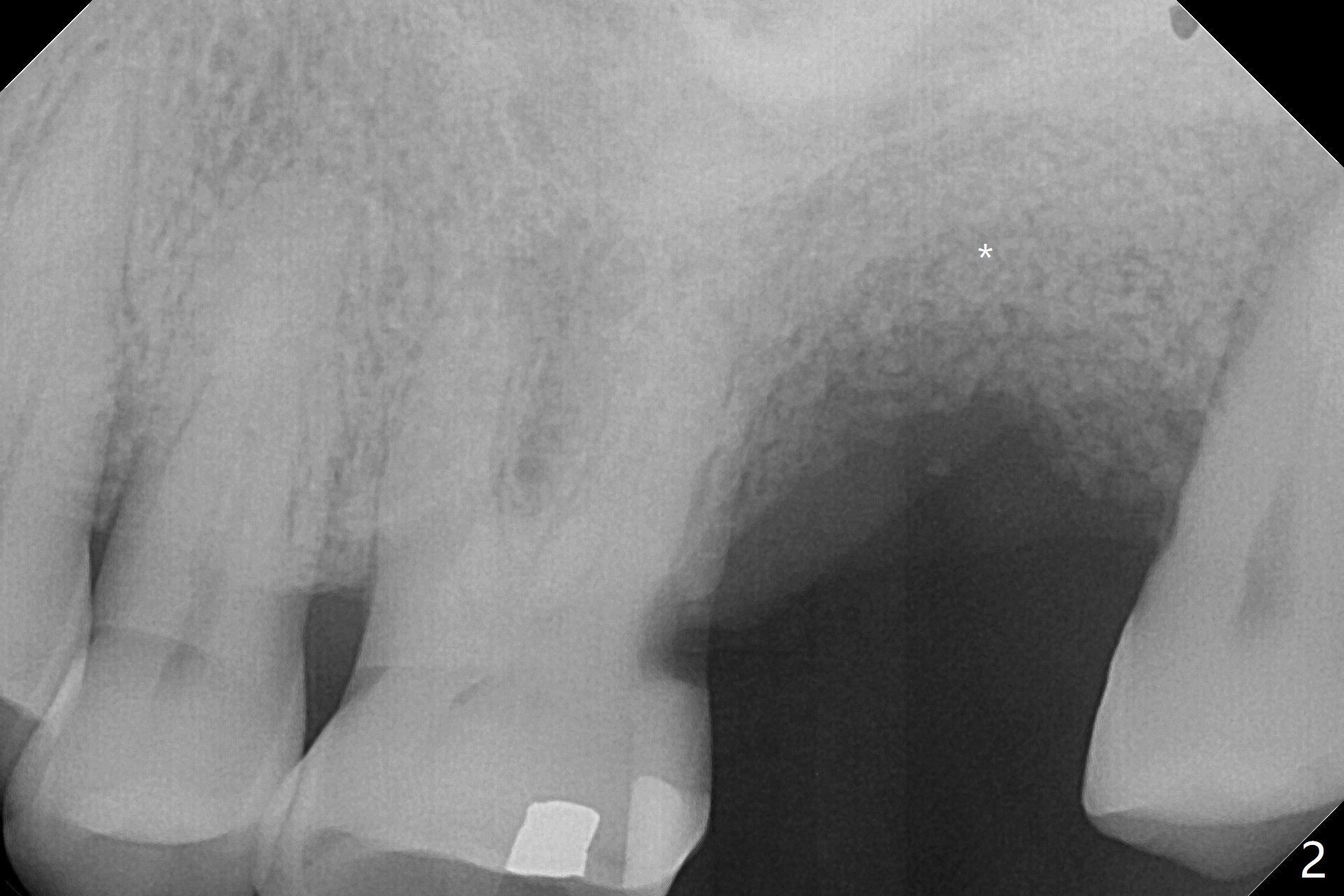 A 60-year-old woman has had an immediate implant placed at #15 with endo-perio disease. The crown dislodges with abutment and implant mobility <4 years post cementation (Fig.1). There is loss of the distopalatal walls post implant removal. Sticky bone is placed post debridement (Fig.2: *). After PRF and (difficult) PGA suturing, acrylic dressing is applied.