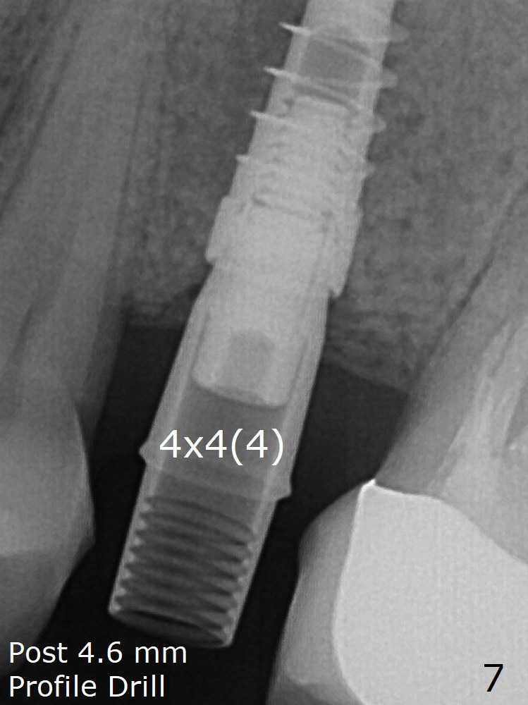 When a narrower abutment with longer cuff is placed at #15, there is no gap between the implant and abutment. In contrast there is one at #13 (Fig.6 <) when a 4x4(4) mm abutment is seated following removal of a healing abutment. After use of a 4.6 mm profile drill, the gap disappears (Fig.7). Impression is taken.