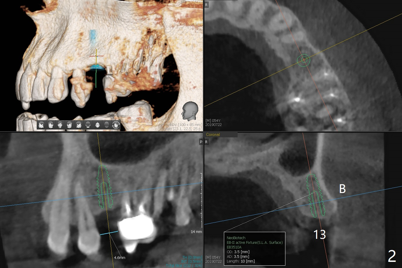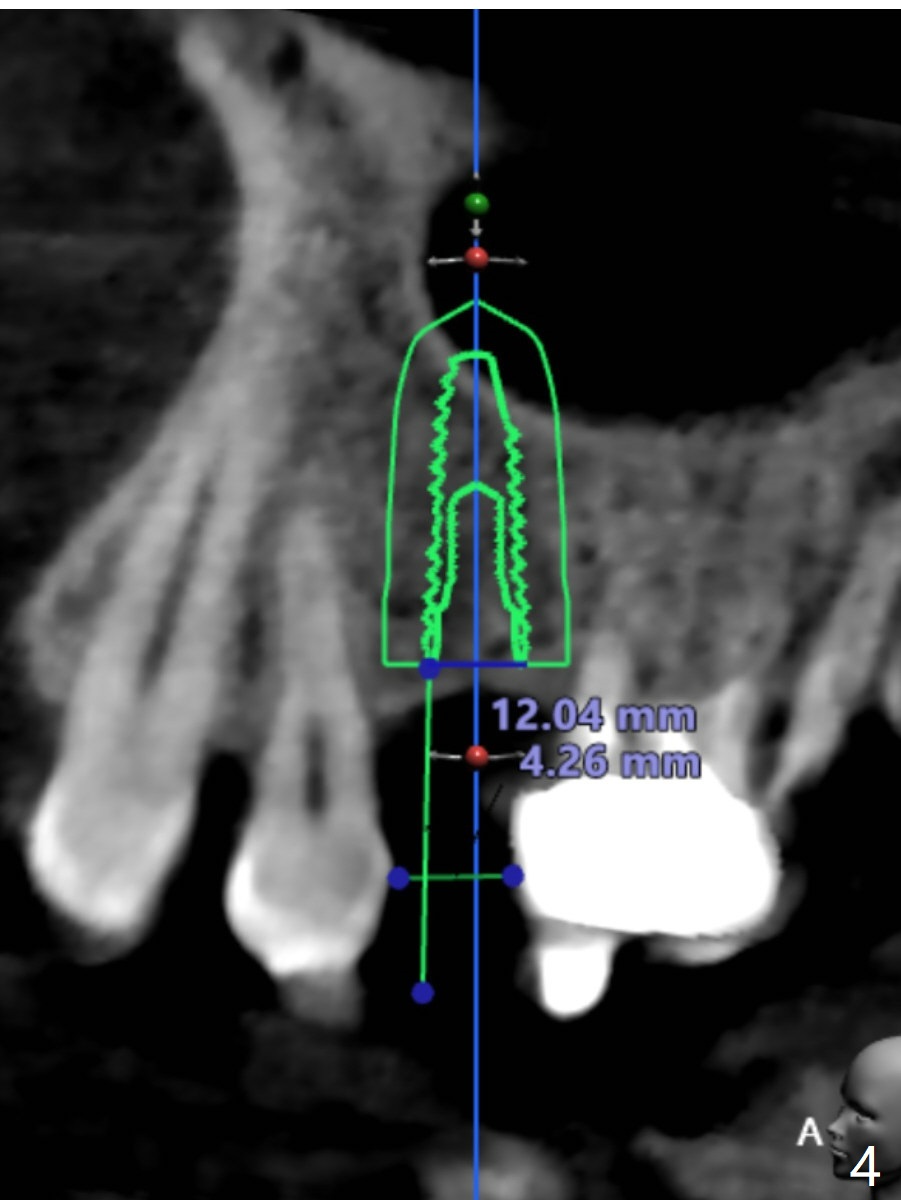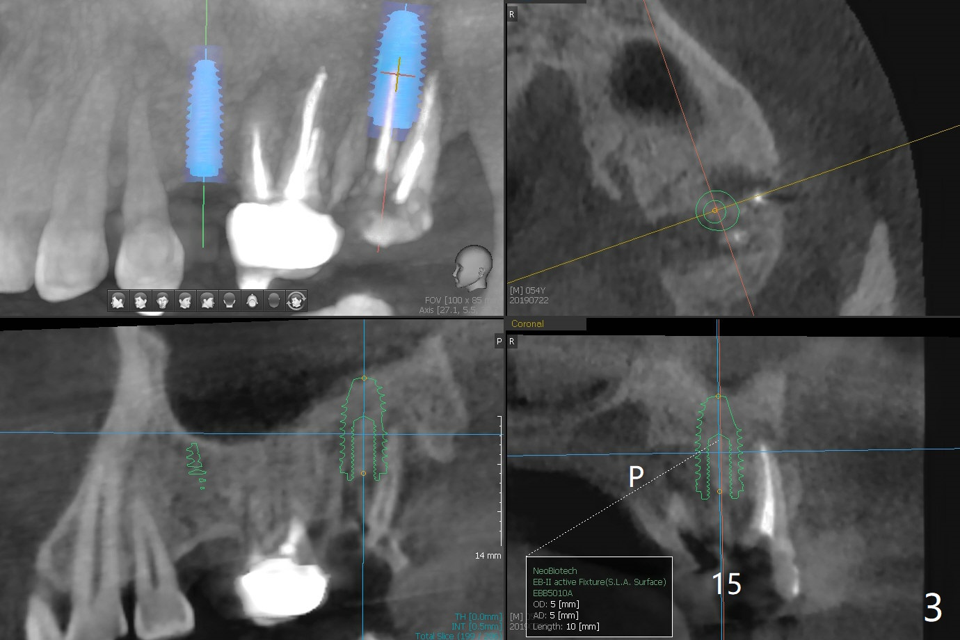 A 54-year-old man has lost a crown at #15 due to root fracture. The latter is associated with bruxism and missing #13. He agrees to have 2 implants and limited ortho to increase the space at #13. In fact the space increases by proximal reduction before CT and impression for guide (Fig.1). The space is enough for a narrow metal sleeve (Fig.4). To prove that abutment screw loosening is most likely related to implant trajectory, IBS implants (with history of easy screw loosening) will be placed with the help of IS guide. PRF will be prepared (x2), one for sinus lift and the other for palatal plate repair. Take photos for palatal fistula.