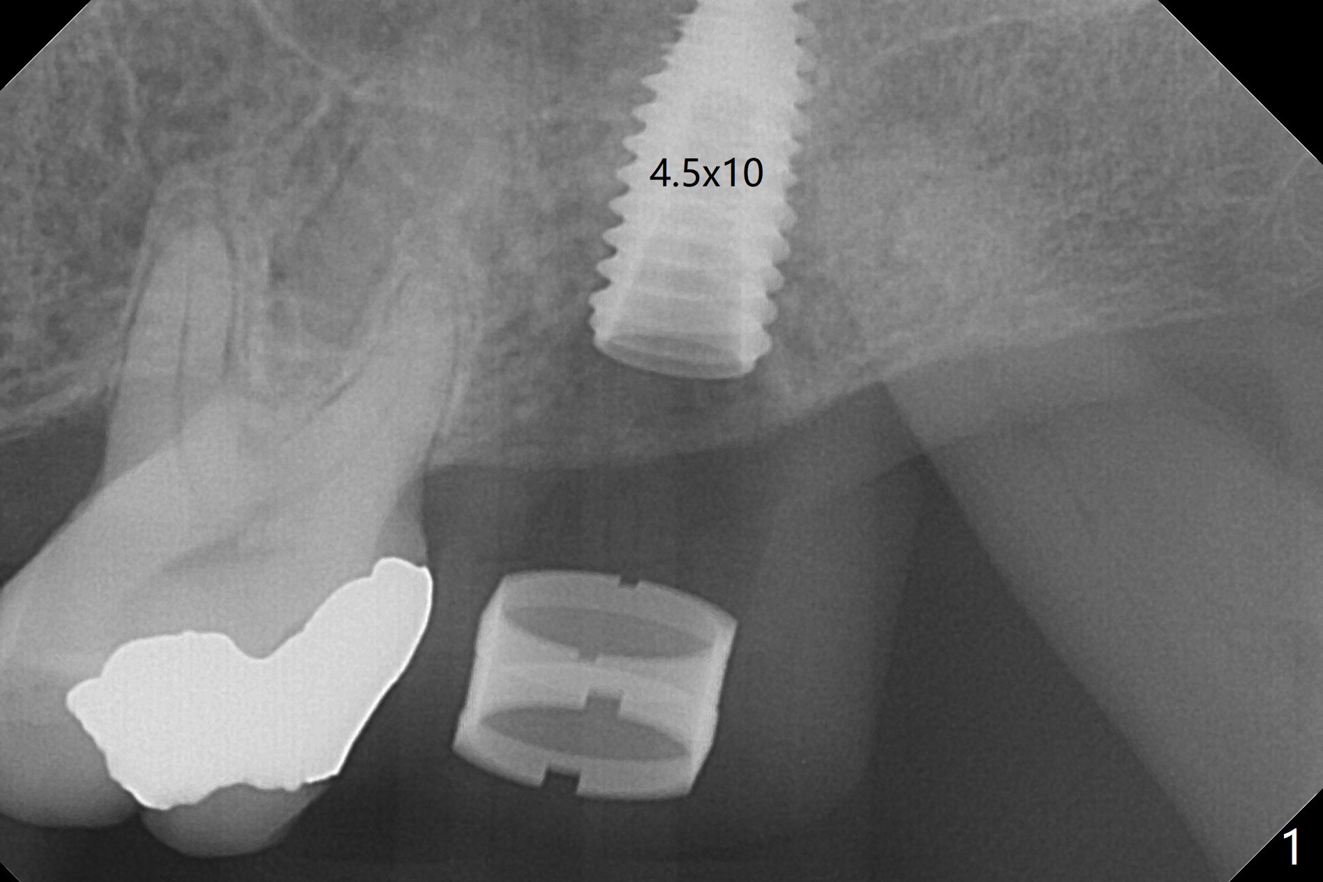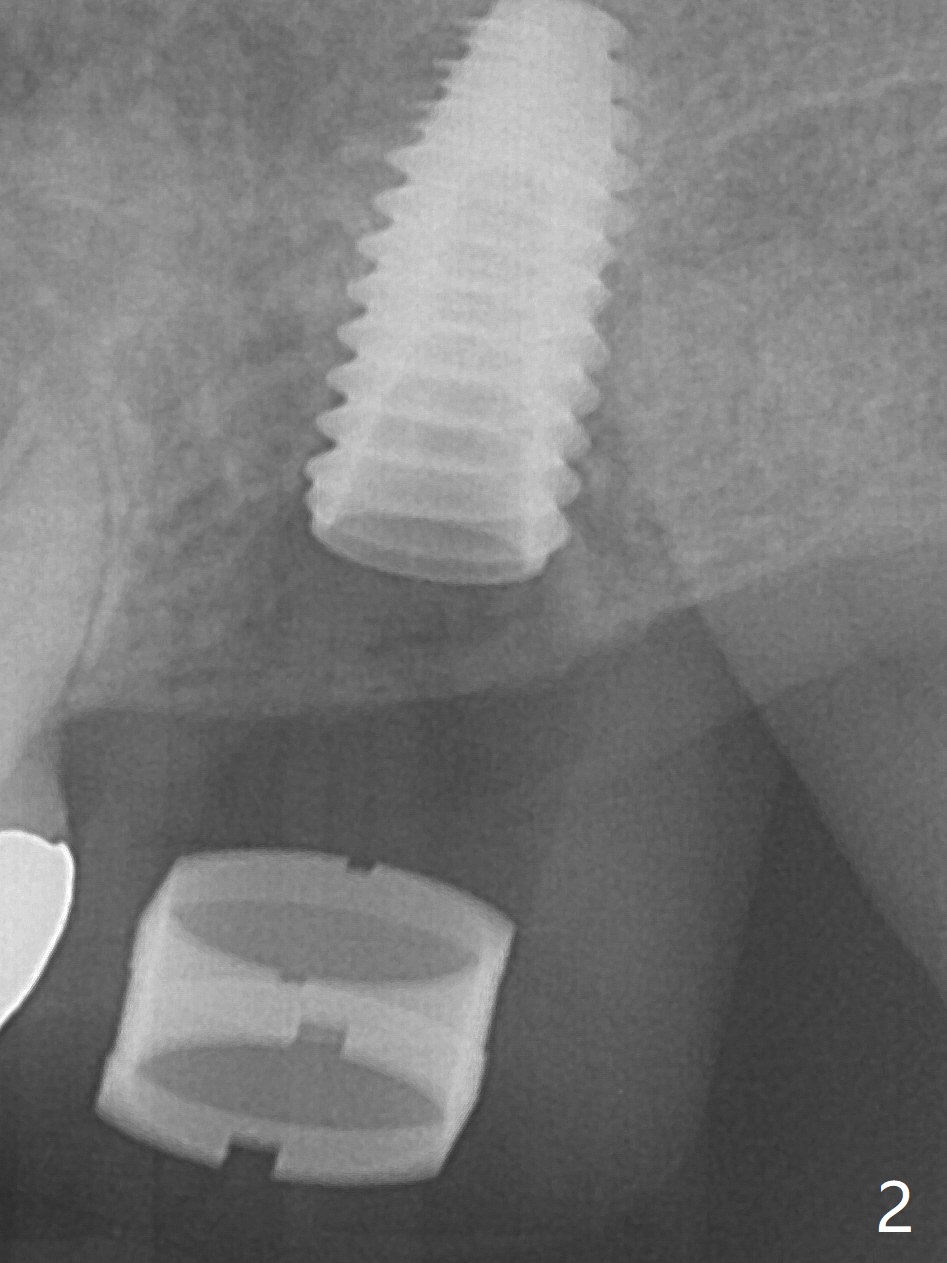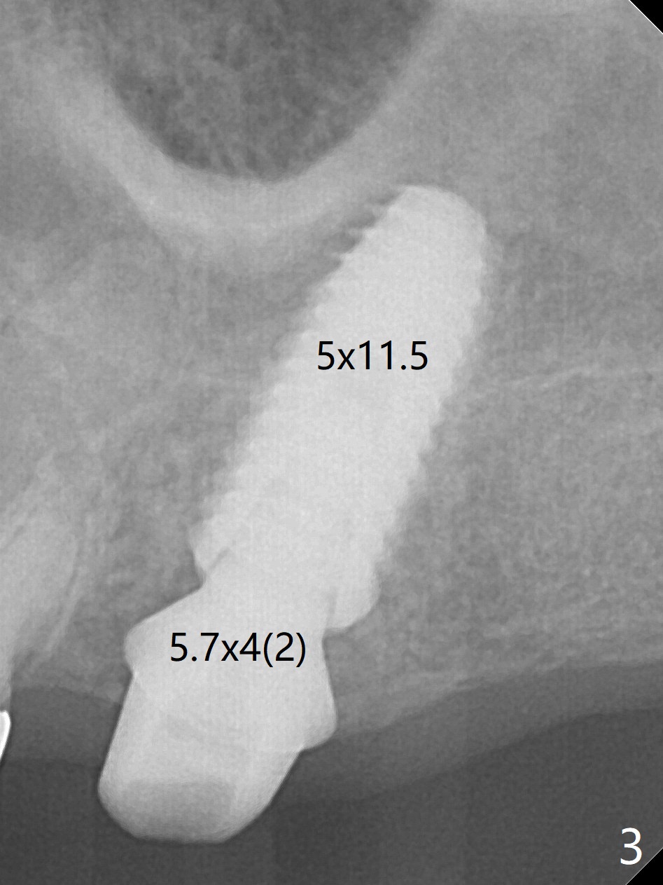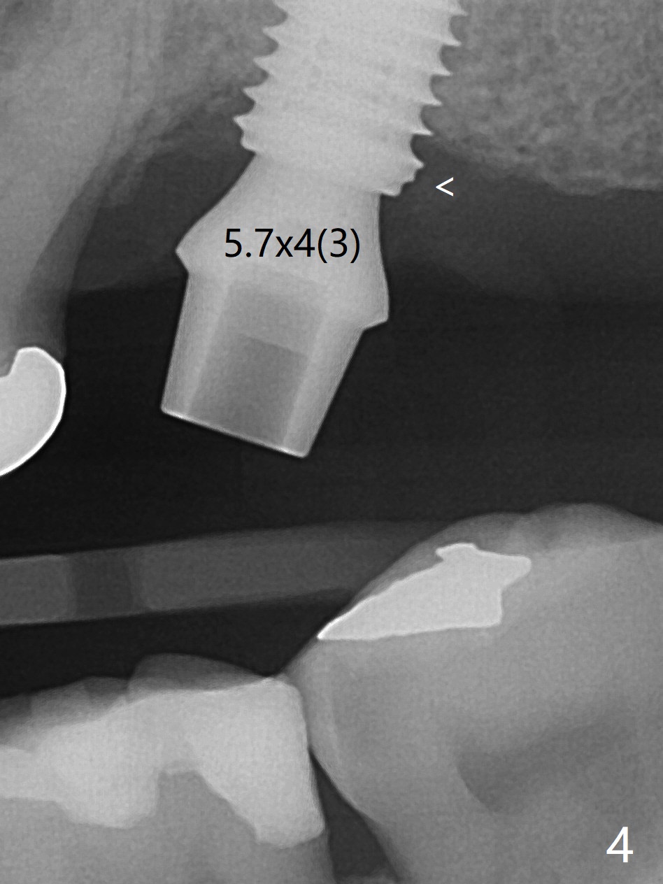 After extraction at #15 with 9 mm offset, a 12 mm bone trimmer is used to create a dimple in the septum. When a 4x7.3 mm drill is done according to drill sequence, initial osteotomy has no palatal wall. A 4.5x10 mm dummy implant cannot engage for sinus lift. DIO Sinus Approaching drill cannot enter IS green metal sleeve. When a 4x8.5 mm drill is finished, the sinus floor is intact. This is not the case when a 2.2x10 mm drill is used. Water membrane lifter does not seal the osteotomy (palatal defect). The 4.5x10 mm dummy implant is used for sinus lift, followed by 2-3 Amalgam carriers of allograft lifted with the same implant (Fig.1,2). After 4x10 mm drill and 2-3 carriers of Vanilla graft, a 5x11.5 mm implant is placed >55 Ncm with immediate placement of a 5.7x4(2) mm abutment (Fig.3). With sticky bone and 2 pieces of PRF in the remaining socket, an immediate provisional is fabricated and seated. When the patient returns for impression nearly 6 months postop, she feels mild pain. In fact the temporary crown/abutment is loose and traps food underneath with the erythematous gingival cuff. A 5.7x4(3) mm abutment is placed and torqued without gap for impression (no temp); the implant threads are exposed distal (Fig.4 <). Retrospectively, the incompletely seated cemented abutment should be tightened ~ 1 month postop when the socket heals.