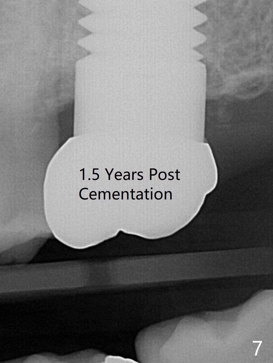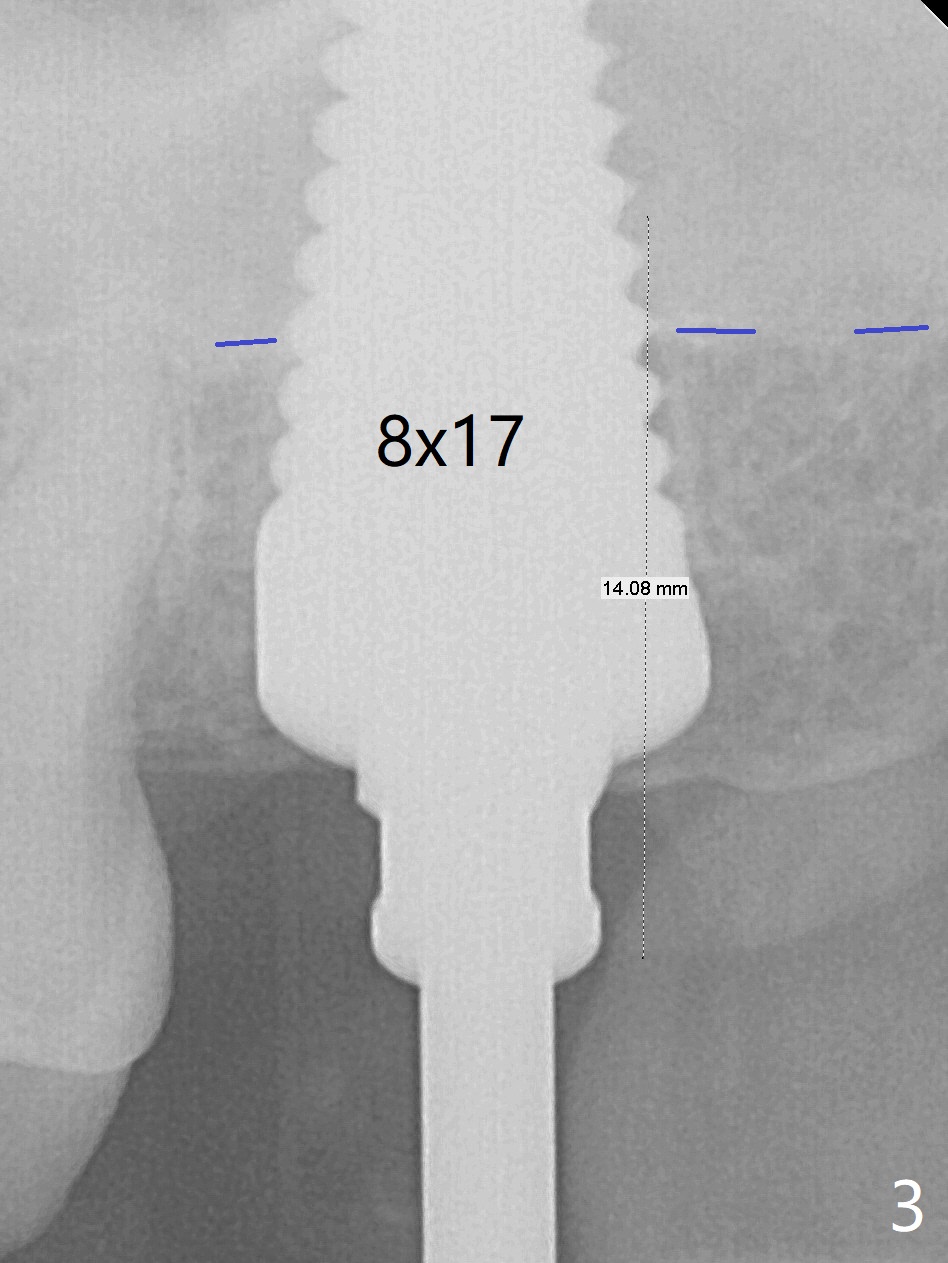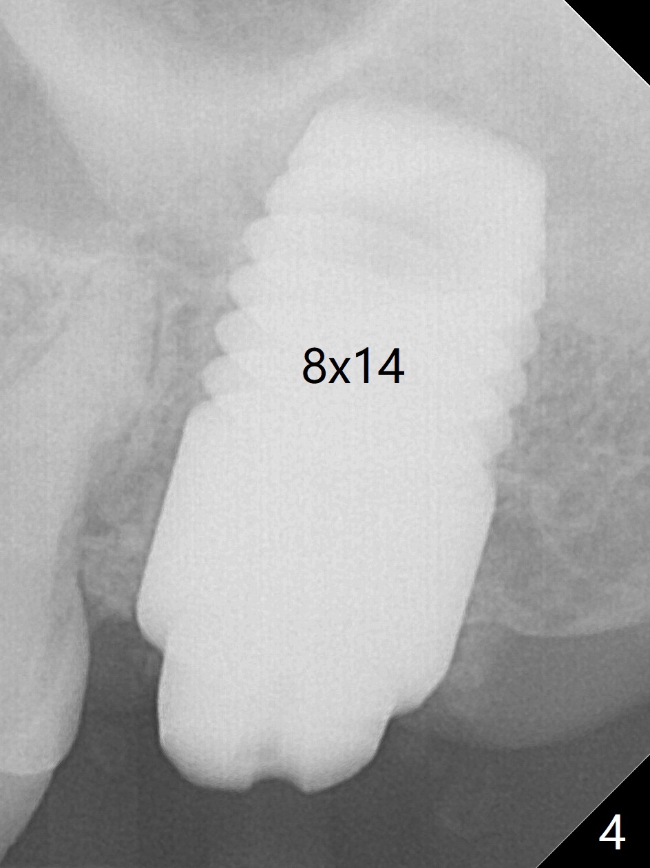 Initially the patient is reluctant to have the crack tooth extracted (Fig.1). Blood drawing for PRF fails. After extraction, the septum is confirmed to be short and thin. The bone density is moderate. When a 3.5 mm drill is being used, the osteotomy perforates into the mesiobuccal socket. A 5x10 mm IS implant achieves minimal stability. As 5.5, 6.0 and 7.0 mm cortical taps are inserted, primary stability is not obtained, as more bone is being removed at the level of the septum. When a 7x17 mm Tatum tapered tap is placed, it looks too small for the socket, as confirmed by measurement of a preop PA (Fig.2). Chronic infection associated with crack syndrome for 2 years may cause bone loss of the socket walls. Since the primary stability of a 8x17 mm tapered tap is not high (Fig.3), a 8x14 mm cylindrical implant is placed (after try in of its dummy one) with > 50 Ncm (Fig.4). The implant engages into the mesial and distal socket walls for stability. A 6x3 mm abutment is placed for an immediate provisional. In spite of difficult manipulation, the sinus membrane remains intact. Vanilla graft is placed for sinus lift and buccal and palatal gaps. Since IS implants are more or less cylindrical and if a 5 mm one does not achieve primary stability, a larger Tatum tapered tap should be tried immediately without using IS cylindrical taps. The patient returns 3 months postop, requesting early restoration before a trip to home country. The provisional has occlusal perforation. Final restoration is cemented nearly 4 months postop (Fig.5,6). The large implant makes the early restoration possible. However there is bleeding on probing palatal 1.5 years post cementation (Fig.7), suggesting palatal thread exposure. Return to Upper Molar Immediate Implant, Prevent Molar Periimplantitis (Protocols, Table), Armaments 6 Xin Wei, DDS, PhD, MS 1st edition 05/07/2018, last revision 05/08/2021