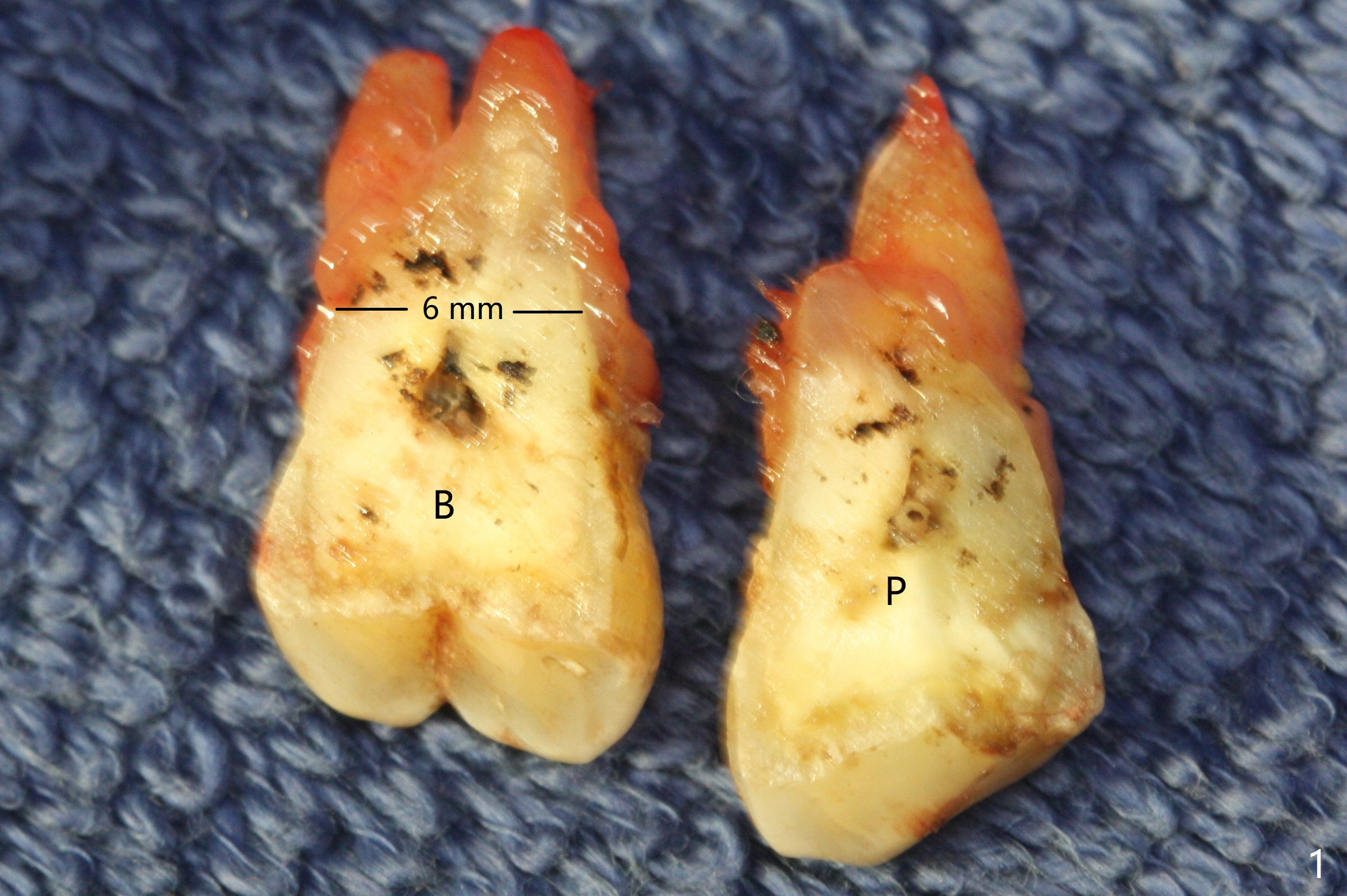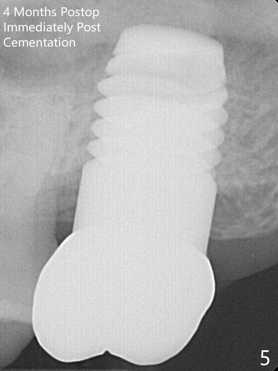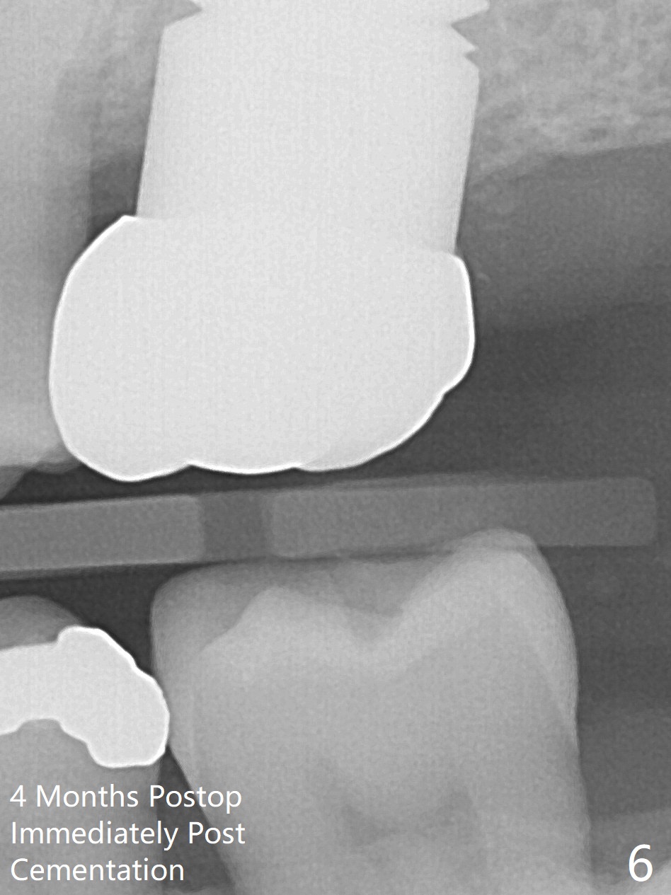 Initially the patient is reluctant to have the crack tooth extracted (Fig.1). Blood drawing for PRF fails. After extraction, the septum is confirmed to be short and thin. The bone density is moderate. When a 3.5 mm drill is being used, the osteotomy perforates into the mesiobuccal socket. A 5x10 mm IS implant achieves minimal stability. As 5.5, 6.0 and 7.0 mm cortical taps are inserted, primary stability is not obtained, as more bone is being removed at the level of the septum. When a 7x17 mm Tatum tapered tap is placed, it looks too small for the socket, as confirmed by measurement of a preop PA (Fig.2). Chronic infection associated with crack syndrome for 2 years may cause bone loss of the socket walls. Since the primary stability of a 8x17 mm tapered tap is not high (Fig.3), a 8x14 mm cylindrical implant is placed (after try in of its dummy one) with > 50 Ncm (Fig.4). The implant engages into the mesial and distal socket walls for stability. A 6x3 mm abutment is placed for an immediate provisional. In spite of difficult manipulation, the sinus membrane remains intact. Vanilla graft is placed for sinus lift and buccal and palatal gaps. Since IS implants are more or less cylindrical and if a 5 mm one does not achieve primary stability, a larger Tatum tapered tap should be tried immediately without using IS cylindrical taps. The patient returns 3 months postop, requesting early restoration before a trip to home country. The provisional has occlusal perforation. Final restoration is cemented nearly 4 months postop (Fig.5,6). The large implant makes the early restoration possible. However there is bleeding on probing palatal 1.5 years post cementation (Fig.7), suggesting palatal thread exposure. Return to Upper Molar Immediate Implant, Prevent Molar Periimplantitis (Protocols, Table), Armaments 6 Xin Wei, DDS, PhD, MS 1st edition 05/07/2018, last revision 05/08/2021