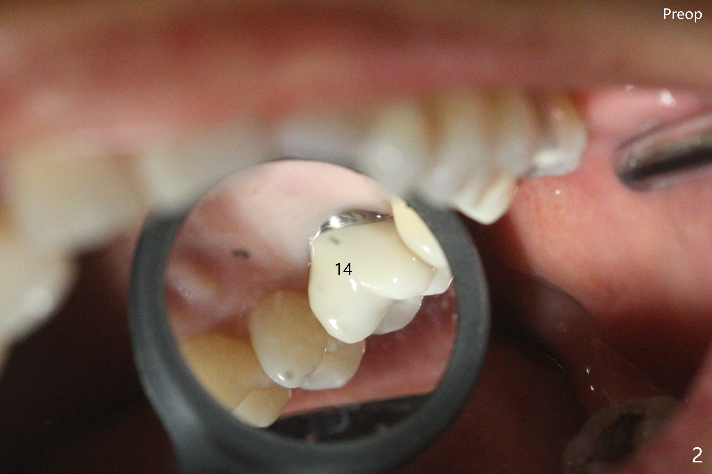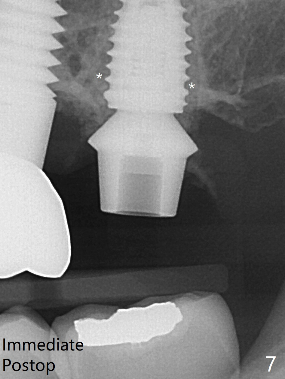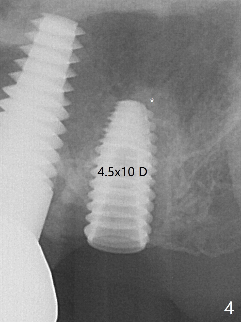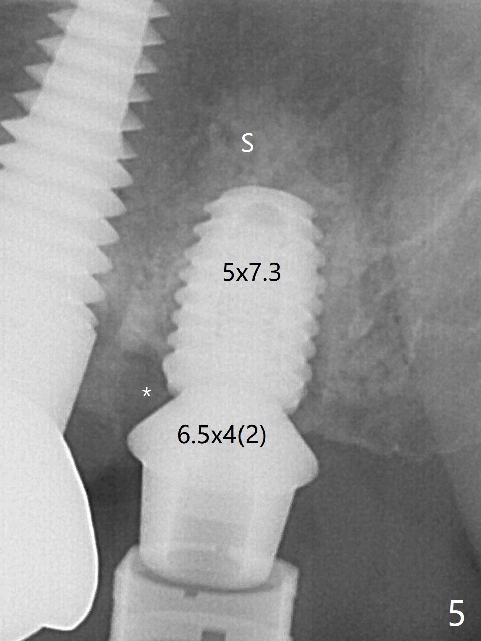 术前15号牙远中隐裂(图一:^),14号牙植体光滑面腭侧暴露(8年前腭侧窝植入),但是牙龈健康(图二)。14号牙牙槽窝没有肉芽组织,利用导板(Shinning Oral Scanner)完成3.5毫米钻洞,无法使用圆钻做内提升,改用4x10毫米报废植体提升,不幸窦膜好像破裂(因为薄),塞入半块PRF膜,促进修复,然后使用4.5x10毫米报废植体扩大植牙床(图三,四),无意达到部分提升(*),取出报废植体,发现植牙床没有穿孔了,加入少量粘性骨粉(图五:S(即使在窦内不容易分散))后,植入正式植体和基台。植体周围间隙(图五:*),使用刮匙,牙周探针,和长探针(图六)将骨粉输入深部(图七:*)。