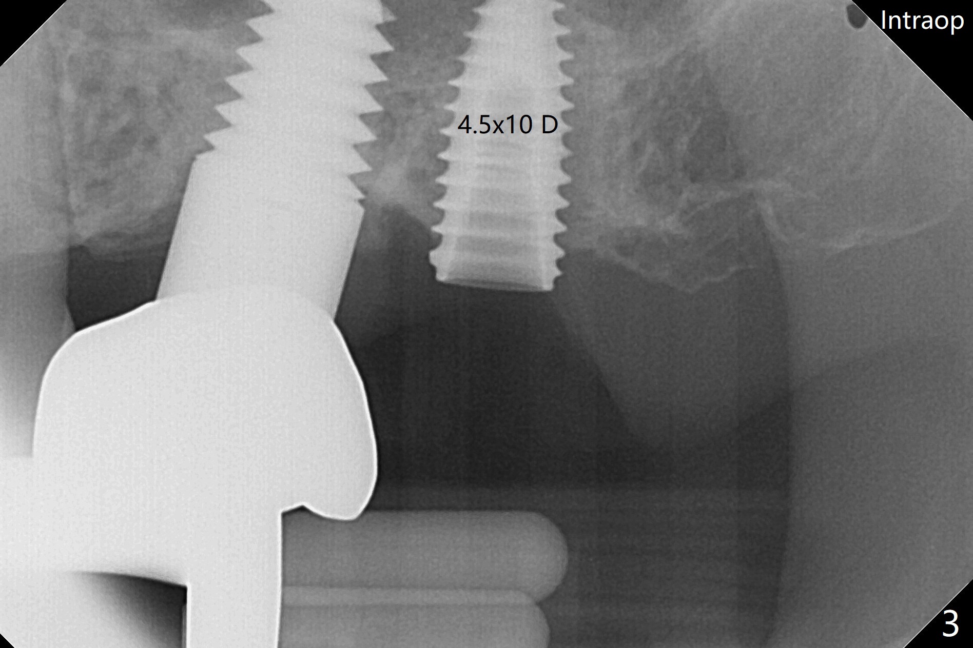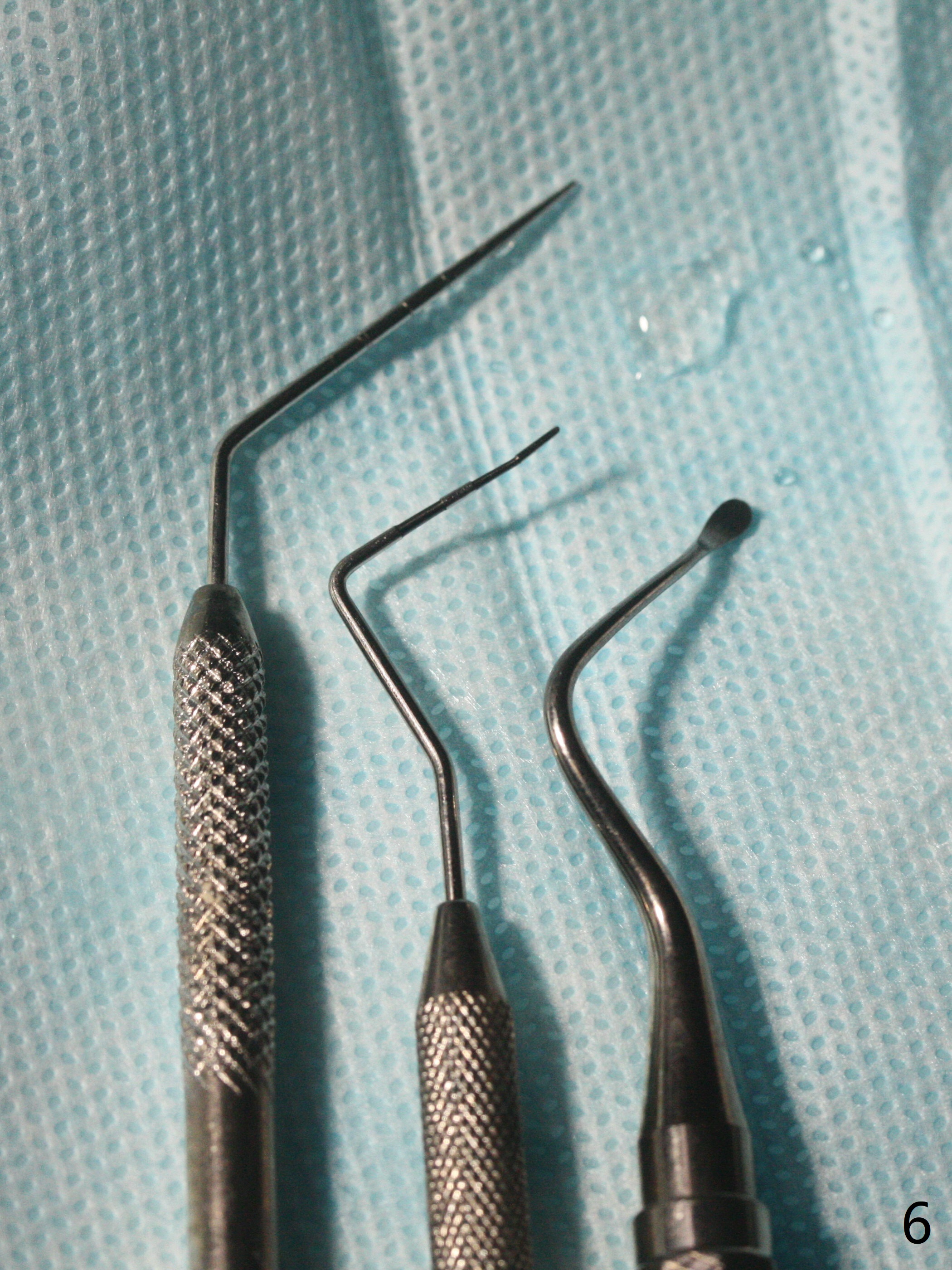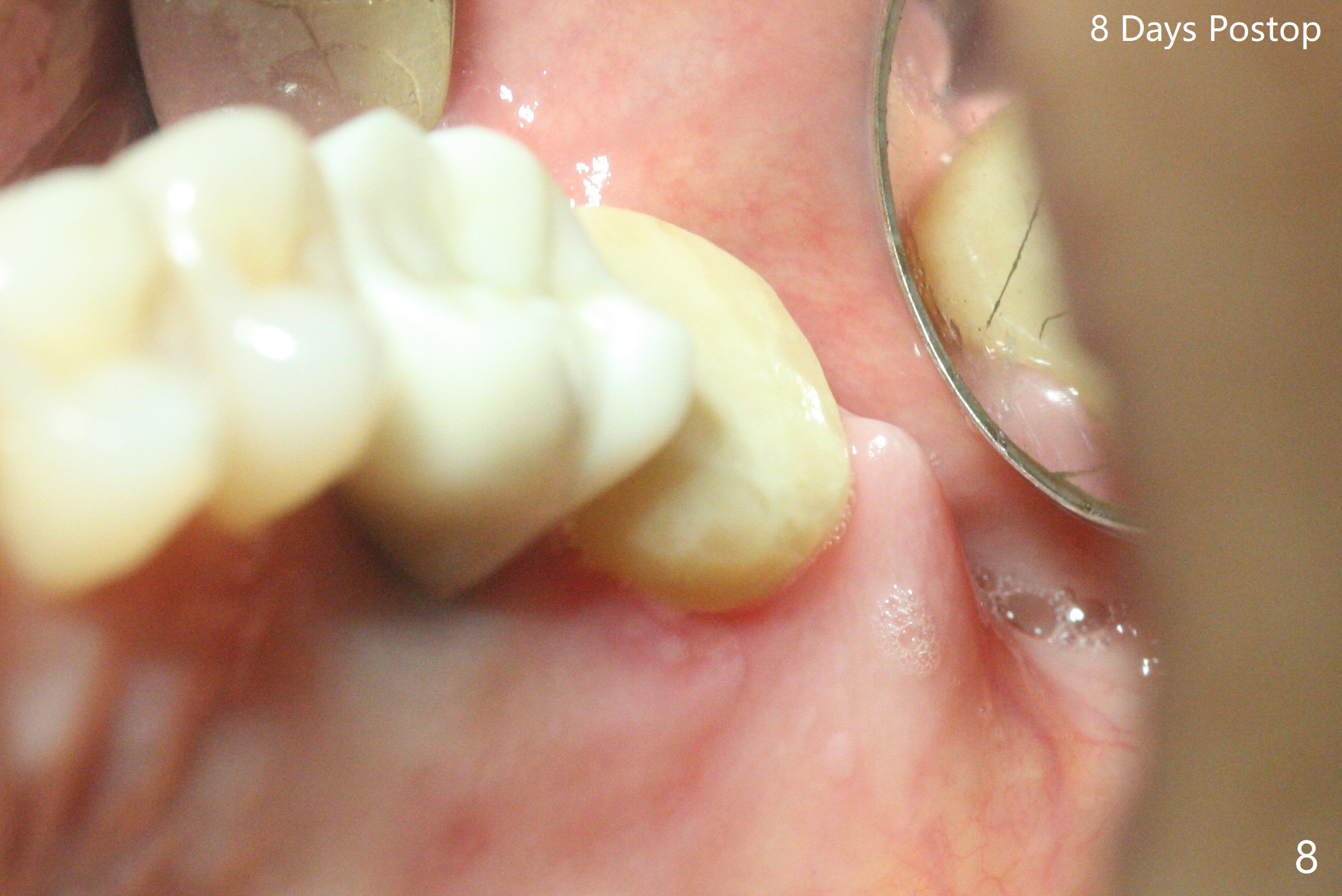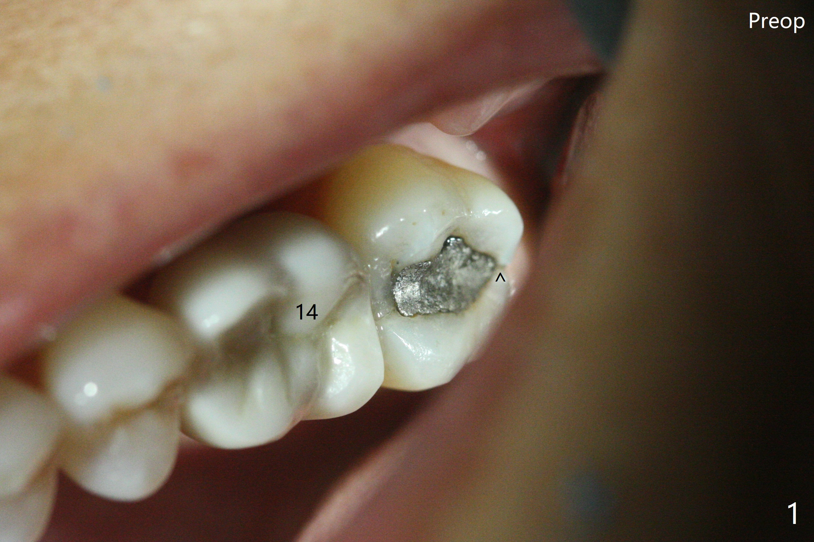 术前15号牙远中隐裂(图一:^),14号牙植体光滑面腭侧暴露(8年前腭侧窝植入),但是牙龈健康(图二)。14号牙牙槽窝没有肉芽组织,利用导板(Shinning Oral Scanner)完成3.5毫米钻洞,无法使用圆钻做内提升,改用4x10毫米报废植体提升,不幸窦膜好像破裂(因为薄),塞入半块PRF膜,促进修复,然后使用4.5x10毫米报废植体扩大植牙床(图三,四),无意达到部分提升(*),取出报废植体,发现植牙床没有穿孔了,加入少量粘性骨粉(图五:S(即使在窦内不容易分散))后,植入正式植体和基台。植体周围间隙(图五:*),使用刮匙,牙周探针,和长探针(图六)将骨粉输入深部(图七:*)。