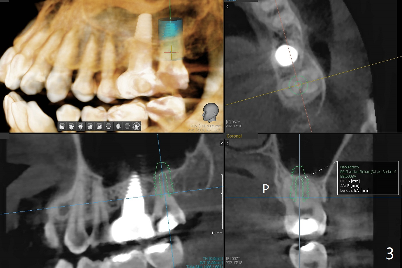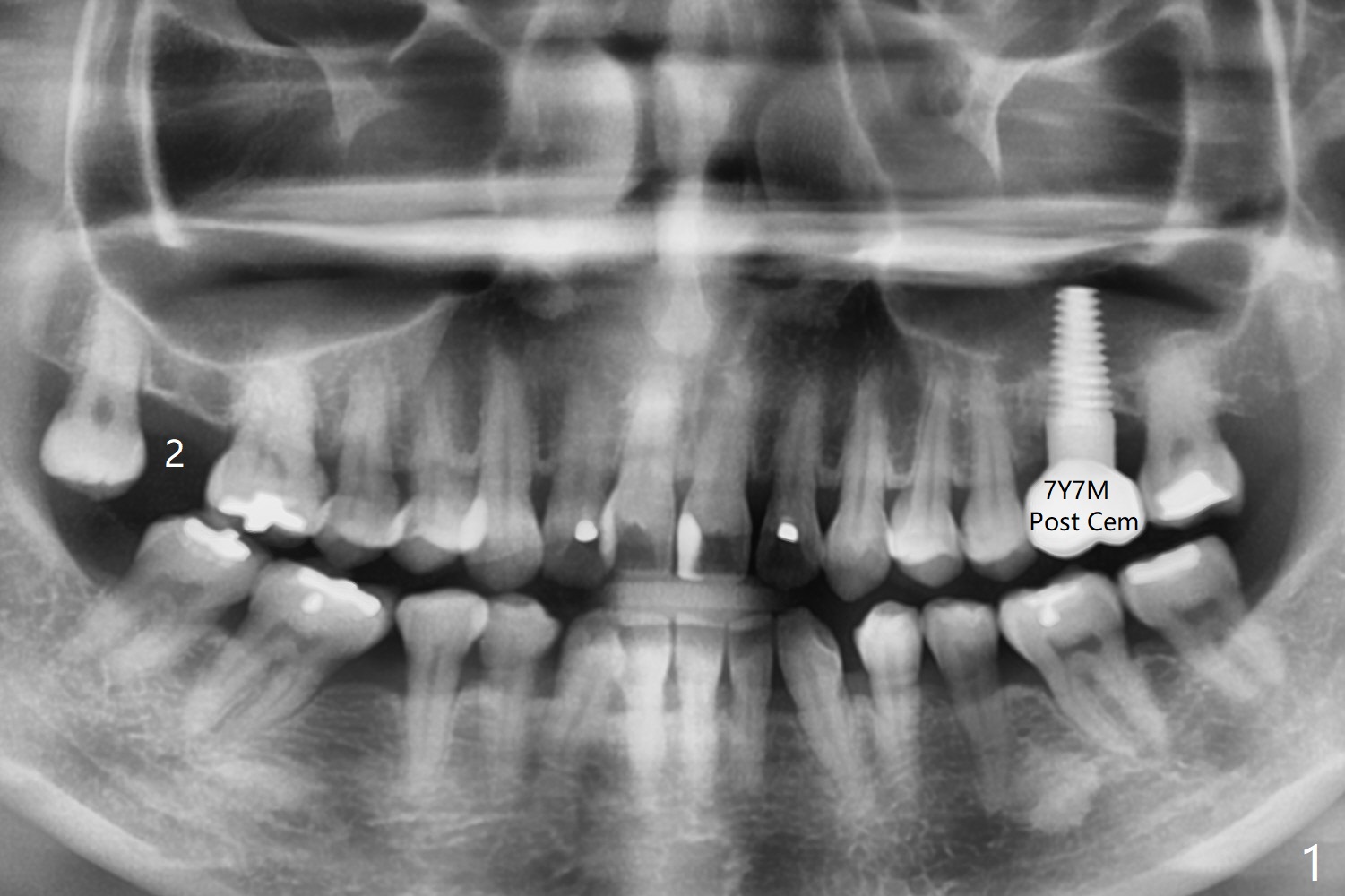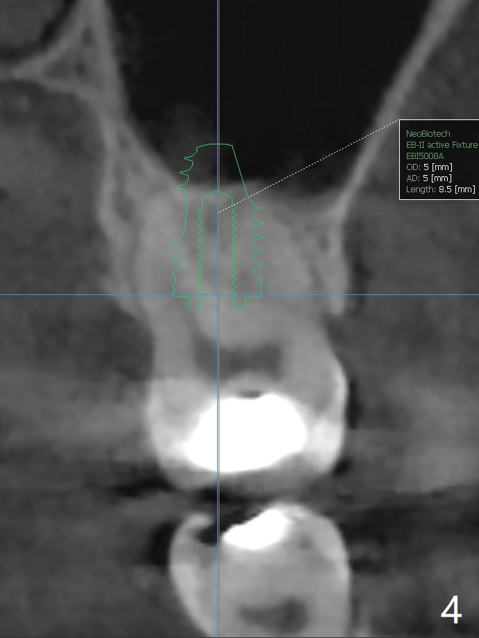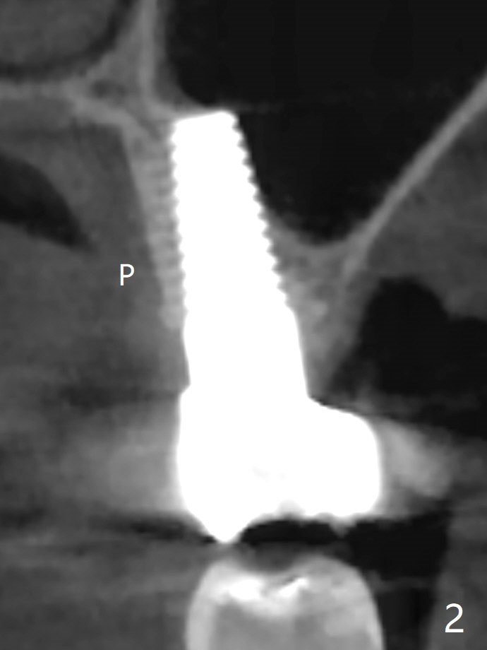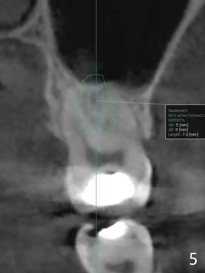 57岁女缺失2号牙多年,八年前14号牙折裂,根管治疗失败,改为即种(徒手),上颌骨骨质高度不足(图一),植体就一定植入上颌窦?近来15号牙又怀疑折裂,不愿接受根管治疗,要求种植。其实14号牙植体植入腭侧牙槽窝,顶端还有骨质,根尖颊侧多个螺纹似乎没有骨质覆盖,但是没有症状。15号牙上端上颌窦膜薄(图三),如果提升时窦膜完整,植入5x8.5毫米植体(图四),否则放置PRF,胶原塞,可以不植骨,植入5x7.3毫米植体(图五)。