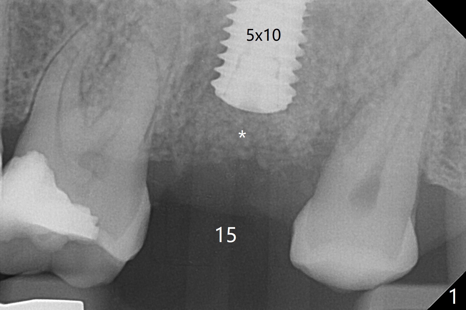 The longest (12 mm) bone trimmer seems not to work over the guide at #15. When osteotomy finishes, the guide is removed. The sinus floor happens to have been removed, whereas the sinus membrane remains intact. After partial insertion of a piece of PRF membrane (due to hemorrhage) and Vanilla graft for sinus lift, a 5x10 mm implant is placed with 15 Ncm. The implant appears to be short and placed deep (Fig.1,2). When an implant is not too large, it can be placed ~ 1 mm subcrestal (vs. 2-3 mm for this case) in spite of the palatal wall defect. A cover screw is used, followed by allograft (Fig.1 *). The latter is covered with another piece of PRF membrane, collagen membrane and periodontal dressing.扭力有时是假象,如果植体卡在硬点(例如骨皮质)而产生高扭力之后骨坏死,植体可能松动。