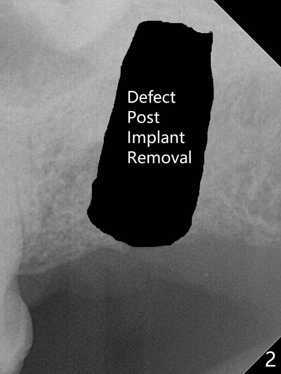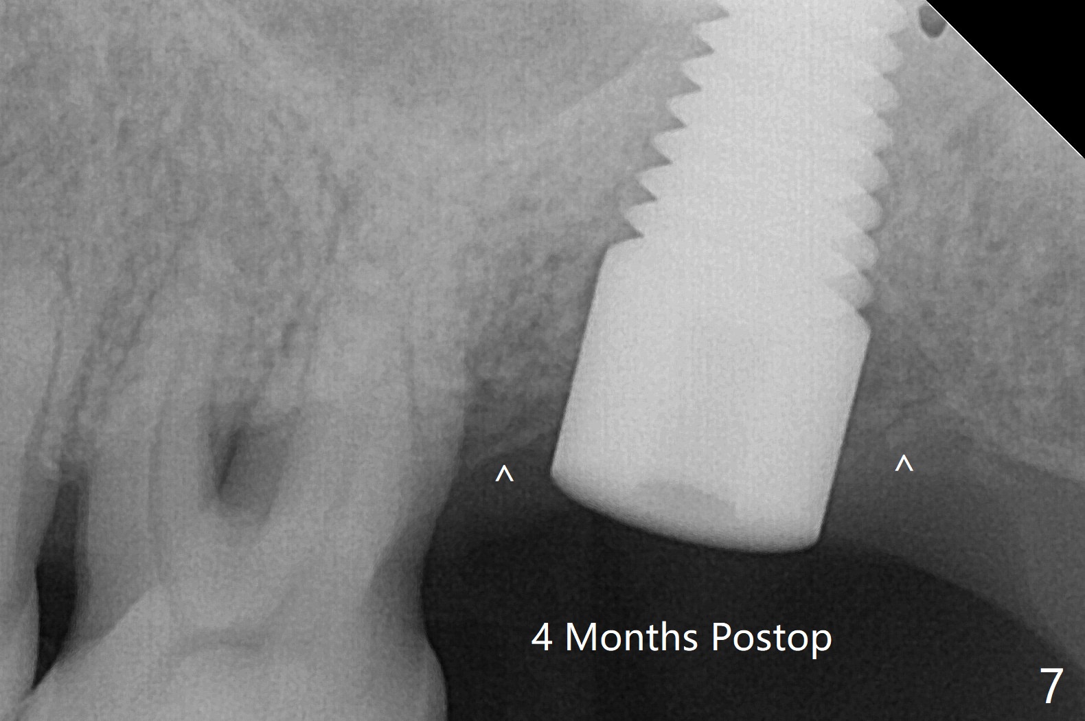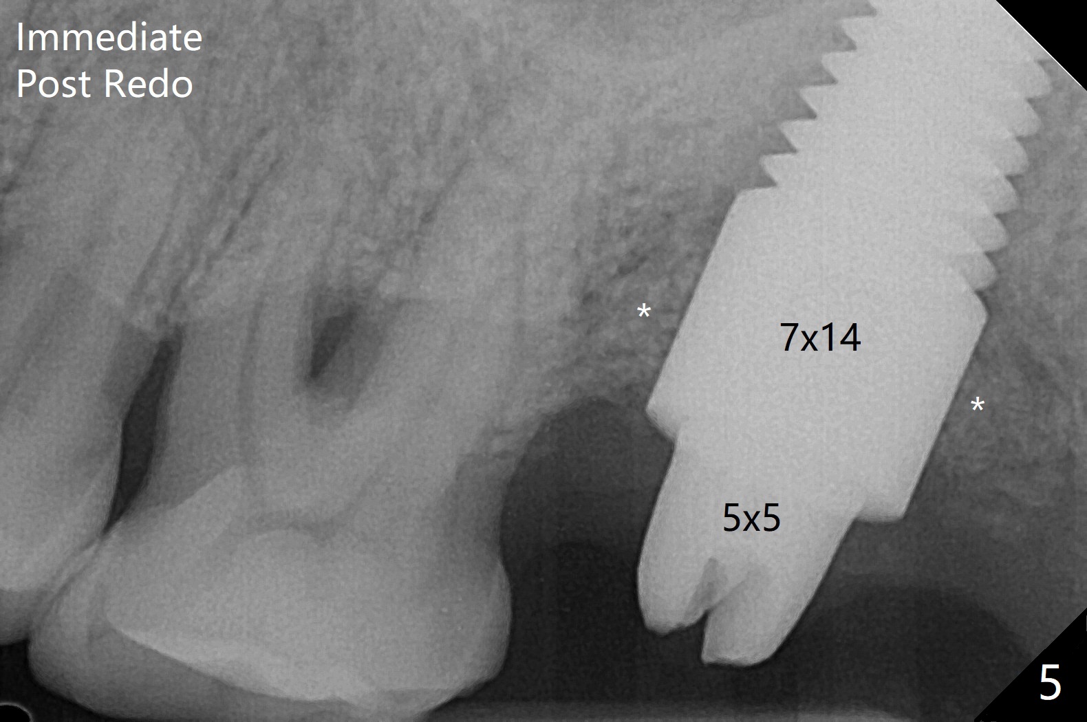 59岁男一年前因15号牙植牙周围炎去除牙冠和基台,植骨(图一:*(其实是第二次为周围炎植骨)),缝合。之后局部疼痛没有完全消失,准备再次手术(切开),如果螺纹暴露少,再次植骨。否则拔除植体(图二:黑色,手术探查的确不能挽救植体),之后有两个选择植骨(图三:灰色)或者即刻再次种植。由于原来植体比较粗(骨水平;6x12毫米),利用6(内径)/7(外径)毫米trephine drill和牙挺除去植体,留下相当大缺损(图二),植骨后(图三),位于缺损中间的骨粉(图四:棕色)可能因血供(红箭头)不足而愈合不佳。因此即刻重新种植显得有优势(图五(软组织水平植体,螺纹在自身骨(native bone)下)),让身体不必太辛苦(成骨)。放置5x5毫米基台目的是为树脂敷料提供固定点,以防PRF膜和缝线不能挽留粘性骨粉(*)。术后一个月撤除树脂敷料,伤口愈合正常(图六)。准备一个月后,制作临时牙冠。术后4个月取出5x5毫米基台,准备放置6x5毫米基台(图七),下面软组织水平植体没有疼痛或者松动,螺纹被骨粉或者再生骨质覆盖(^)。