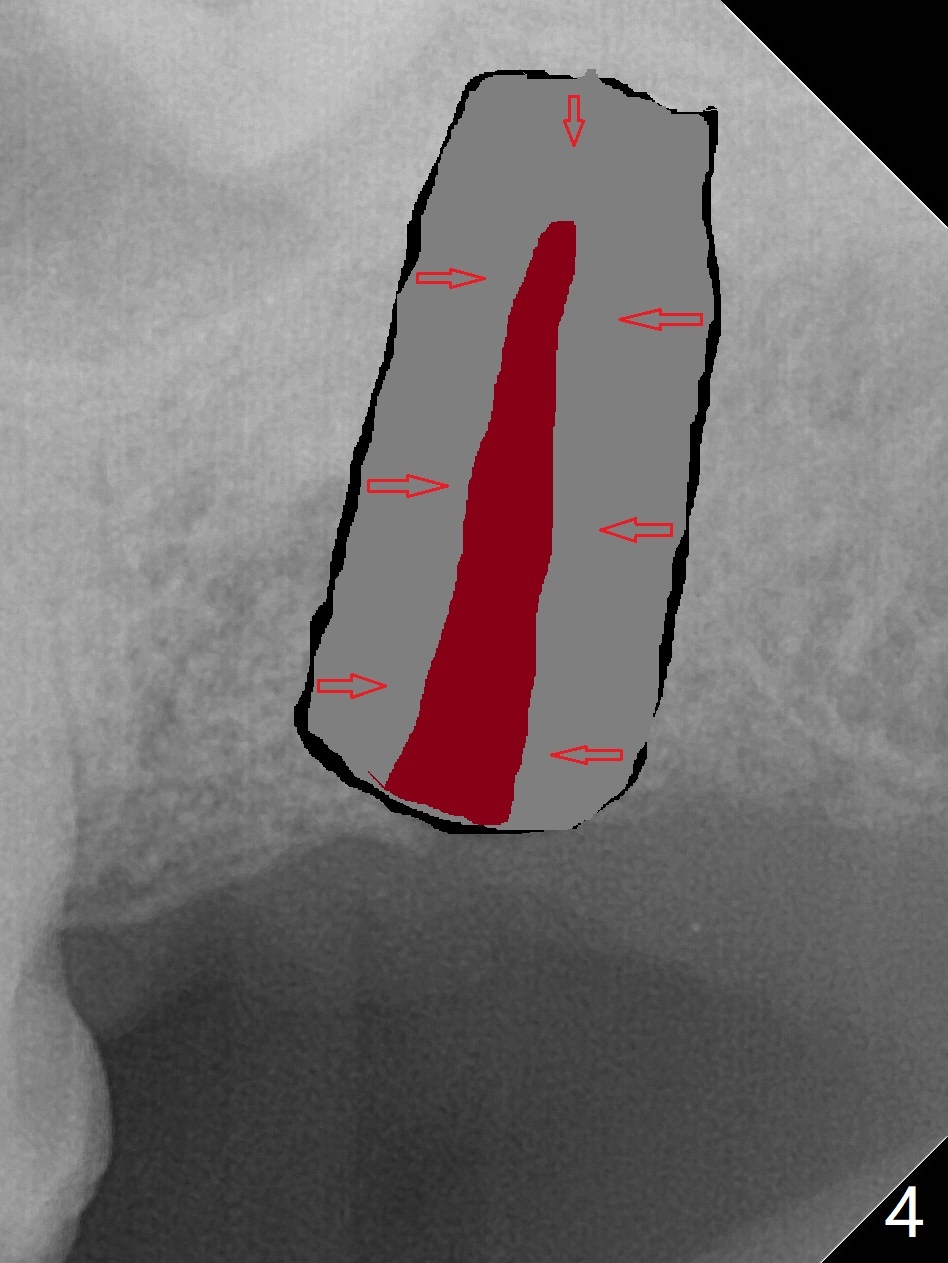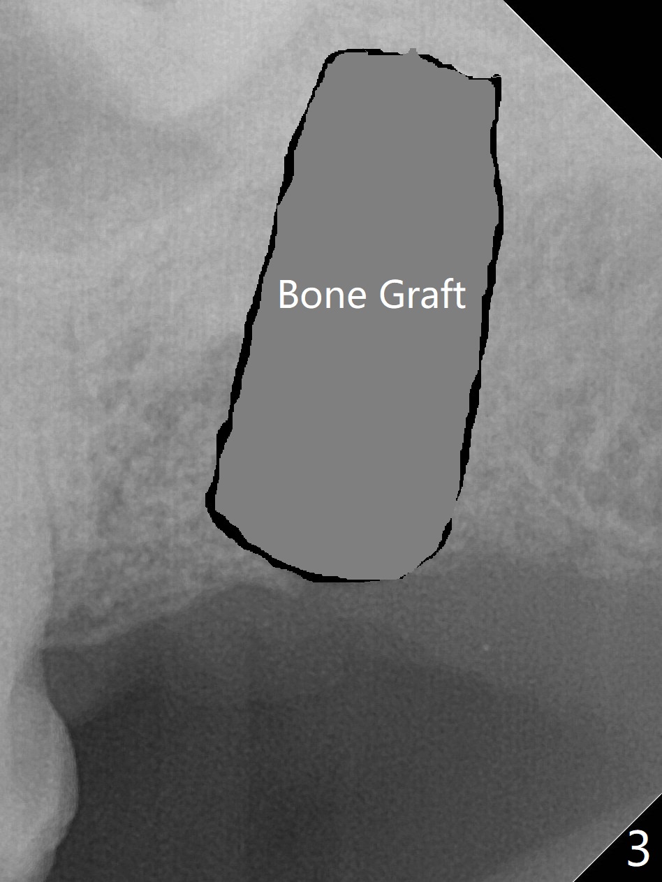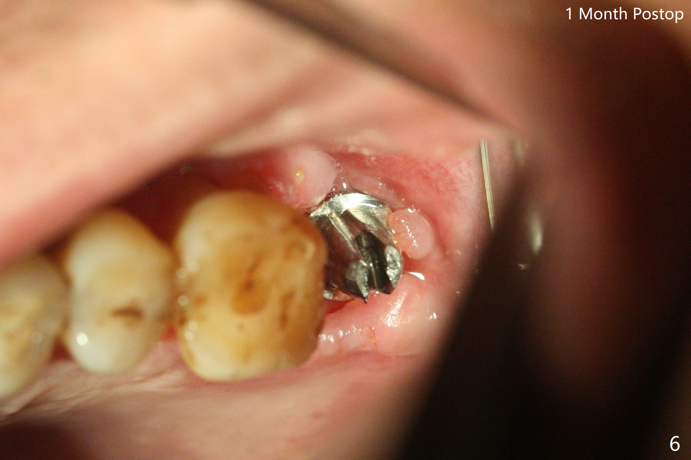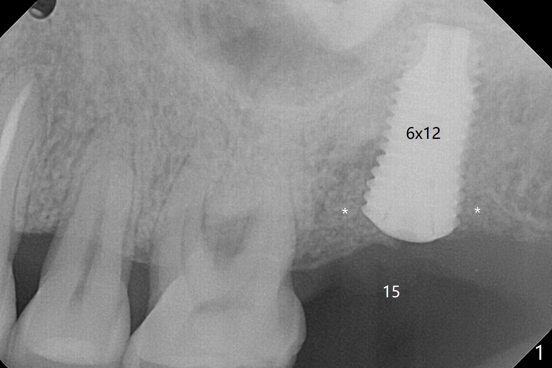 59岁男一年前因15号牙植牙周围炎去除牙冠和基台,植骨(图一:*(其实是第二次为周围炎植骨)),缝合。之后局部疼痛没有完全消失,准备再次手术(切开),如果螺纹暴露少,再次植骨。否则拔除植体(图二:黑色,手术探查的确不能挽救植体),之后有两个选择植骨(图三:灰色)或者即刻再次种植。由于原来植体比较粗(骨水平;6x12毫米),利用6(内径)/7(外径)毫米trephine drill和牙挺除去植体,留下相当大缺损(图二),植骨后(图三),位于缺损中间的骨粉(图四:棕色)可能因血供(红箭头)不足而愈合不佳。因此即刻重新种植显得有优势(图五(软组织水平植体,螺纹在自身骨(native bone)下)),让身体不必太辛苦(成骨)。放置5x5毫米基台目的是为树脂敷料提供固定点,以防PRF膜和缝线不能挽留粘性骨粉(*)。术后一个月撤除树脂敷料,伤口愈合正常(图六)。准备一个月后,制作临时牙冠。术后4个月取出5x5毫米基台,准备放置6x5毫米基台(图七),下面软组织水平植体没有疼痛或者松动,螺纹被骨粉或者再生骨质覆盖(^)。