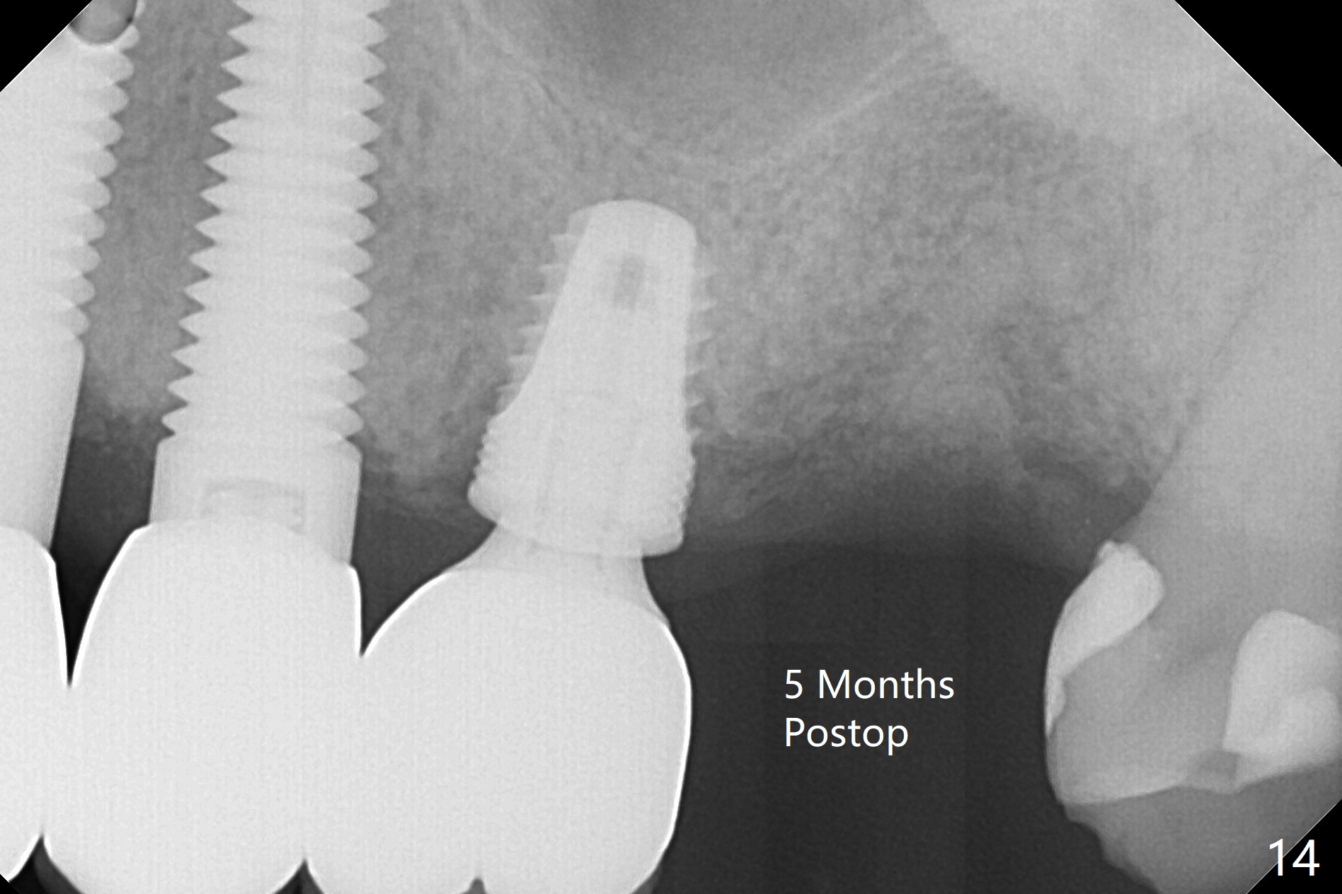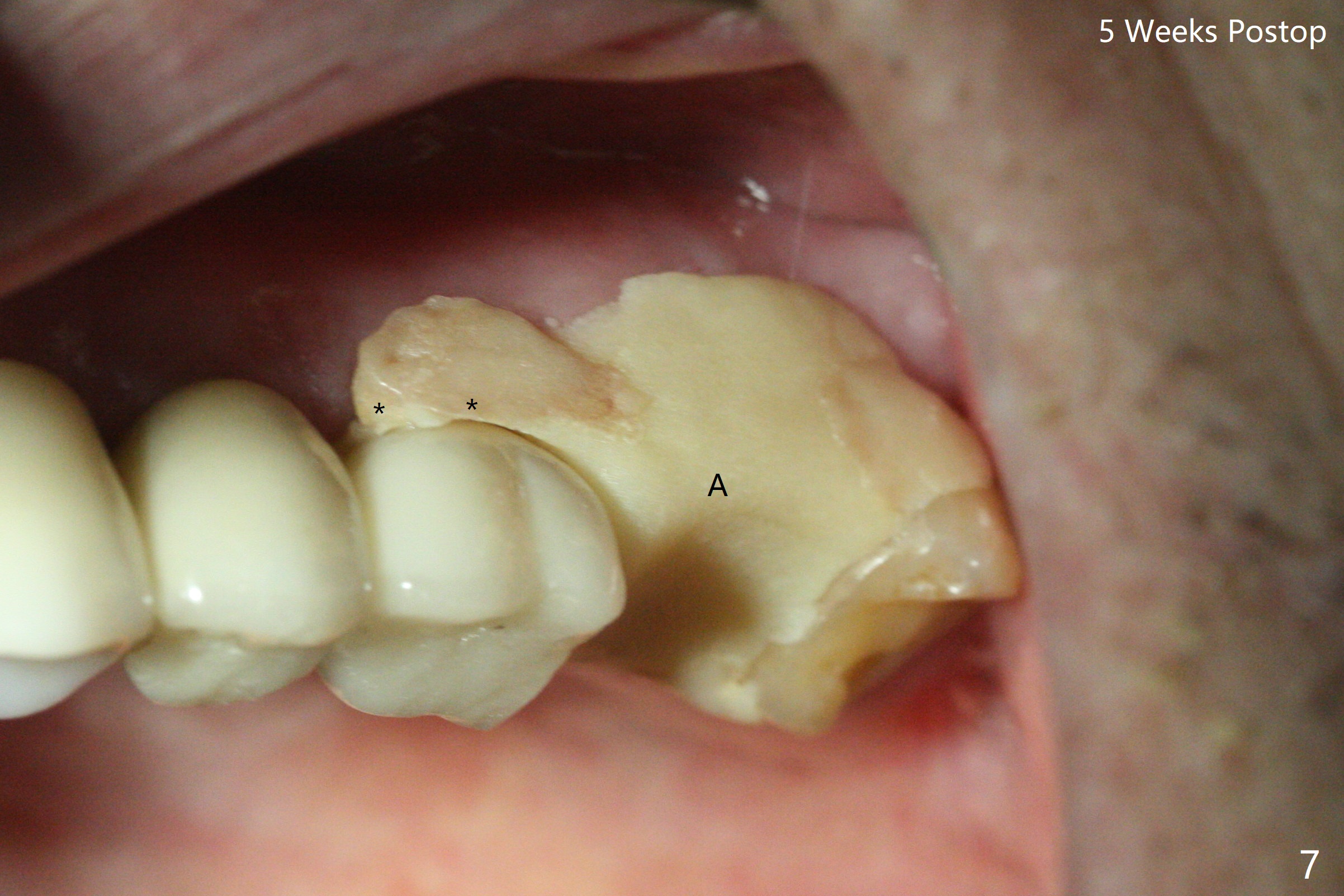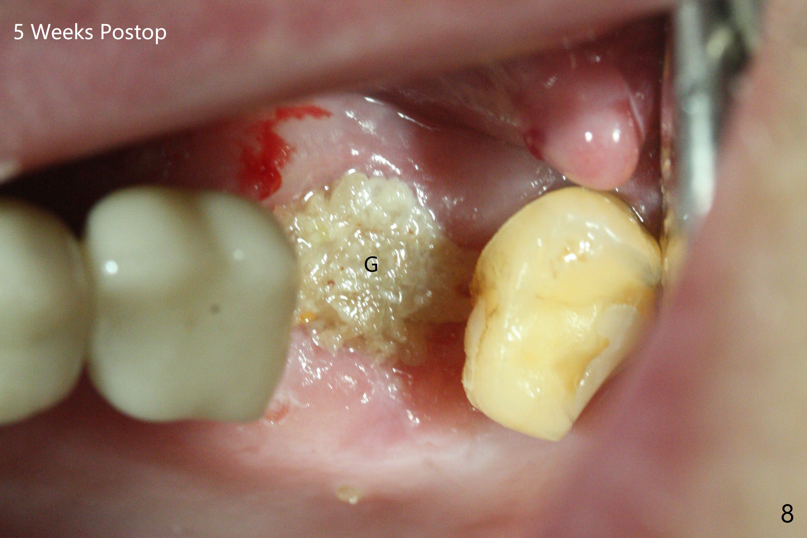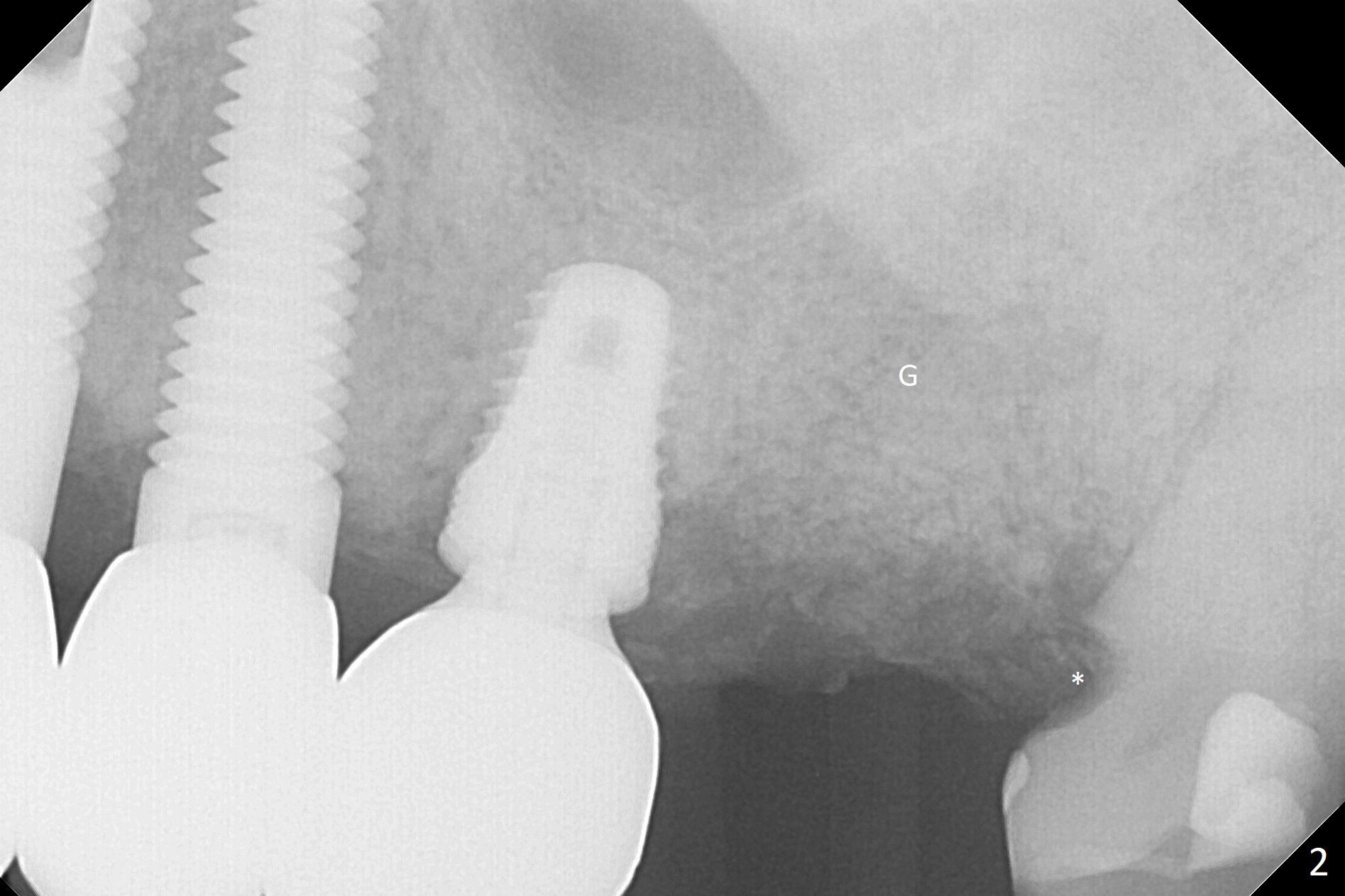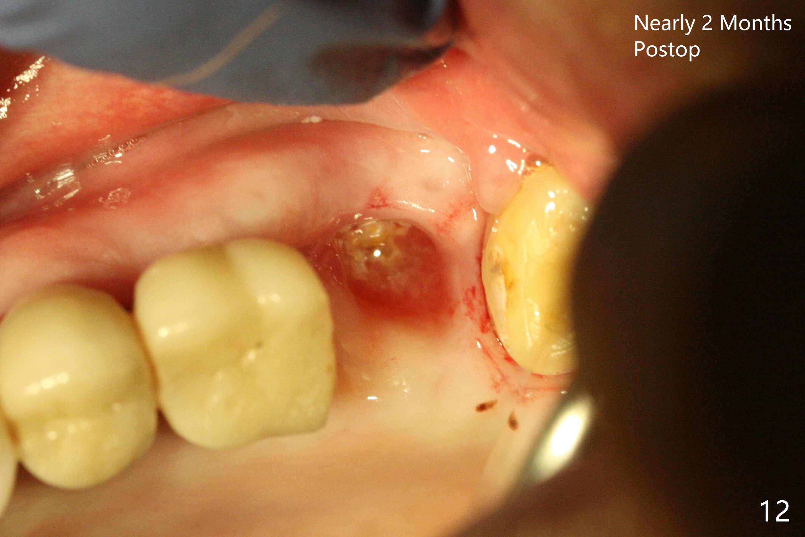 The 7x14 mm implant at #15 of a 89-year-old man is found to be loose ~ 1 year post cementation (Fig.1). After implant removal and debridement, bone graft is placed (Fig.2 G); the mesiocervical caries of the 3rd molar is removed, but not filled (*). With collagen membrane fixed with Chromic gut suture (Fig.3), setting acrylic is applied in the edentulous area, including the mesiocervical cavitation of the 3rd molar (Fig.4) for further retention. Bone graft gets lost following socket preservation at #31 with periodontal dressing. When the bone graft matures, a new implant (Fig.6 green) will get primary stability from the native bone, i.e., coronal to the sinus floor (Fig.5 F). The acrylic dressing (Fig.7 A) with a portion locking to the undercut of the neighboring crown (*) remains in place 5 weeks postop. When the dressing is cut off, the bone graft is exposed with odor (Fig.8,9 *). Periodontal dressing is applied. The distolingual portion of it gets lost due to brushing a day later. When he returns, the dressing is removed (Fig.10). It appears that the growing in gingival margin is pushing the bone graft out. A moment later after just a few rounds of swallowing, more graft is lost (Fig.11). We would love to leave the wound open, but the senior citizen complains of air leaking and requests reapplication of periodontal dressing. The bone graft is almost gone when the 2nd periodontal dressing is removed nearly 2 months postop (Fig.12). The tooth sensitivity disappears when MO caries is taken care of. The socket has a dimple 5 months postop (Fig.13), although it is filled with bone graft (Fig.14). Due to low bone density (~500 HU), sinus lift is required for implant stability with PRF (Fig.15). In fact the lab chooses not to do sinus lift.