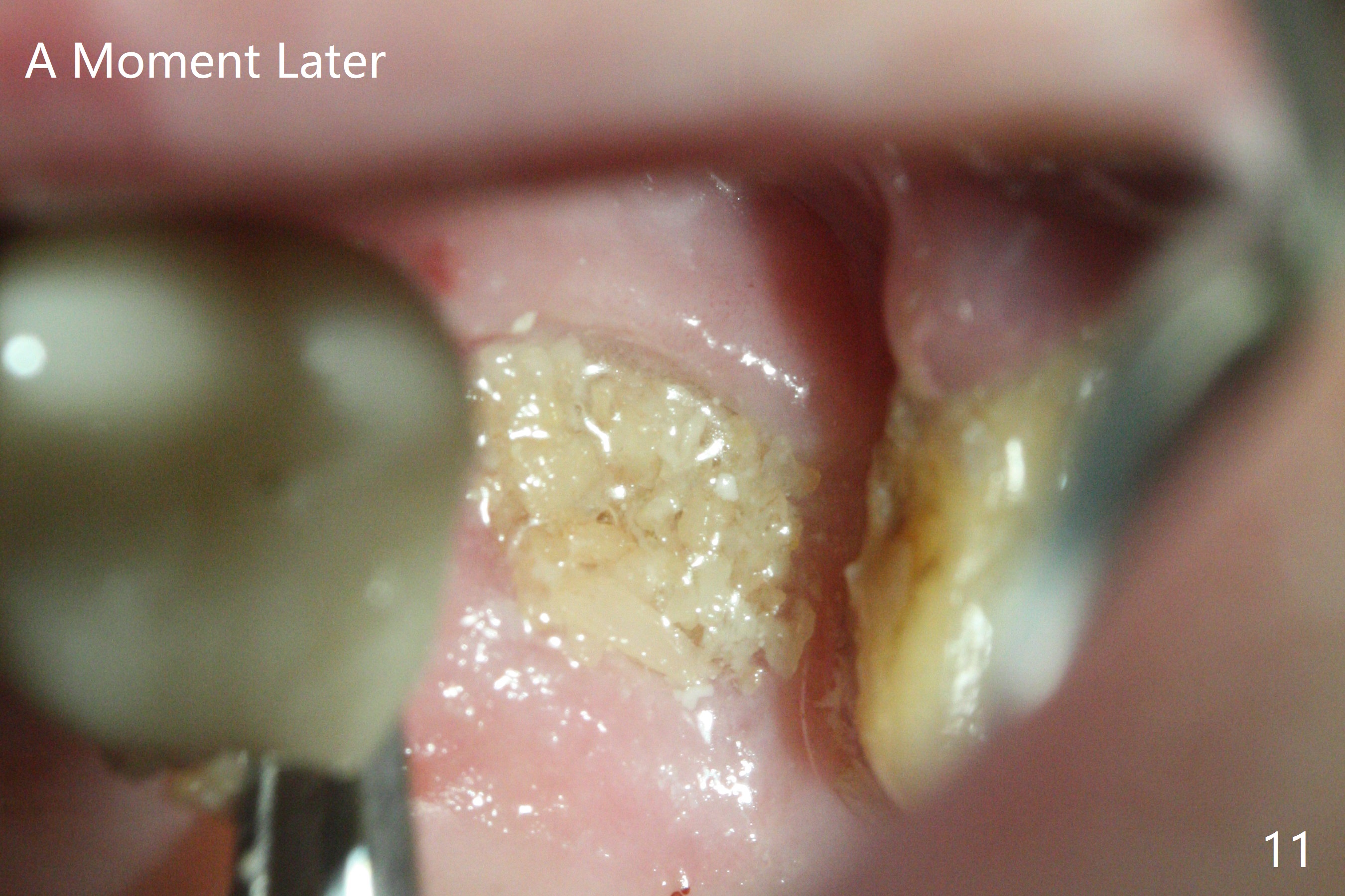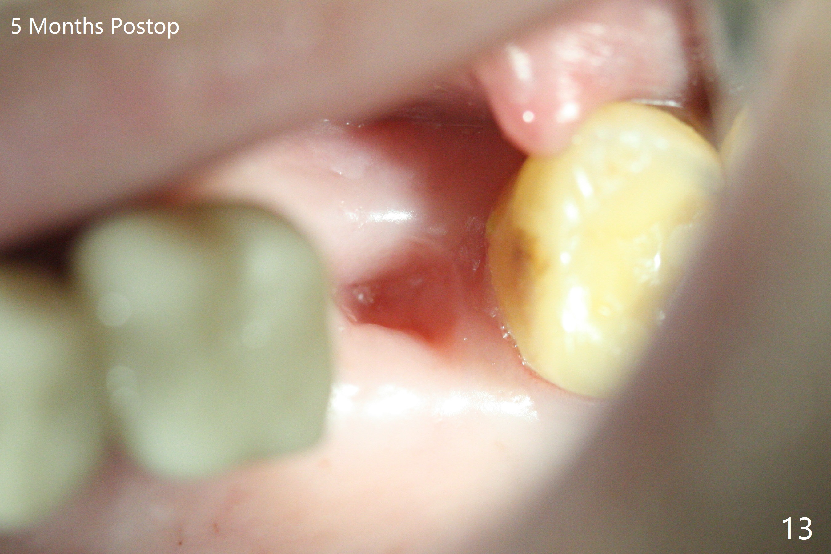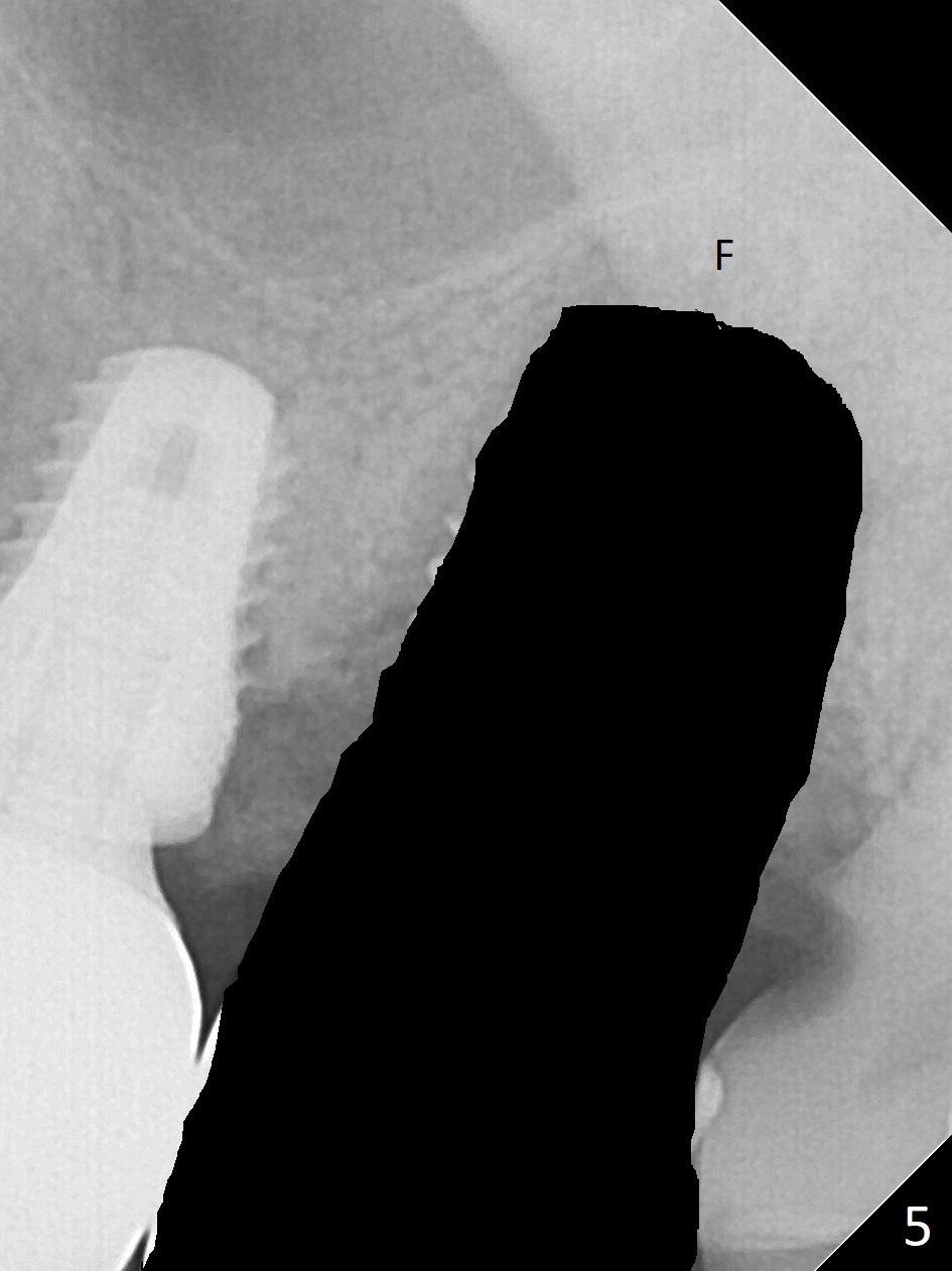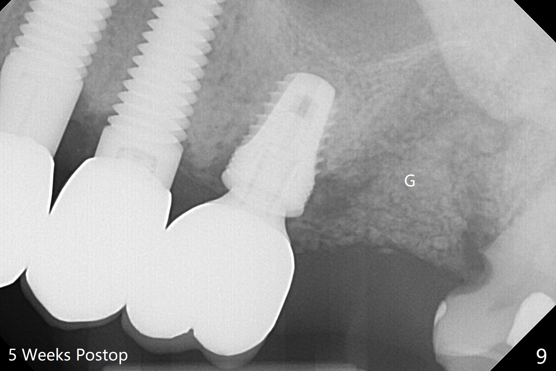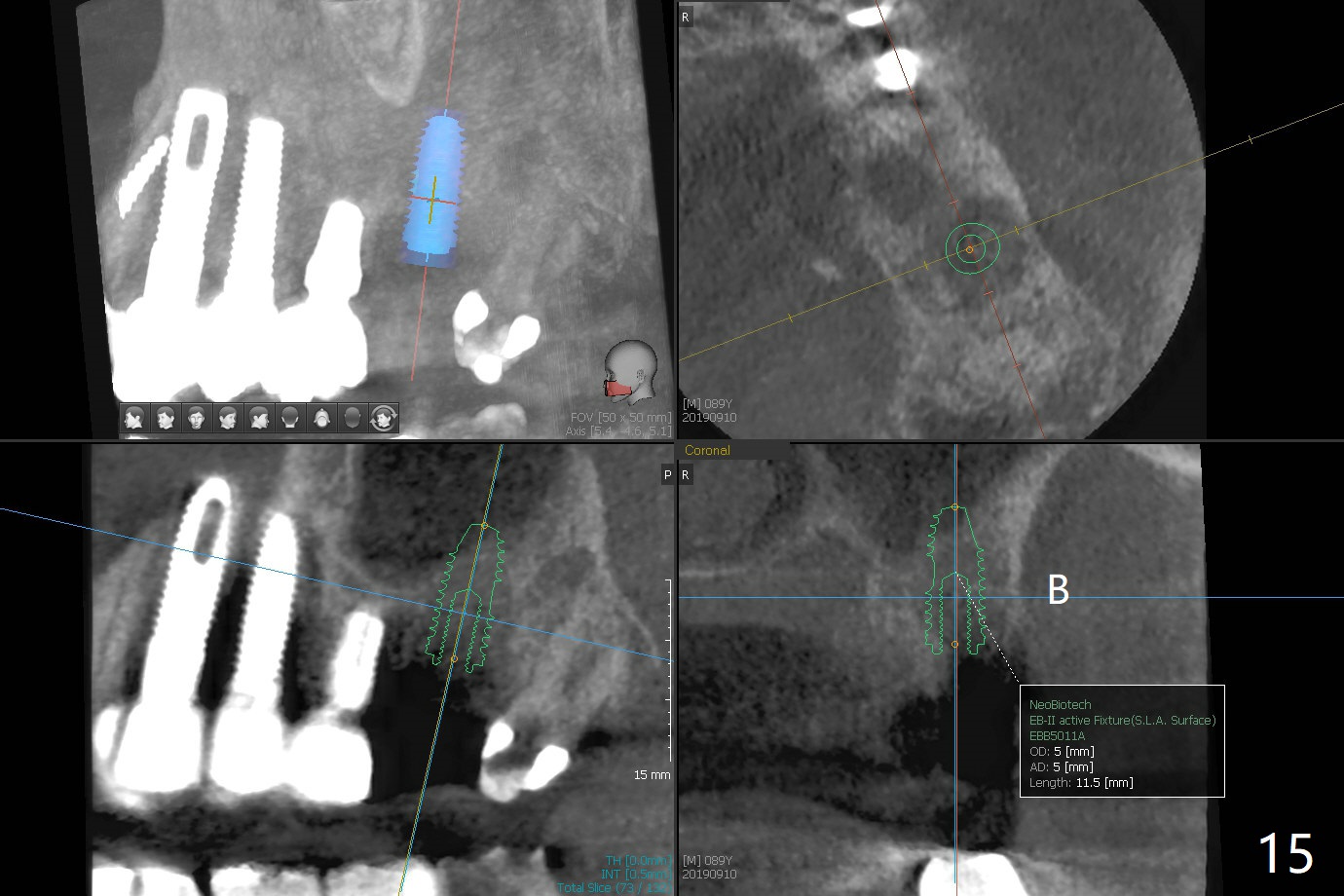 The 7x14 mm implant at #15 of a 89-year-old man is found to be loose ~ 1 year post cementation (Fig.1). After implant removal and debridement, bone graft is placed (Fig.2 G); the mesiocervical caries of the 3rd molar is removed, but not filled (*). With collagen membrane fixed with Chromic gut suture (Fig.3), setting acrylic is applied in the edentulous area, including the mesiocervical cavitation of the 3rd molar (Fig.4) for further retention. Bone graft gets lost following socket preservation at #31 with periodontal dressing. When the bone graft matures, a new implant (Fig.6 green) will get primary stability from the native bone, i.e., coronal to the sinus floor (Fig.5 F). The acrylic dressing (Fig.7 A) with a portion locking to the undercut of the neighboring crown (*) remains in place 5 weeks postop. When the dressing is cut off, the bone graft is exposed with odor (Fig.8,9 *). Periodontal dressing is applied. The distolingual portion of it gets lost due to brushing a day later. When he returns, the dressing is removed (Fig.10). It appears that the growing in gingival margin is pushing the bone graft out. A moment later after just a few rounds of swallowing, more graft is lost (Fig.11). We would love to leave the wound open, but the senior citizen complains of air leaking and requests reapplication of periodontal dressing. The bone graft is almost gone when the 2nd periodontal dressing is removed nearly 2 months postop (Fig.12). The tooth sensitivity disappears when MO caries is taken care of. The socket has a dimple 5 months postop (Fig.13), although it is filled with bone graft (Fig.14). Due to low bone density (~500 HU), sinus lift is required for implant stability with PRF (Fig.15). In fact the lab chooses not to do sinus lift.
