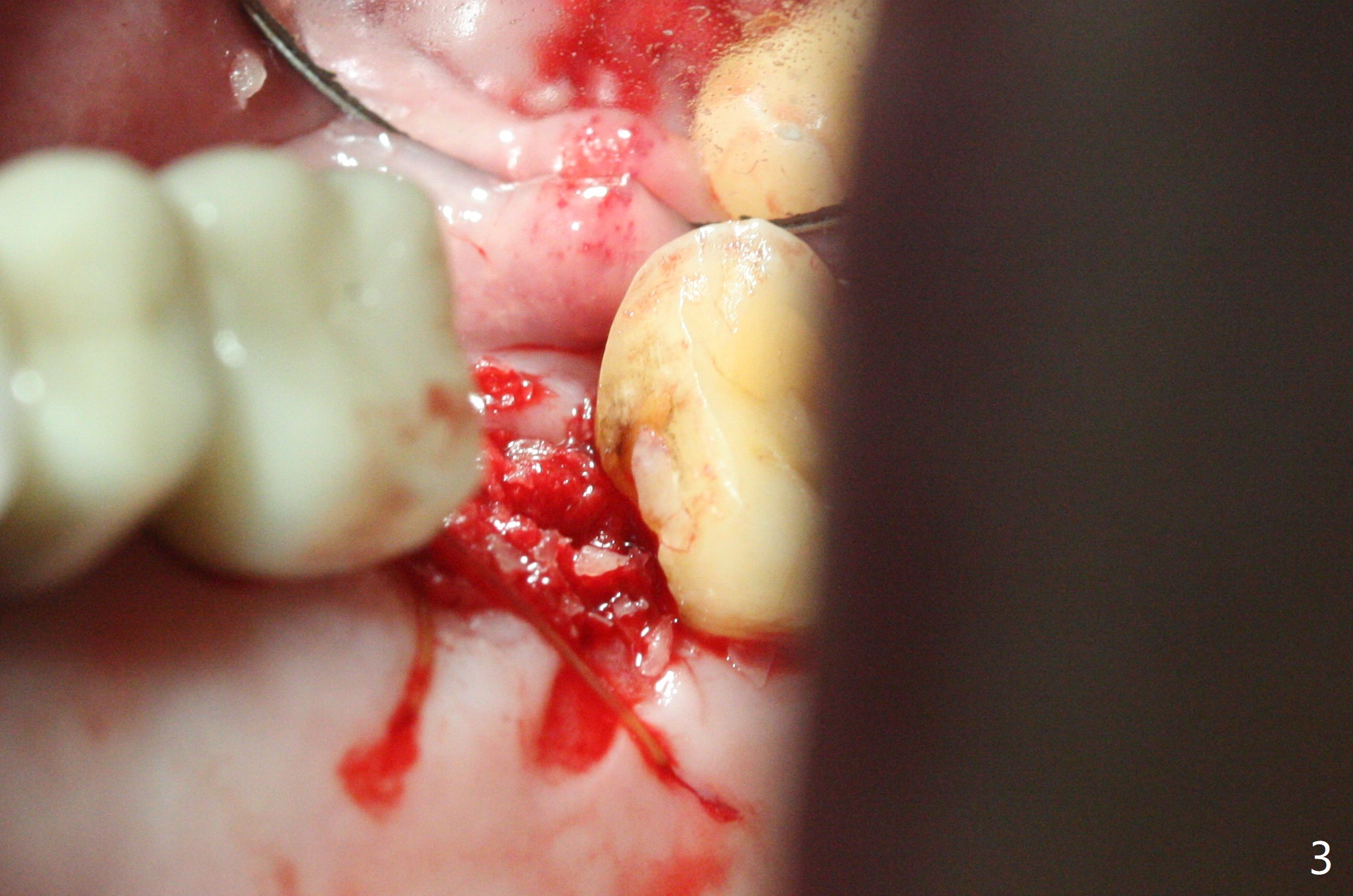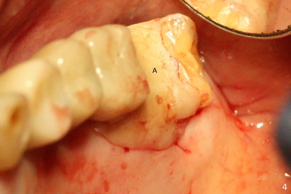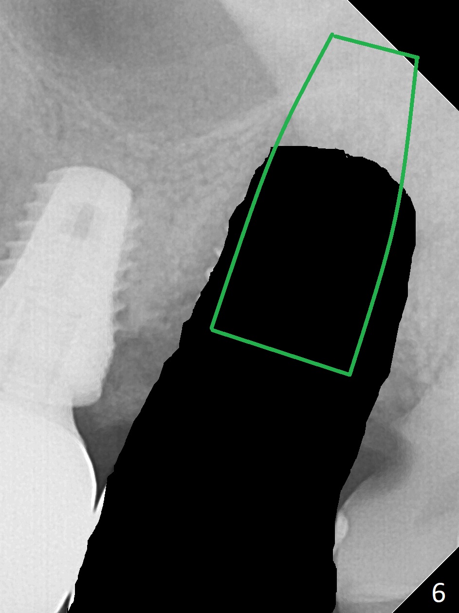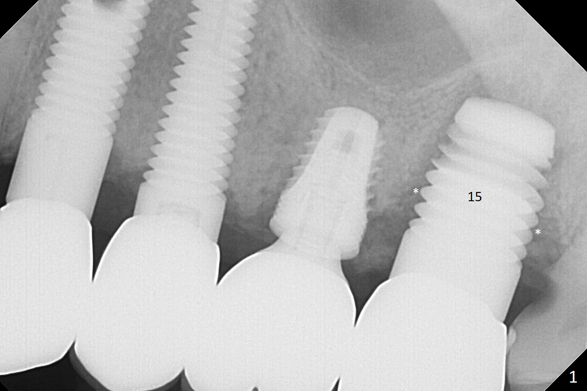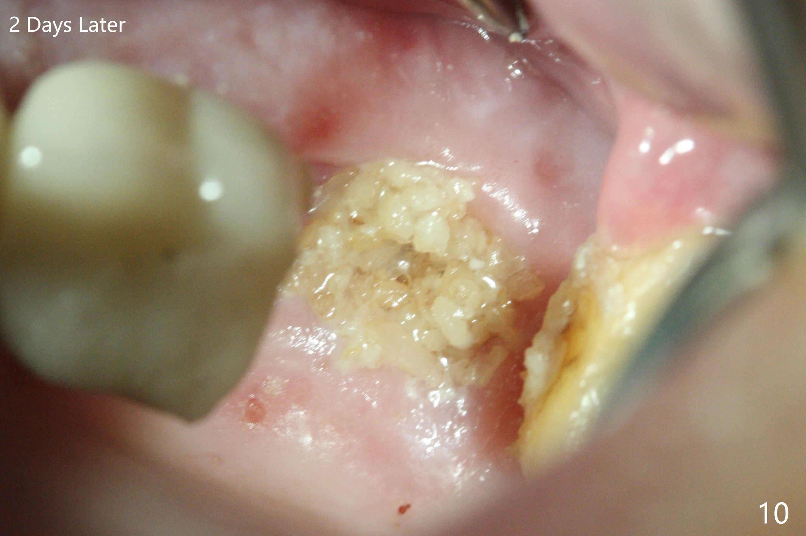 The 7x14 mm implant at #15 of a 89-year-old man is found to be loose ~ 1 year post cementation (Fig.1). After implant removal and debridement, bone graft is placed (Fig.2 G); the mesiocervical caries of the 3rd molar is removed, but not filled (*). With collagen membrane fixed with Chromic gut suture (Fig.3), setting acrylic is applied in the edentulous area, including the mesiocervical cavitation of the 3rd molar (Fig.4) for further retention. Bone graft gets lost following socket preservation at #31 with periodontal dressing. When the bone graft matures, a new implant (Fig.6 green) will get primary stability from the native bone, i.e., coronal to the sinus floor (Fig.5 F). The acrylic dressing (Fig.7 A) with a portion locking to the undercut of the neighboring crown (*) remains in place 5 weeks postop. When the dressing is cut off, the bone graft is exposed with odor (Fig.8,9 *). Periodontal dressing is applied. The distolingual portion of it gets lost due to brushing a day later. When he returns, the dressing is removed (Fig.10). It appears that the growing in gingival margin is pushing the bone graft out. A moment later after just a few rounds of swallowing, more graft is lost (Fig.11). We would love to leave the wound open, but the senior citizen complains of air leaking and requests reapplication of periodontal dressing. The bone graft is almost gone when the 2nd periodontal dressing is removed nearly 2 months postop (Fig.12). The tooth sensitivity disappears when MO caries is taken care of. The socket has a dimple 5 months postop (Fig.13), although it is filled with bone graft (Fig.14). Due to low bone density (~500 HU), sinus lift is required for implant stability with PRF (Fig.15). In fact the lab chooses not to do sinus lift.