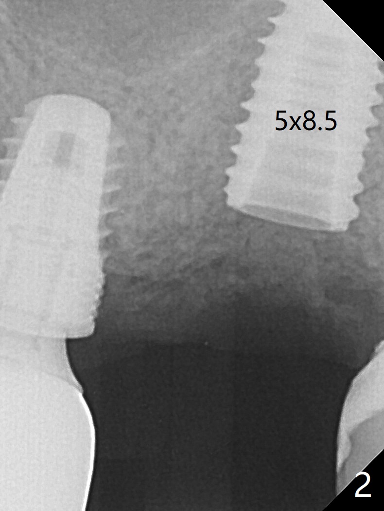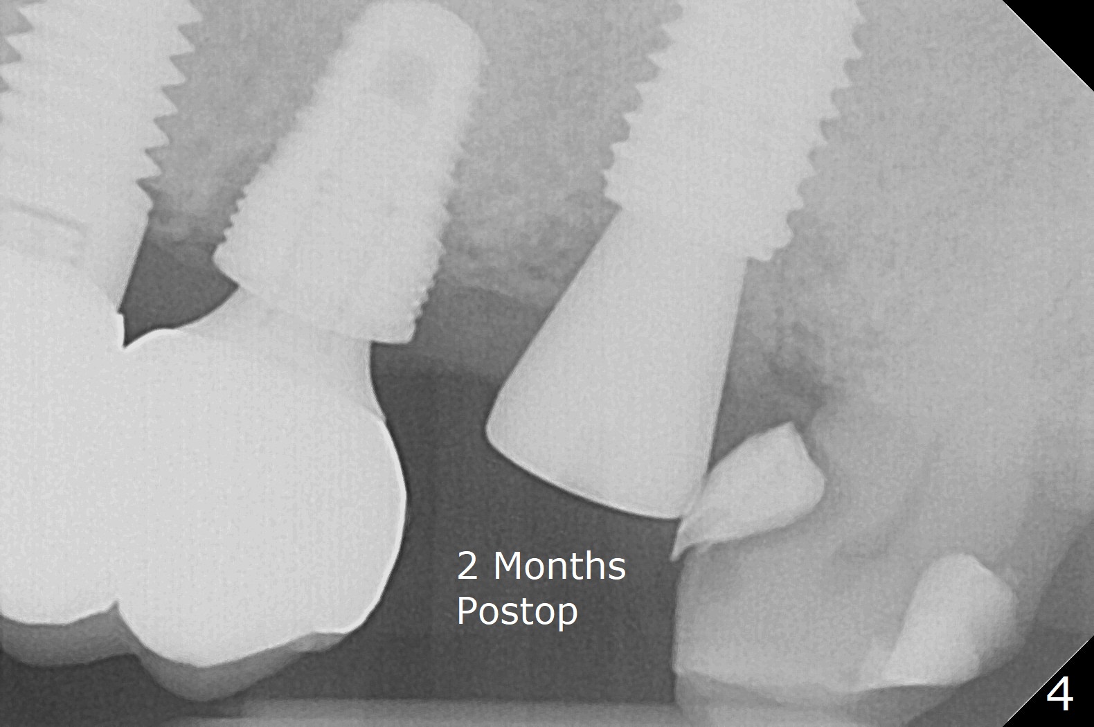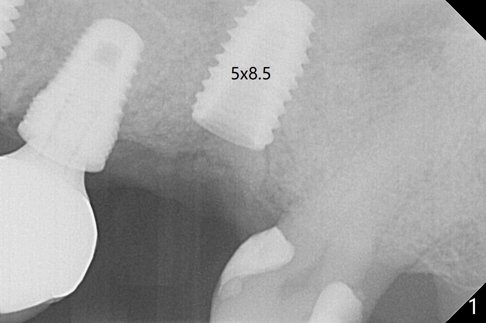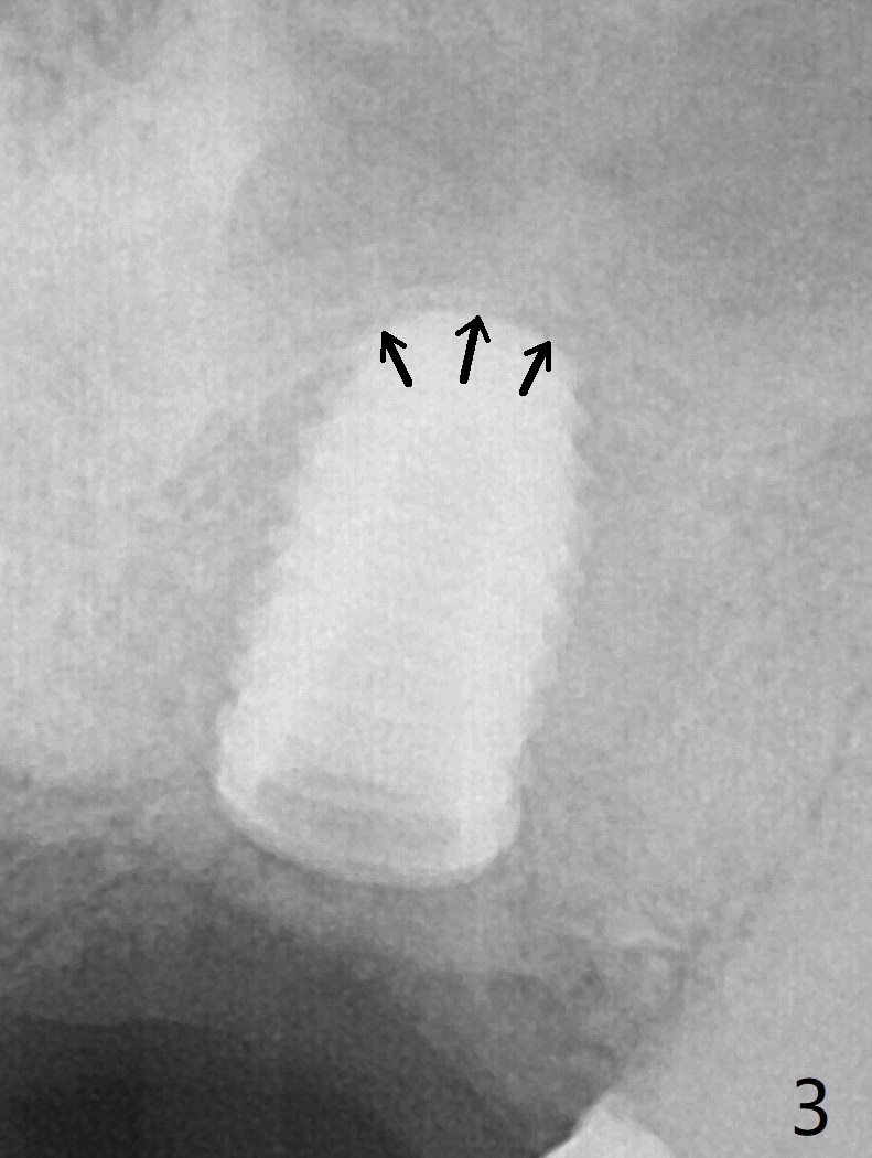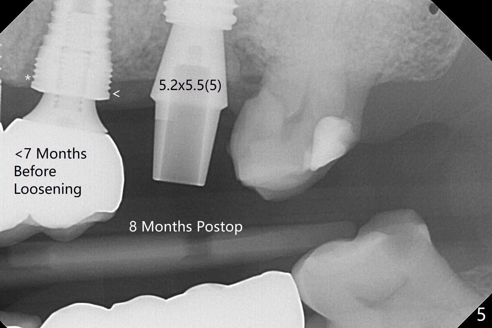 Due to low bone density post large implant (7 mm in diameter) removal with bone graft at #15, osteotomy with guide is underprep (last drill: 3.5x10 vs. 4.5x10 mm (design)). When a 4.5x10 mm dummy implant is placed at the beginning of the 1st line (10.5 mm offset), the torque is ~ 15 Ncm. As a 5x8.5 mm final implant is being placed, the torque increases to 30 Ncm (Fig.1,2) with apparently incidental sinus lift (Fig.3 arrows). The implant remains in place with a healing abutment 2 months 9 days postop (Fig.4). Healing abutment is changed from 5.5x6 to 6.8x5 mm 4.5 months postop when #16 MO composite is redo. There is bone loss at #14 mesially (Fig.5 *) with microthread exposure (<) less than 7 months before loosening.