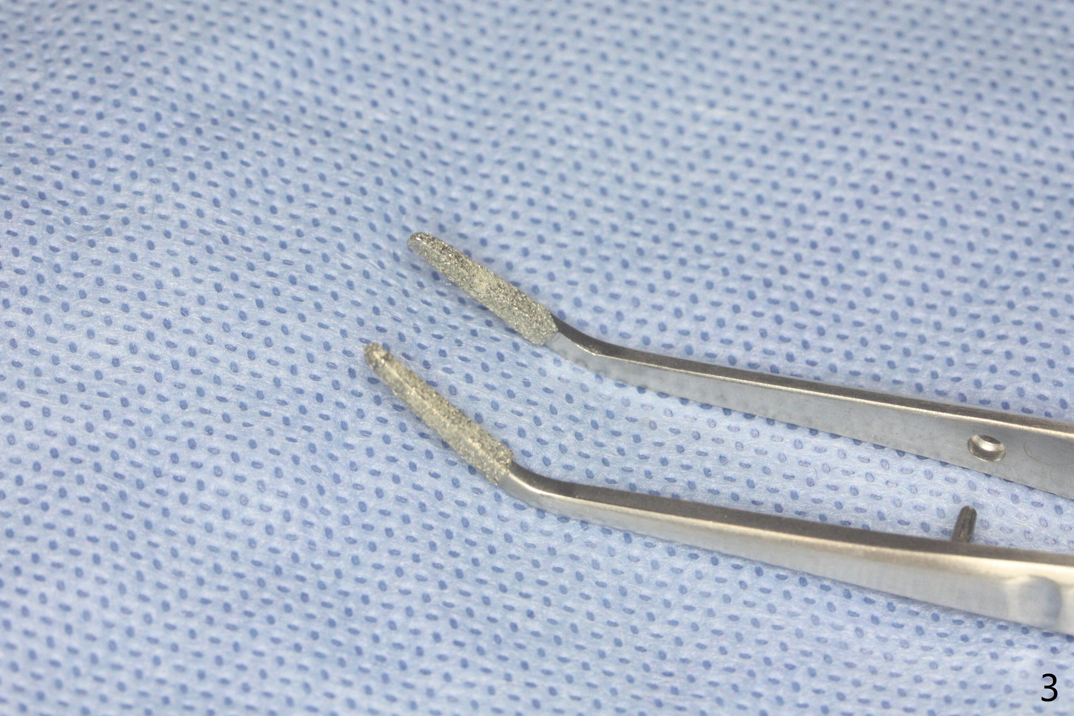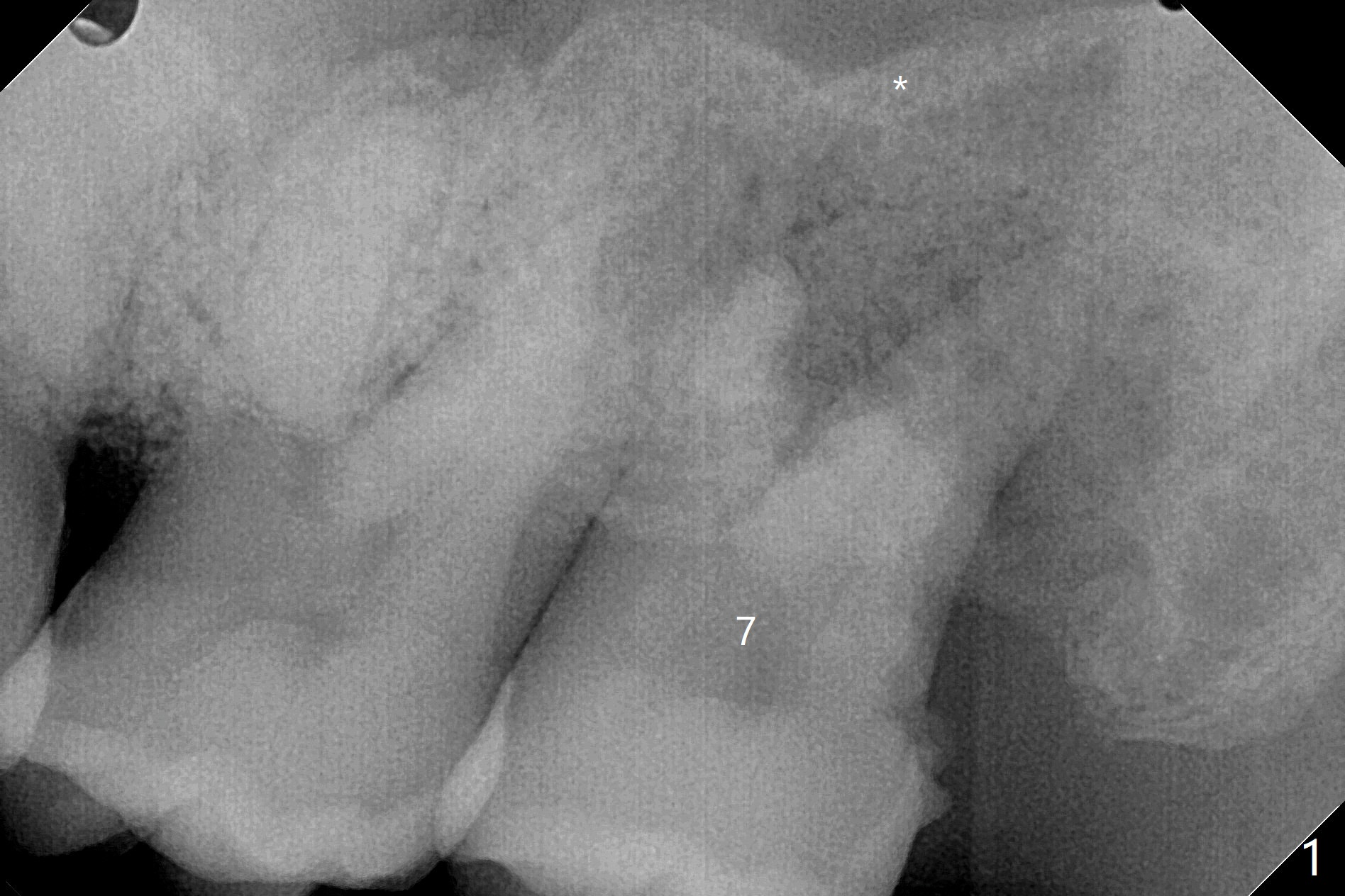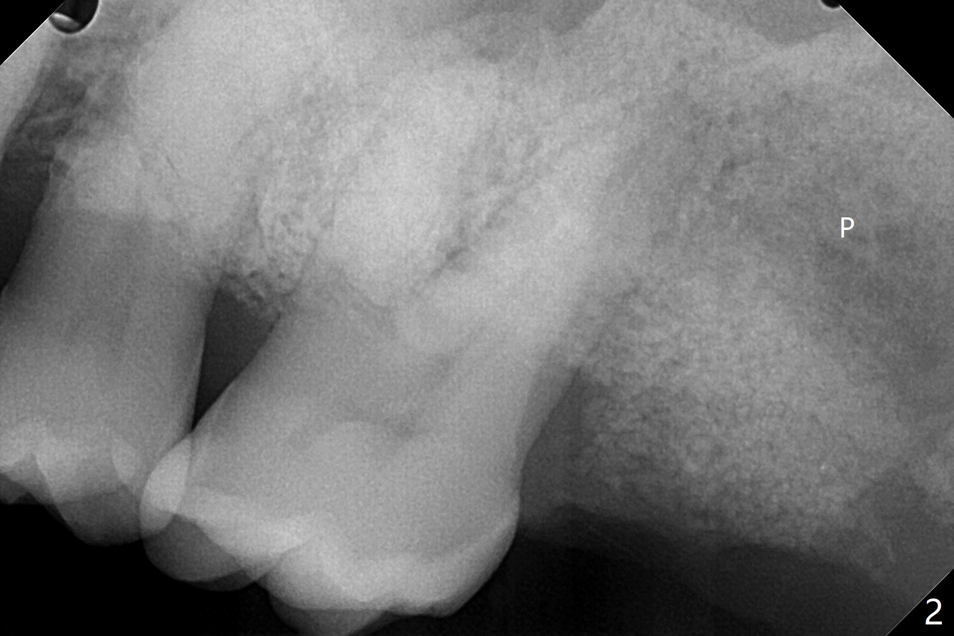 53岁黑男要求拔除松动,剧烈疼痛的左上7(图一(*:上颌窦底板)),同意植骨,分期付款。拔牙后牙槽窝硕大,有许多难以刮除的肉芽组织,出血多,颊侧骨壁应该缺失。在放置GEM21S人工合成骨和异体骨(主要部分)前,在牙槽窝深部放置两个Osteogen塞(图二:P,止血,所谓胶原骨,另外一种人工合成骨),覆盖不可吸收膜,PTFE缝线,间隙保持器,牙周敷料。由于对合牙是智齿,垂直高度有限,放置保持器和敷料有困难。去除炎性肉芽组织,使用两个大小不太带齿刮匙,血管钳,特殊镊子以及带金刚石镊子(图三),反复多次使用自配生理盐水(图四)冲洗。