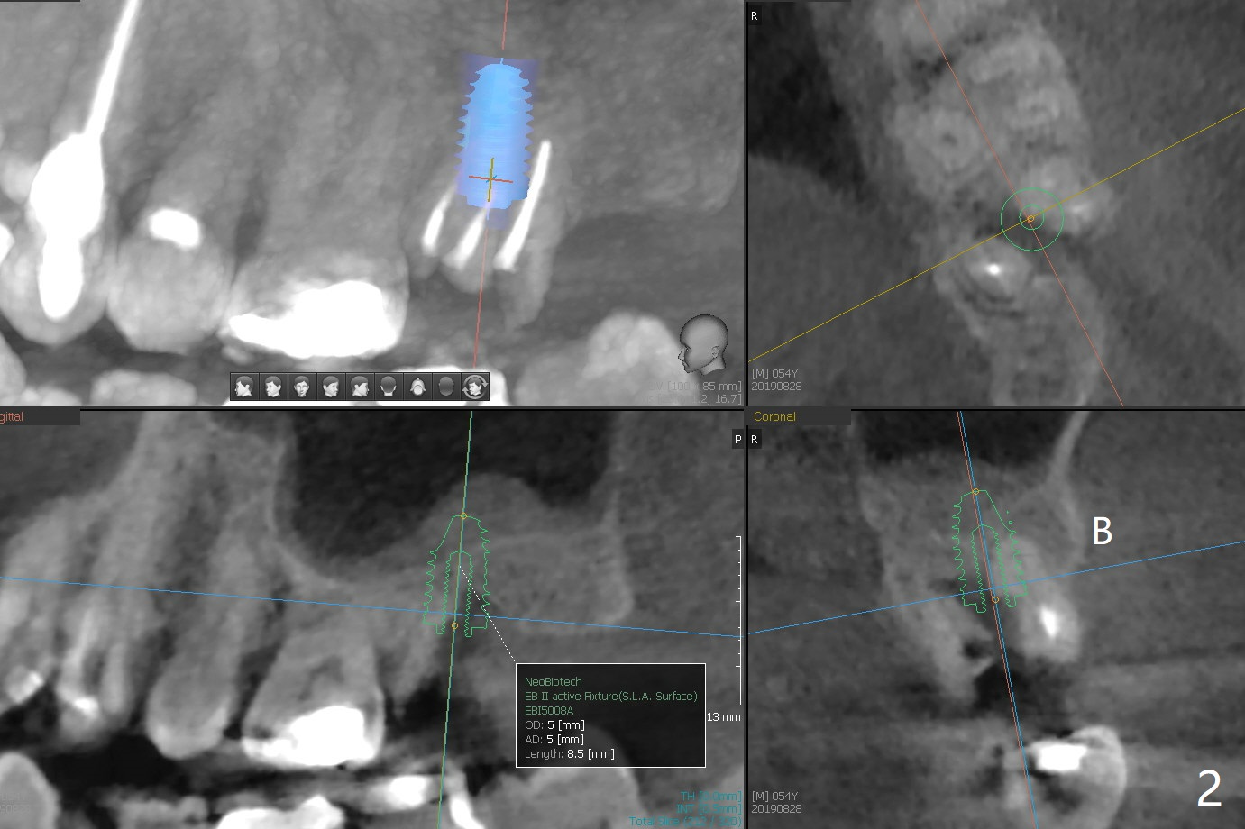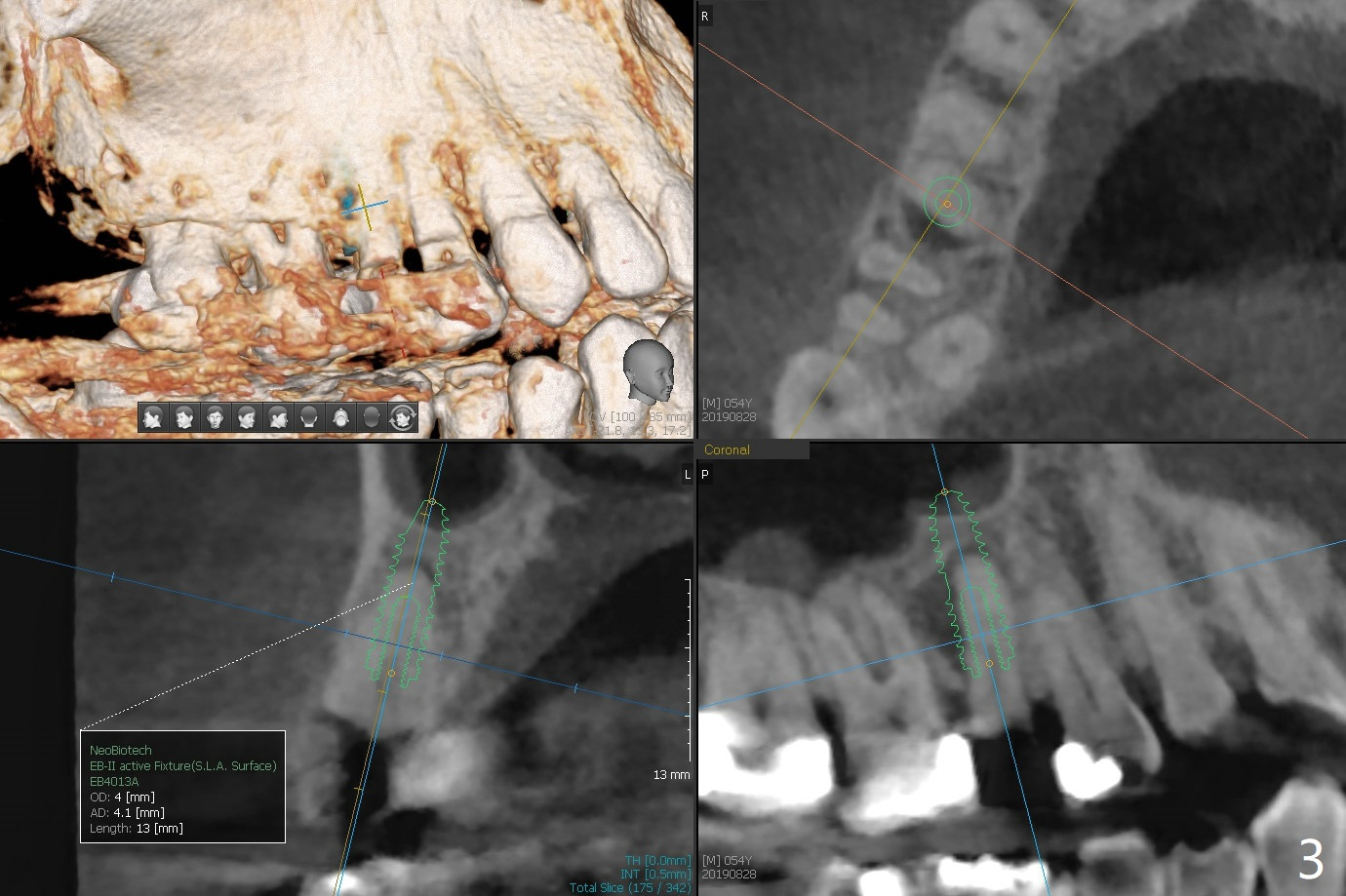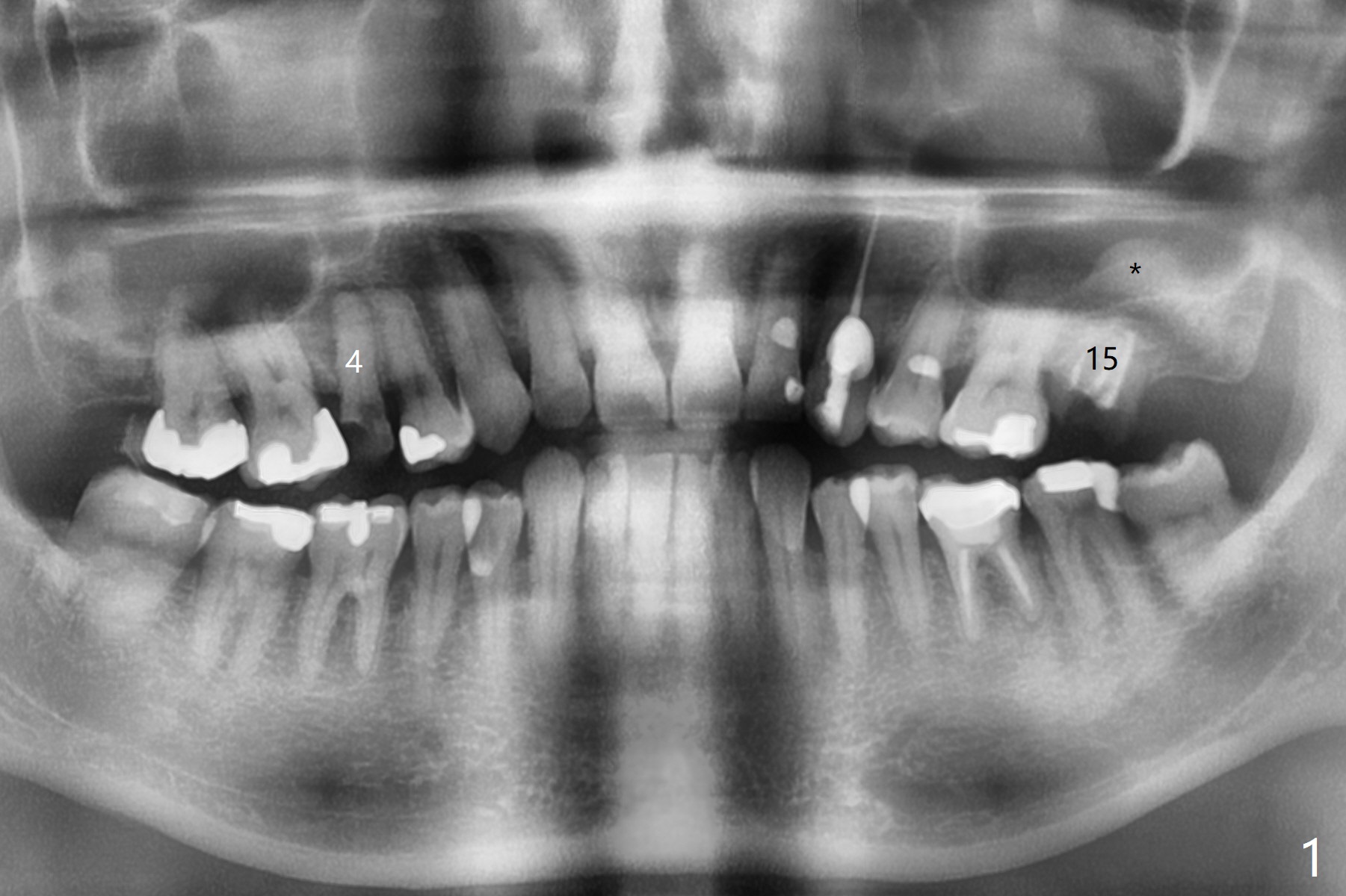 A 54-year-old man (smoker (3-4 cigarettes/day)) has two teeth that need to be replaced by implants (Fig.1). In order not to disturb the mucocele (Fig.1 *) above the tooth #15 to large degree, a short implant will be placed in the septum (not in the buccal socket (not disrupt the short buccal plate), Fig.2). Prepare PRFx1. Double check salvageability of the tooth #4. If needed, a 4.5x13 mm implant will be placed (Fig.3).