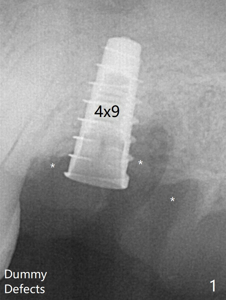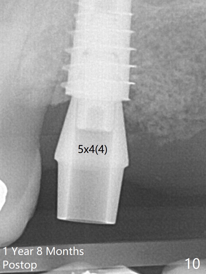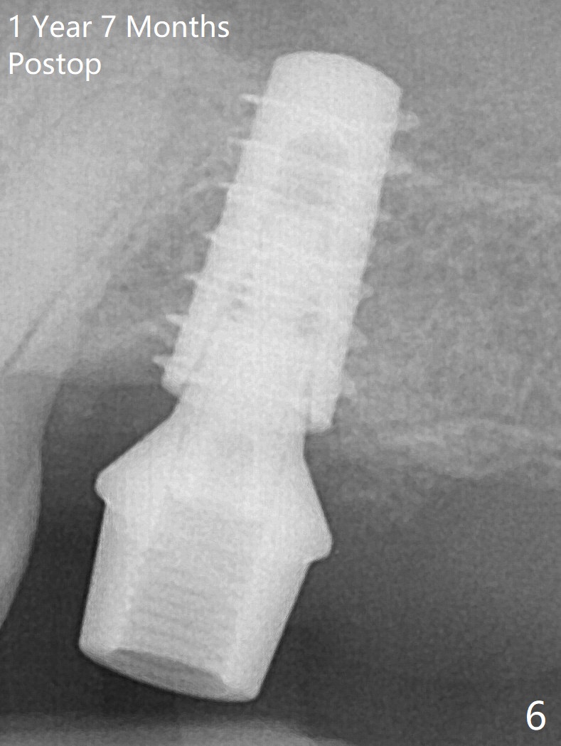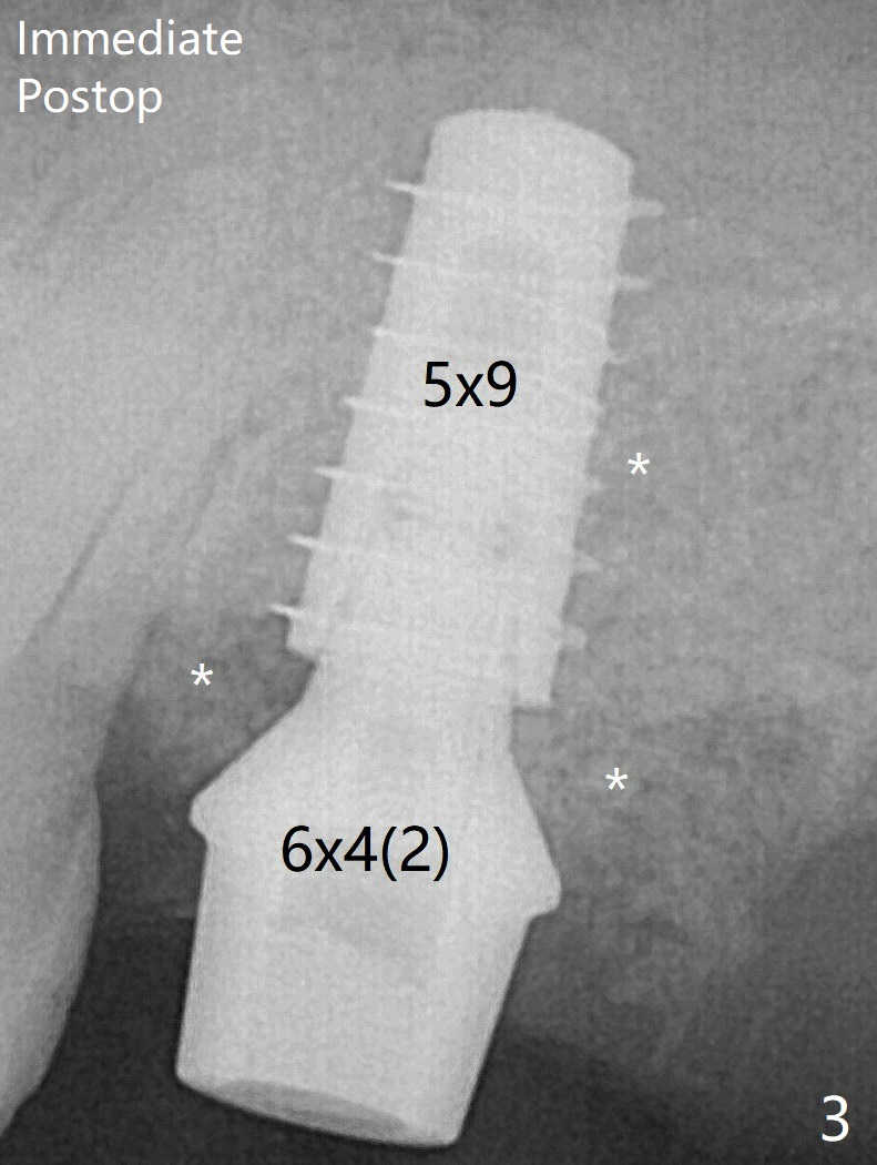 The 3 remaining sockets (Fig.1 *) around the final implant are filled with sticky bone (Fig.2 *). The sockets are non-existing 1 year 7 months and 8 months postop (Fig.6,7 (BW)).
