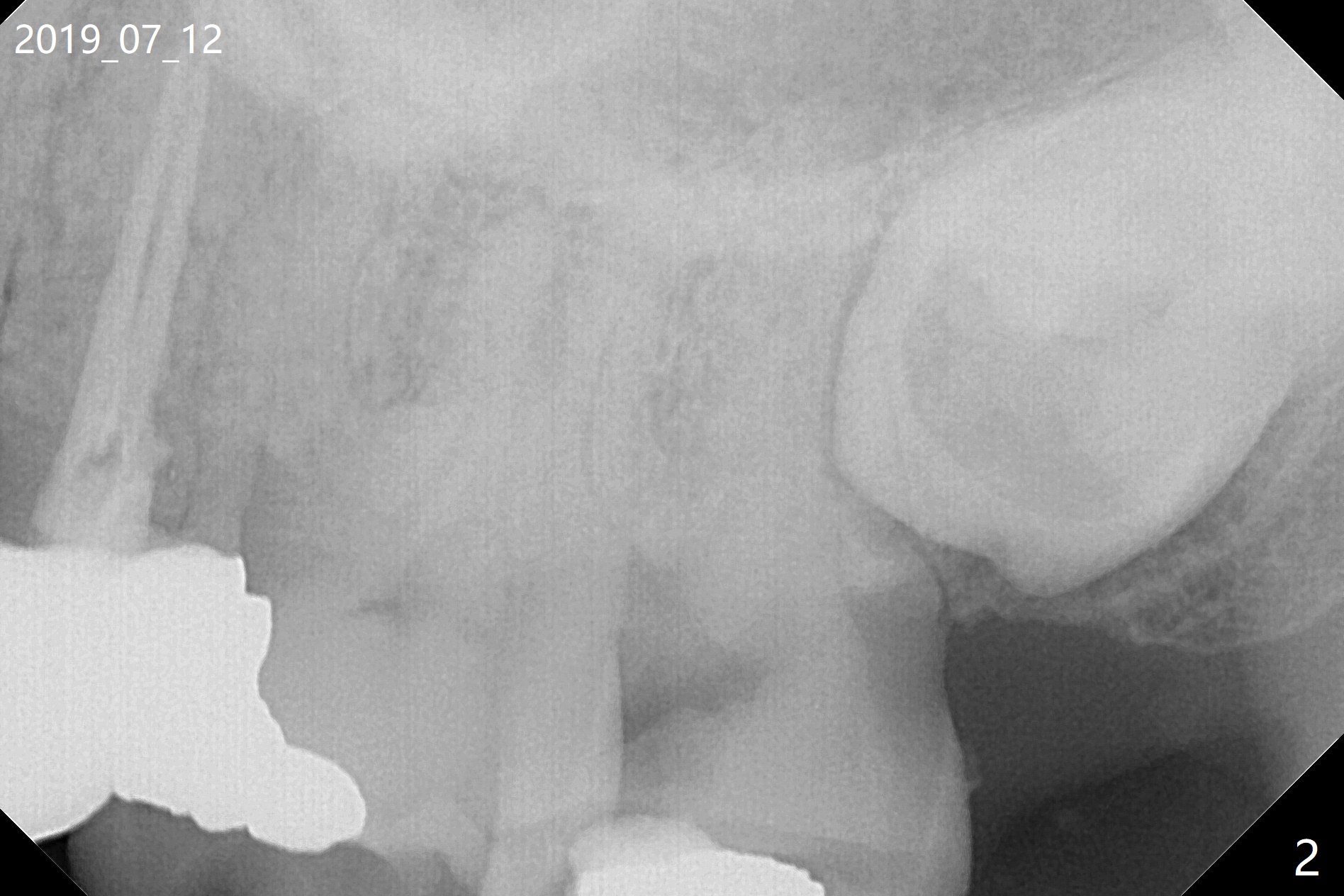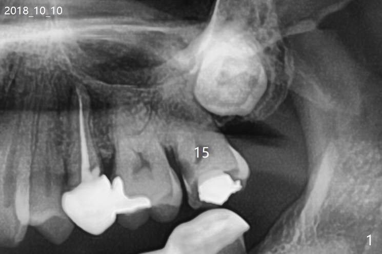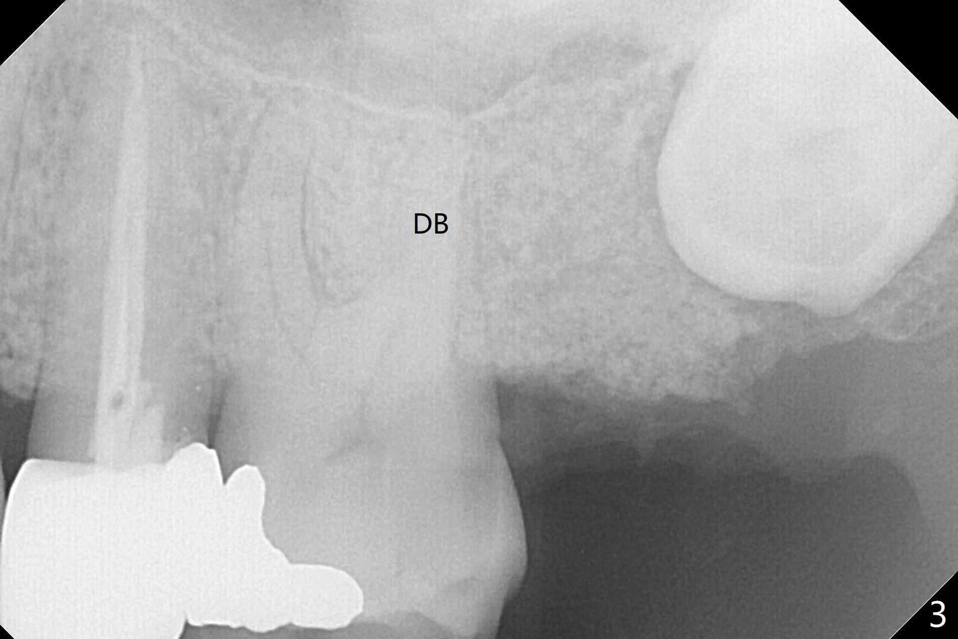 A 62-year-old man returns with acute pulpitis at #15 (Fig.1,2). The caries is confirmed subgingival after debridement. After discussion, the patient agrees with extraction and bone graft, but he does not want to have implant (Fig.3). When he changes his mind, the 3rd molar will be extracted immediately followed by implant placement with guide. Because of the narrow space, the distal surface of the distobuccal root of the 1st molar is exposed when the tooth #15 is extracted. The bone graft will prevent gingival recession of the tooth #14.