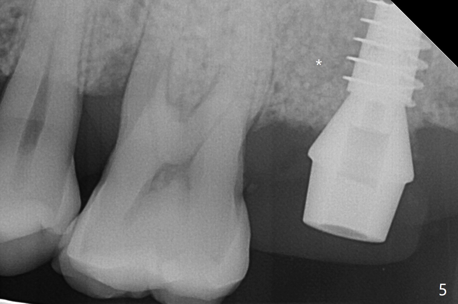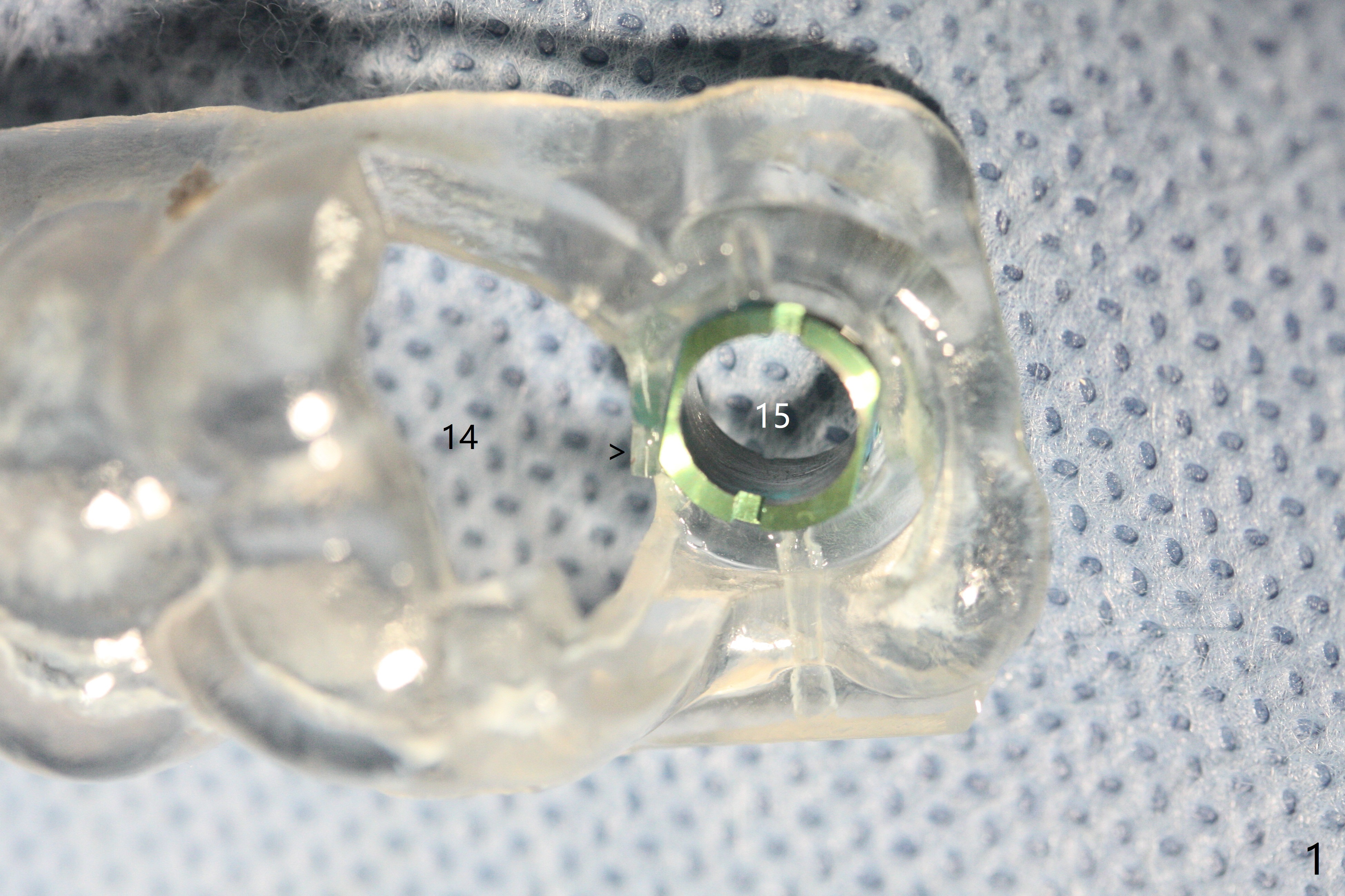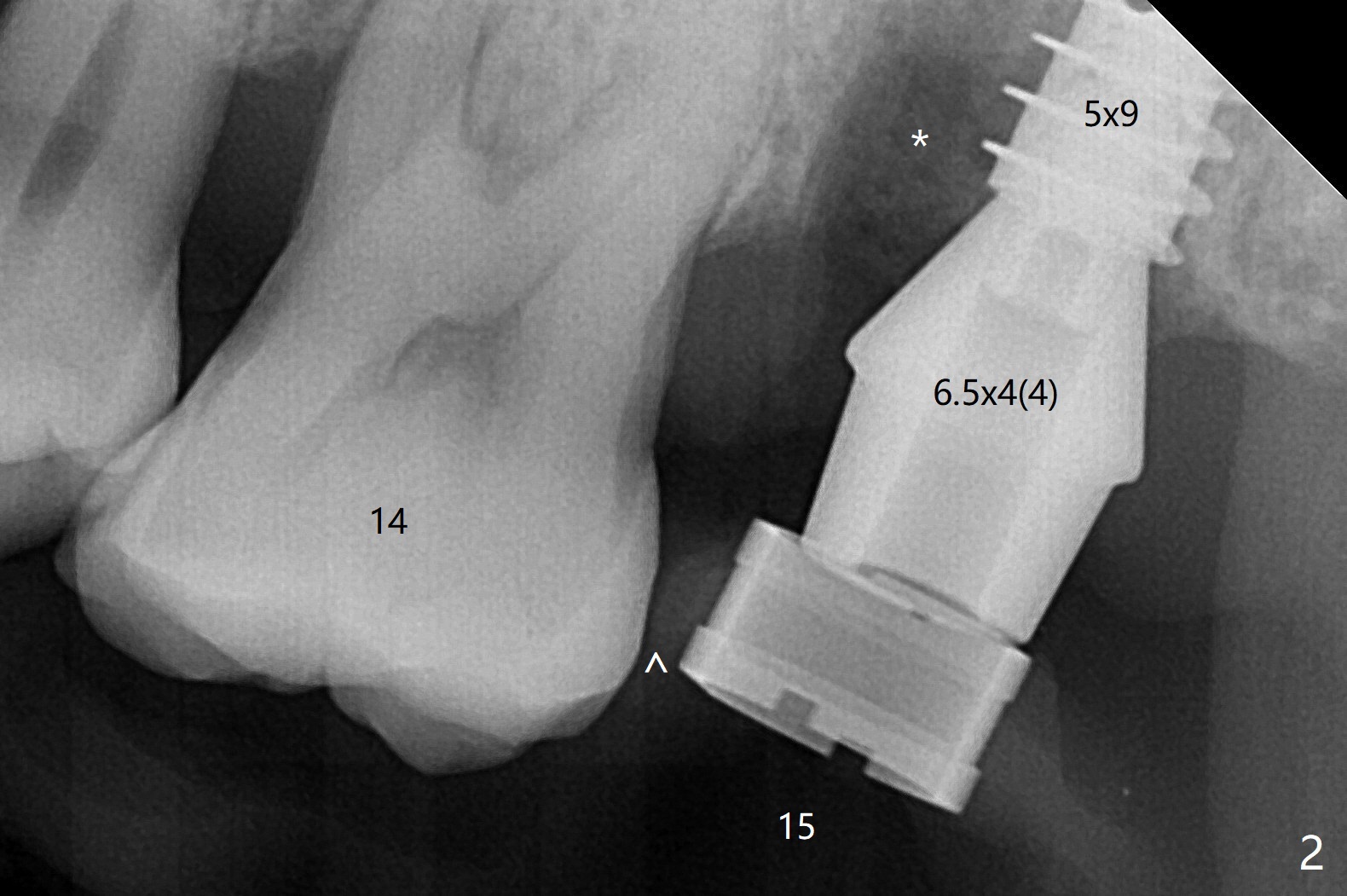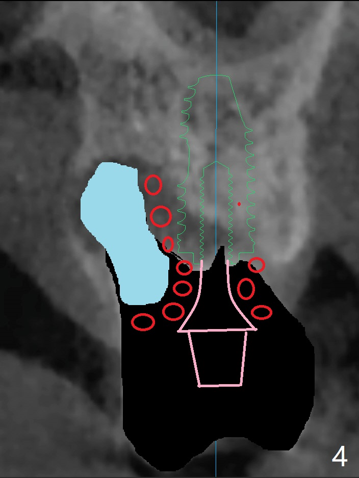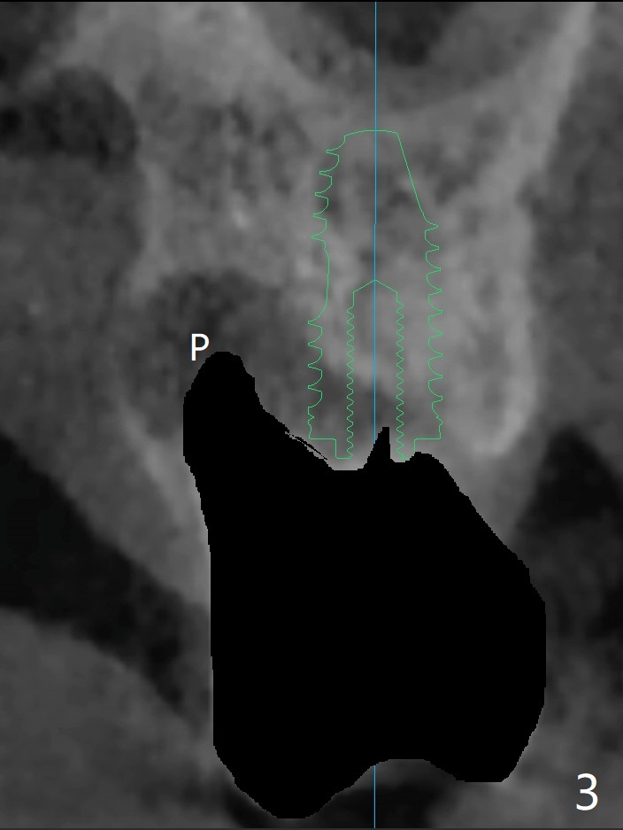 尽管腭侧(P)根周围骨质吸收严重(图三(术前设计)),15号牙拔除还挺困难,因为两个颊侧根骨质吸收不明显,而腭侧根表面许多结石(说明牙周病变)。导板使用中,金属圈脱落,插回后还能用(图一(术后拍摄)),完成种植(图二)。金属圈脱落可能是因为近中塑料太少了(图一,二:箭头)。植体(图四:绿色)和基台(粉红色)放置后,粘性骨粉植骨(红圆圈)前,在腭侧缺失处塞入一块胶原塞(浅蓝色),最后缺损充填完善(图二,五比较(*))。