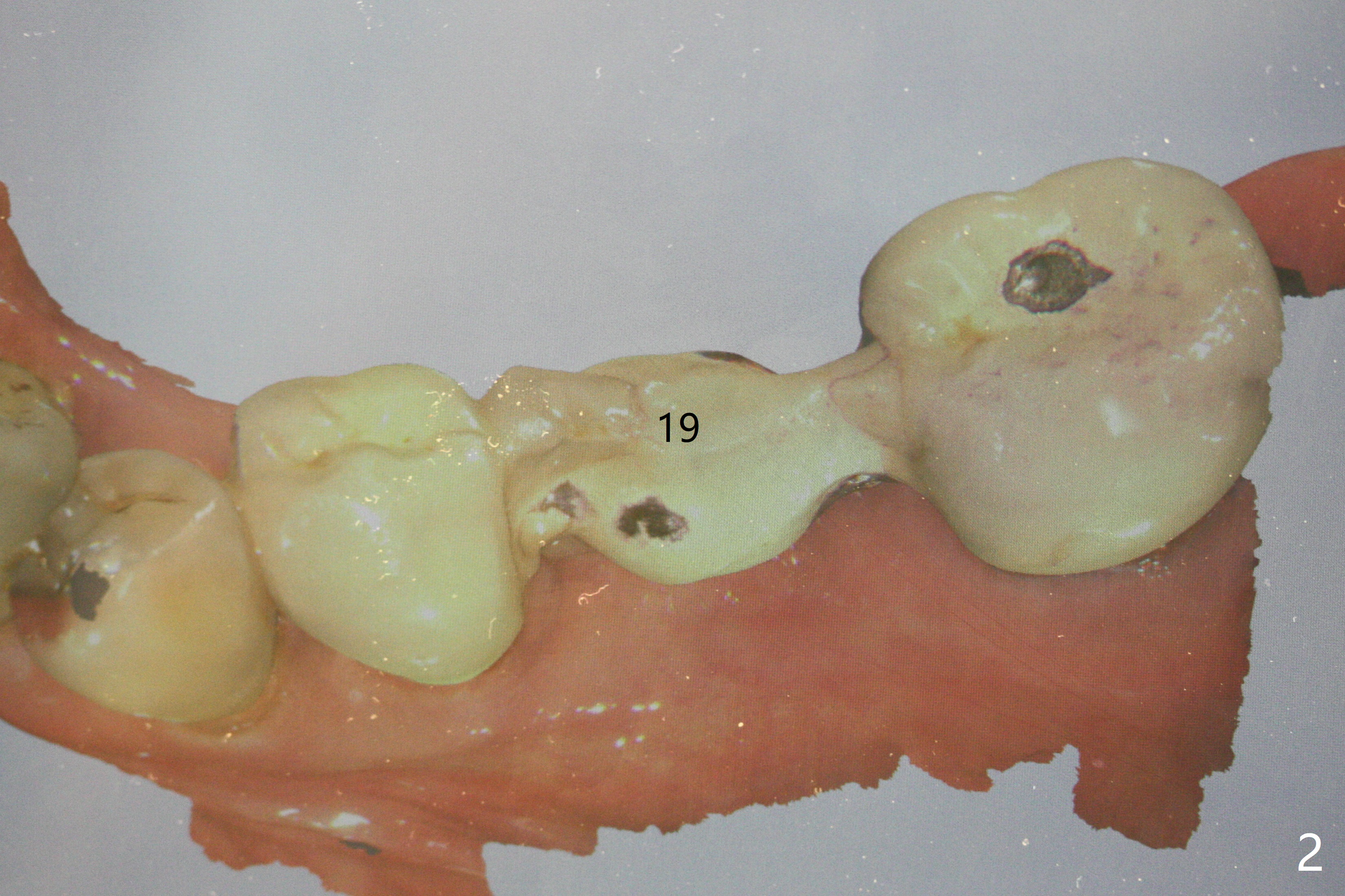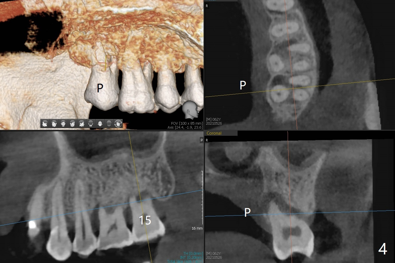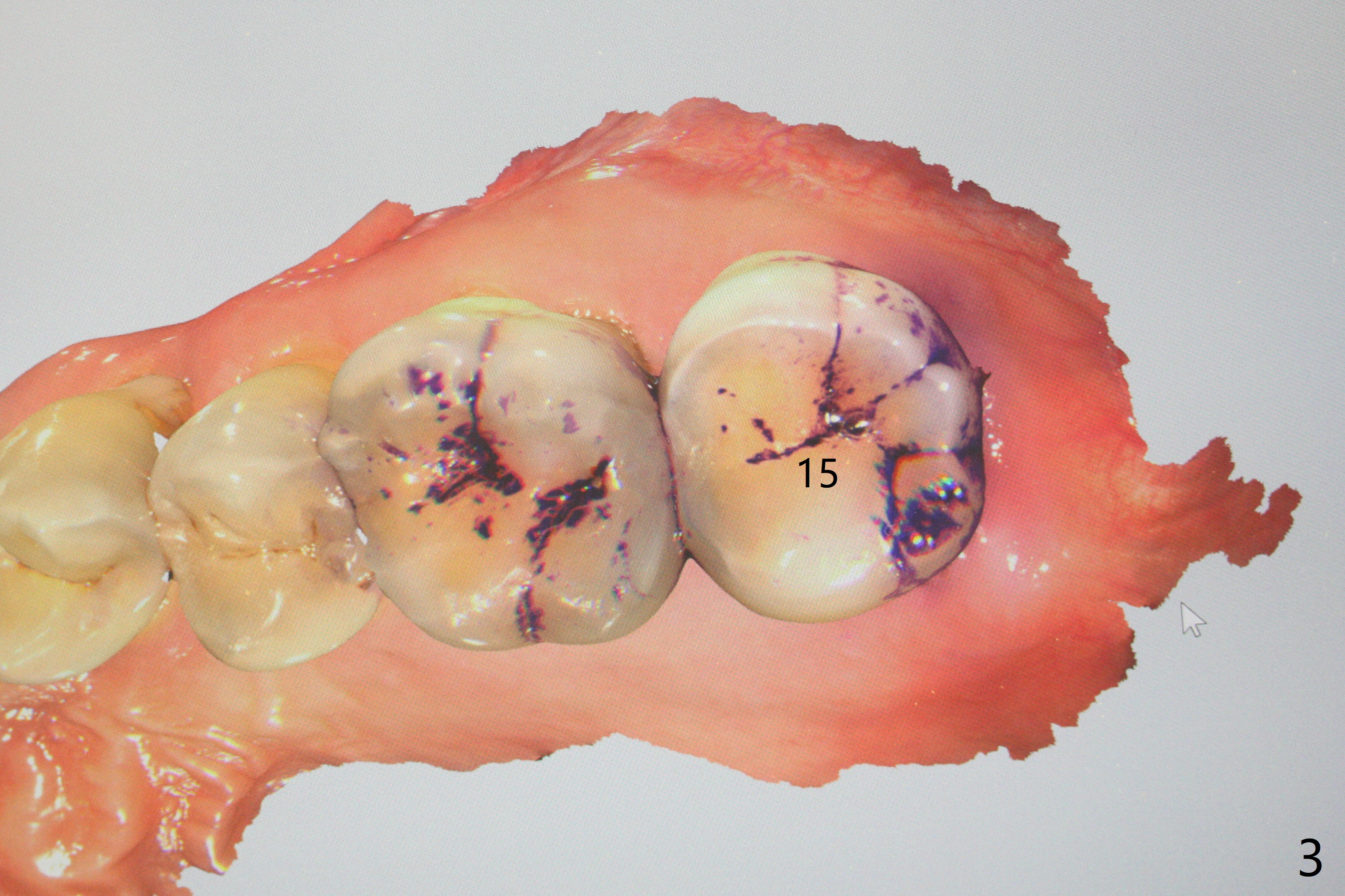 A 62-year-old man with sign of bruxism (#19 porcelain chip (Fig.2), 28 fracture/extraction) complains of severe mastication pain at #15 (Fig.1). More severe pain is elicited when the buccal cusps bite on a bite stick than the palatal one (Fig.3 with suspicious crazing lines). CT shows bone loss around the palatal root (Fig.4 P). A 5x11.5 mm implant will be placed immediately (Fig.5). The bone at #28 is able to hold a 3.5x13 mm implant (Fig.6). It is extremely difficult to take photos for 2nd molar crack line with a regular camera (Fig.3). The Shining Oral Scanner acts additionally as an intraoral camera. As a busy clinician, I do not have time to take photos for #19 porcelain chip. My assistants take over the task. After work, I am able to have bumper harvest. With the information just mentioned, I will be in a better position to present a more comprehensive treatment plan to the patient when treatment at #15 is finished: remove #18-20 bridge, place an implant at #19 and fabricate new crowns at #18 and 20.