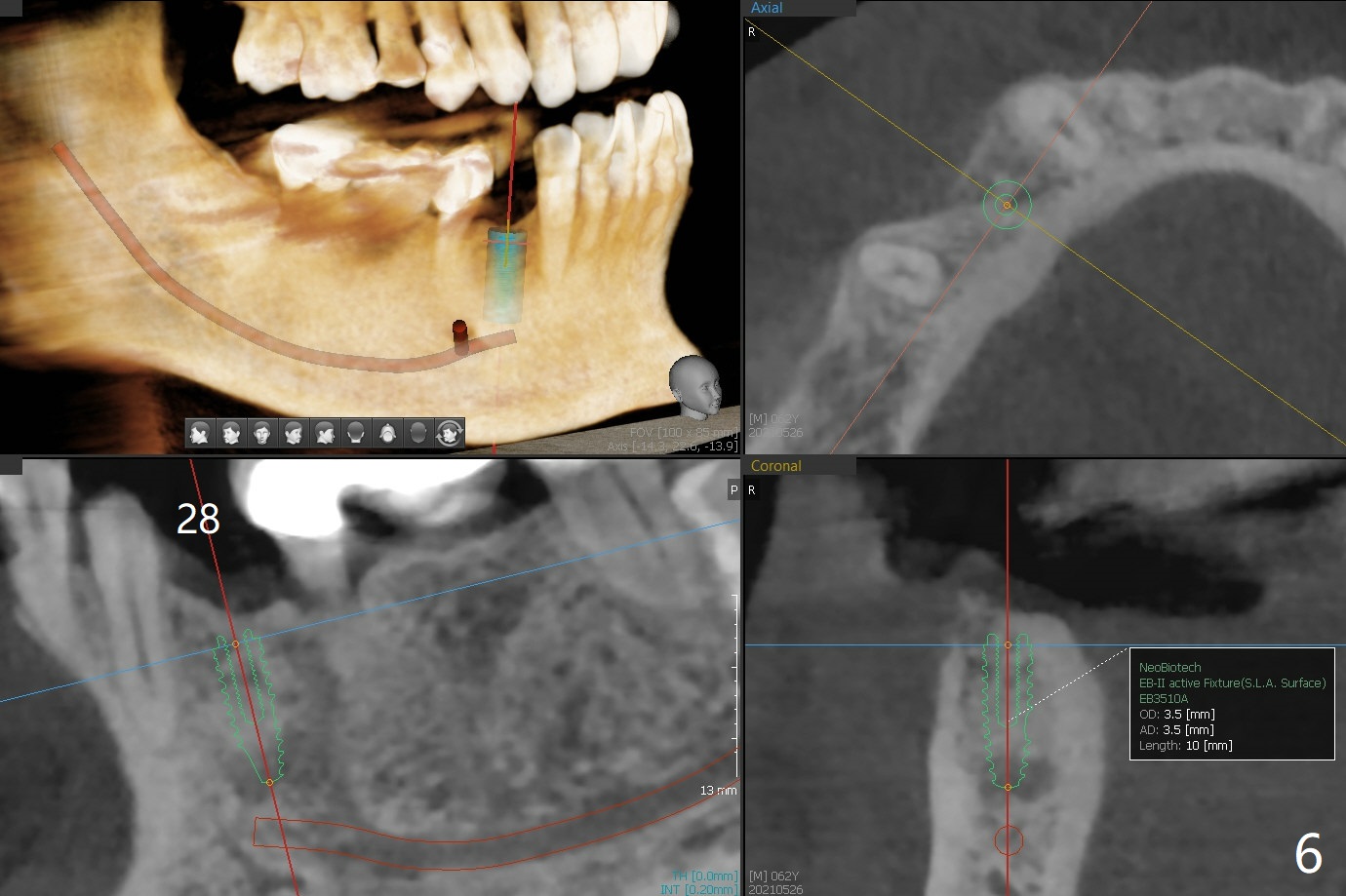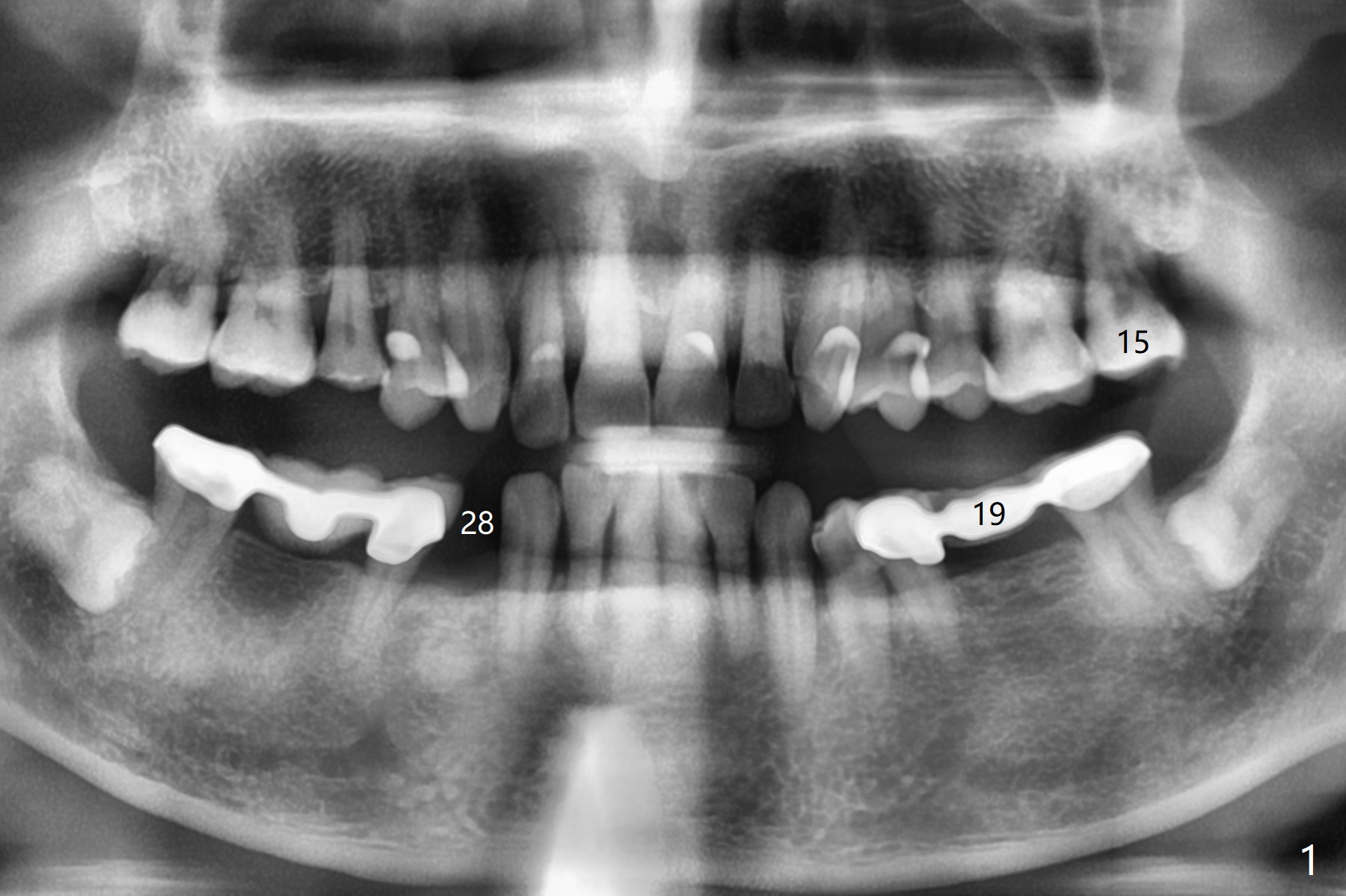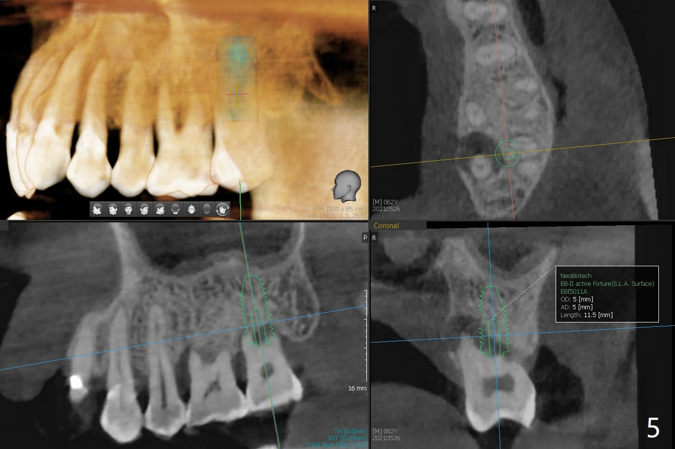 A 62-year-old man with sign of bruxism (#19 porcelain chip (Fig.2), 28 fracture/extraction) complains of severe mastication pain at #15 (Fig.1). More severe pain is elicited when the buccal cusps bite on a bite stick than the palatal one (Fig.3 with suspicious crazing lines). CT shows bone loss around the palatal root (Fig.4 P). A 5x11.5 mm implant will be placed immediately (Fig.5). The bone at #28 is able to hold a 3.5x13 mm implant (Fig.6). It is extremely difficult to take photos for 2nd molar crack line with a regular camera (Fig.3). The Shining Oral Scanner acts additionally as an intraoral camera. As a busy clinician, I do not have time to take photos for #19 porcelain chip. My assistants take over the task. After work, I am able to have bumper harvest. With the information just mentioned, I will be in a better position to present a more comprehensive treatment plan to the patient when treatment at #15 is finished: remove #18-20 bridge, place an implant at #19 and fabricate new crowns at #18 and 20.
