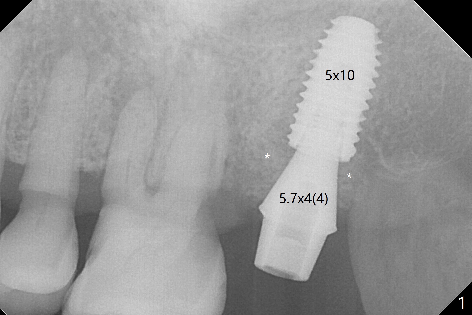 The 80-year-old woman returns for #15 extraction and immediate implant 7 months after guide fabrication. The palatal root is separated from the remaining tooth. The guide seems to be fit. The implant appears to be placed palatal with ~ 15 Ncm; a 5.7x4(4) mm abutment placed before and after bone graft (Fig.1 *). An immediate provisional is fabricated.