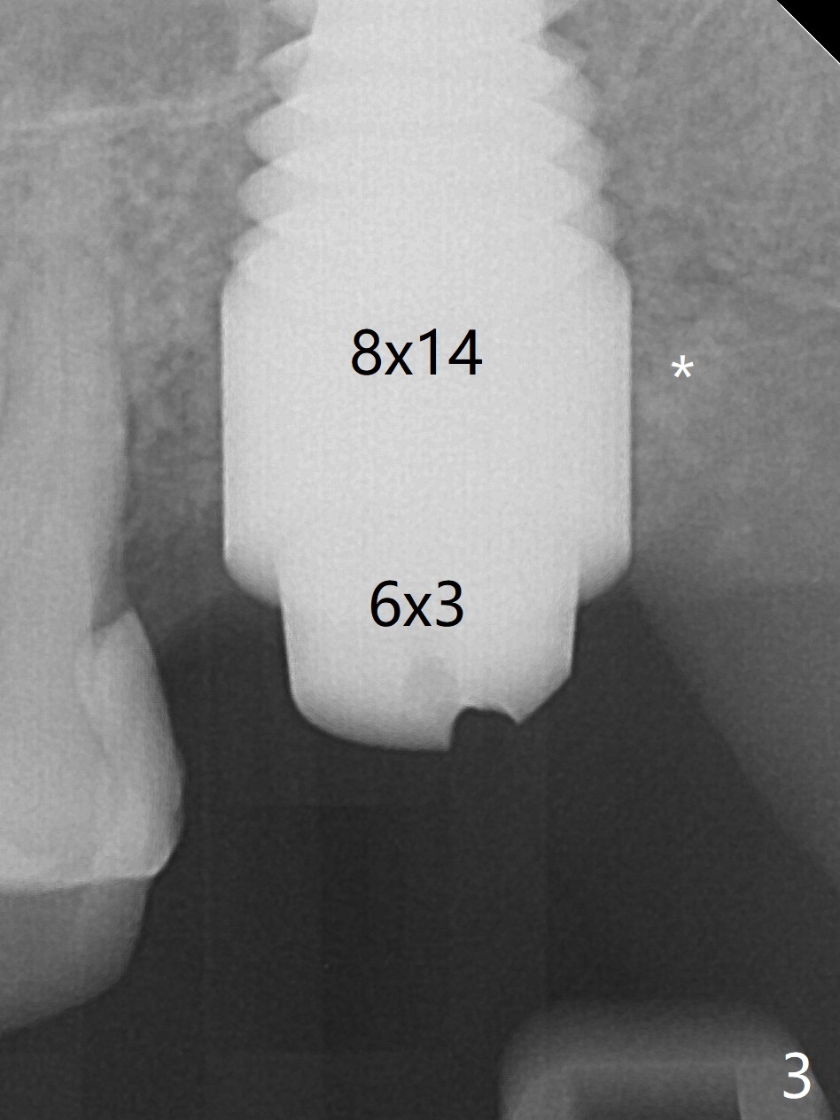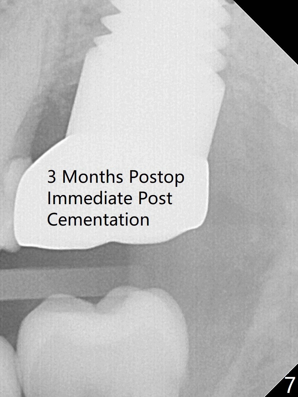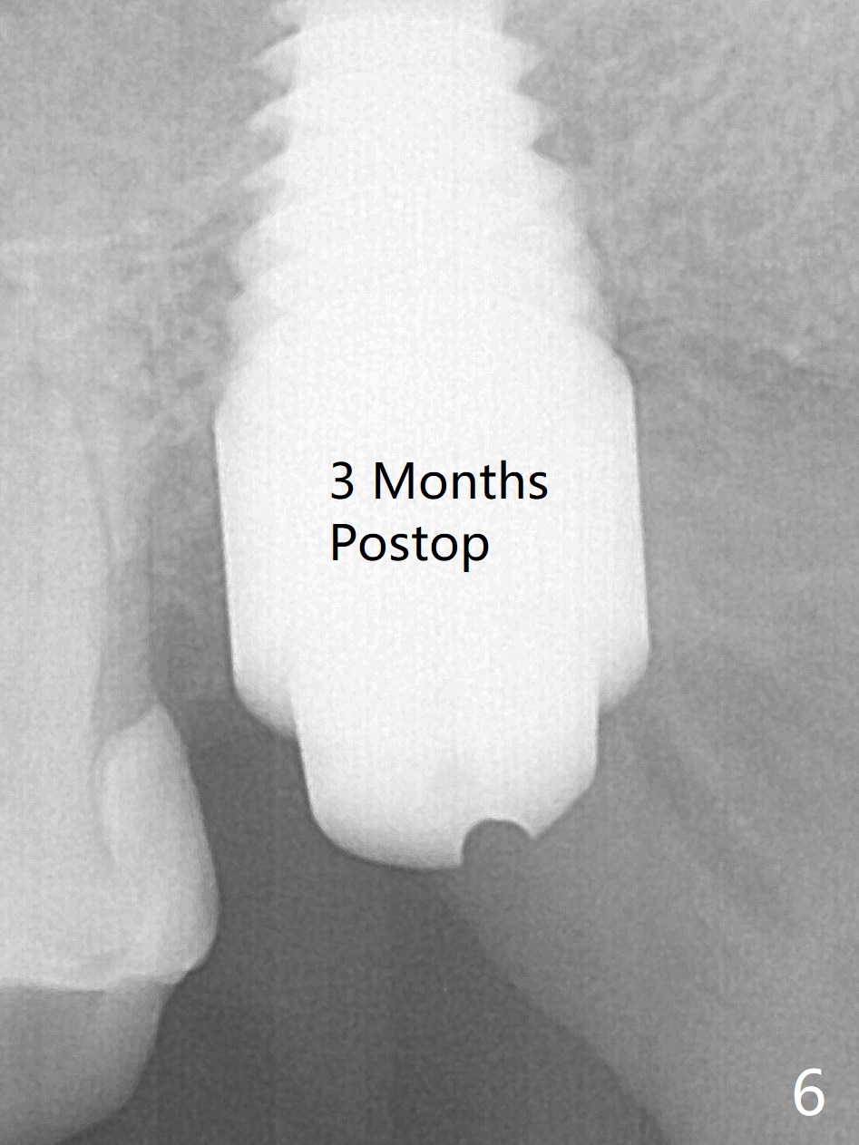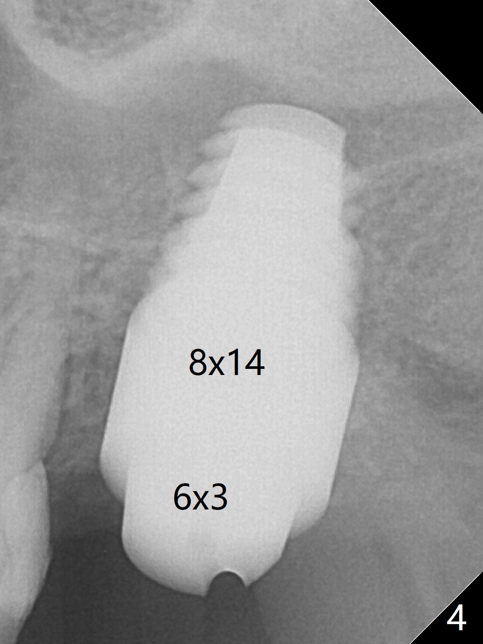 A 56-year-old woman has sign of periimplantitis 2 years 9 months post cementation. After incision, the 5.5x13 mm bone-level implant is ~ 3 mm inferior to the buccal crest. The implant is removed with 7/6 mm trephine bur, elevator and implant driver. The sinus membrane perforates. A 8x17 mm tap achieves stability (Fig.1), but the peripheral bone seems to be thin. Although a 7x14 mm tissue-level implant has stability, it is placed too deep (Fig.2). Following insertion of a piece of Osteogen plug for sinus membrane repair, a 8x14 mm implant is placed with >40 Ncm with allograft placed around the unpolished portion of the implant (Fig.3,4). A 6x3 mm abutment is placed to hold periodontal dressing in place. Because of the abutment with a slot (Fig.5 A), the periodontal dressing remains in place 4 days postop before the patient travels back home for 4 hours. In fact there is no postop sinus infection; the implant threads seems not be exposed 3 months postop (Fig.6). Because of the large implant, it is loaded early (Fig.7, 8 (Temp Bond)). Upper Molar Immediate Implant, Trajectory II 劈开术 Xin Wei, DDS, PhD, MS 1st edition 08/09/2019, last revision 04/11/2021