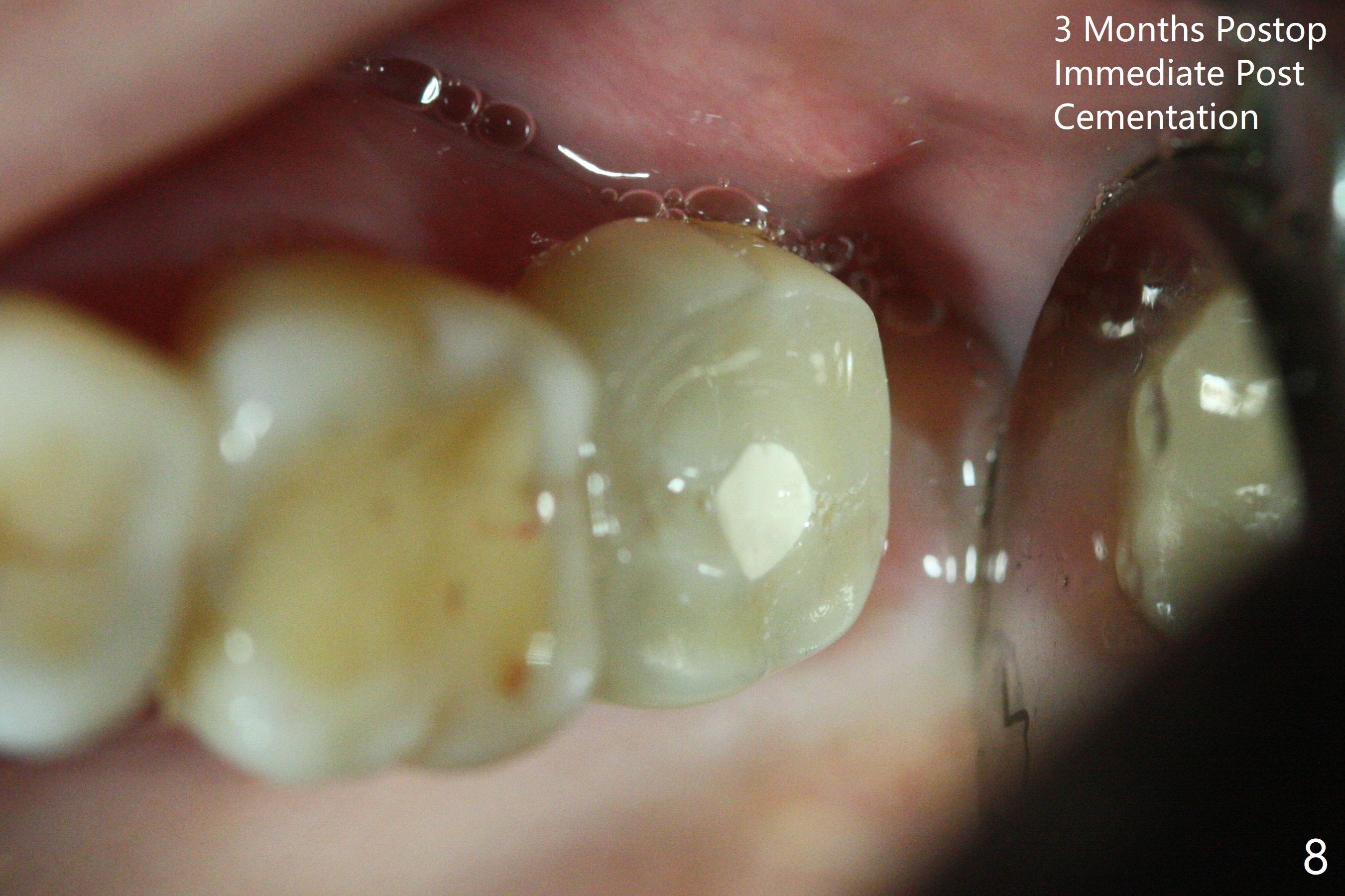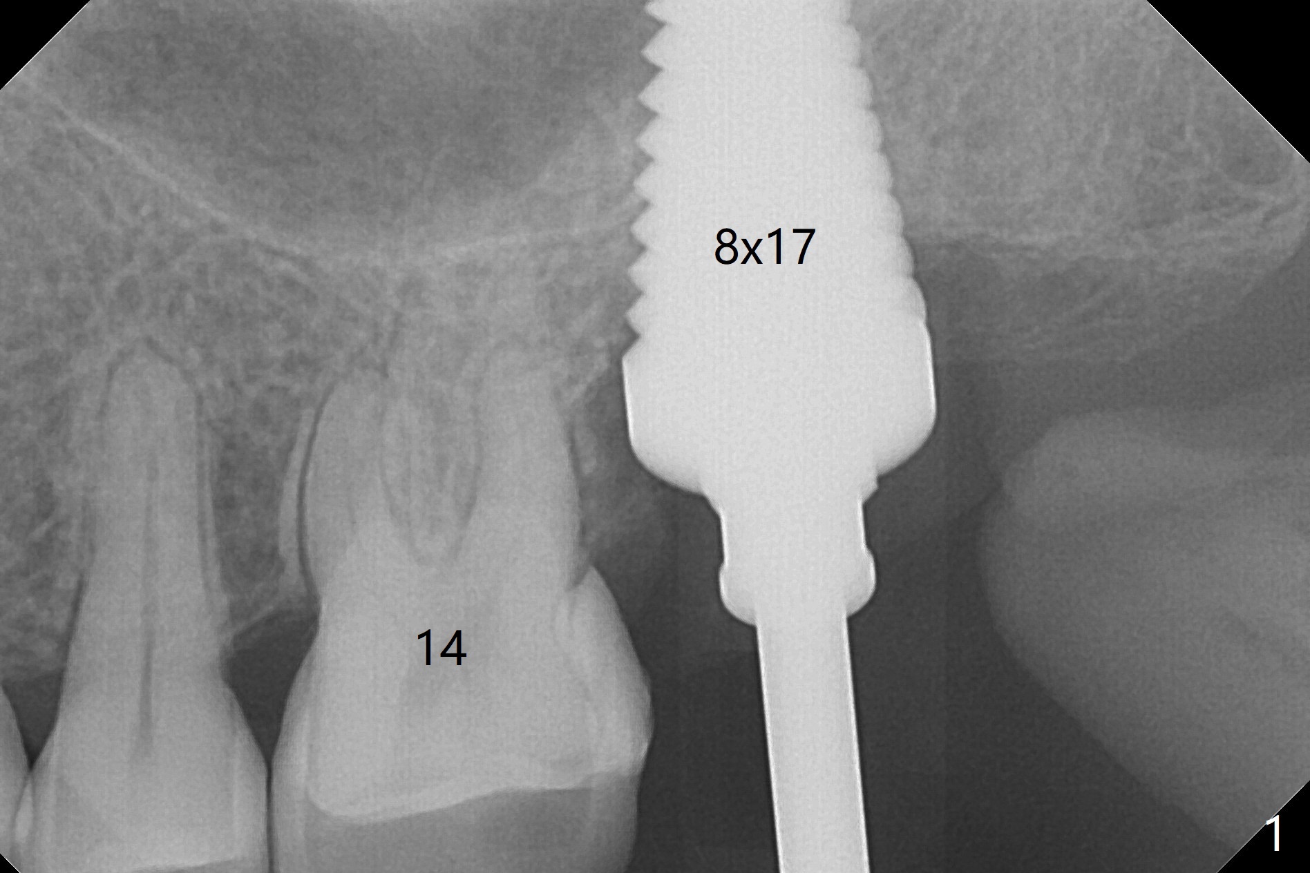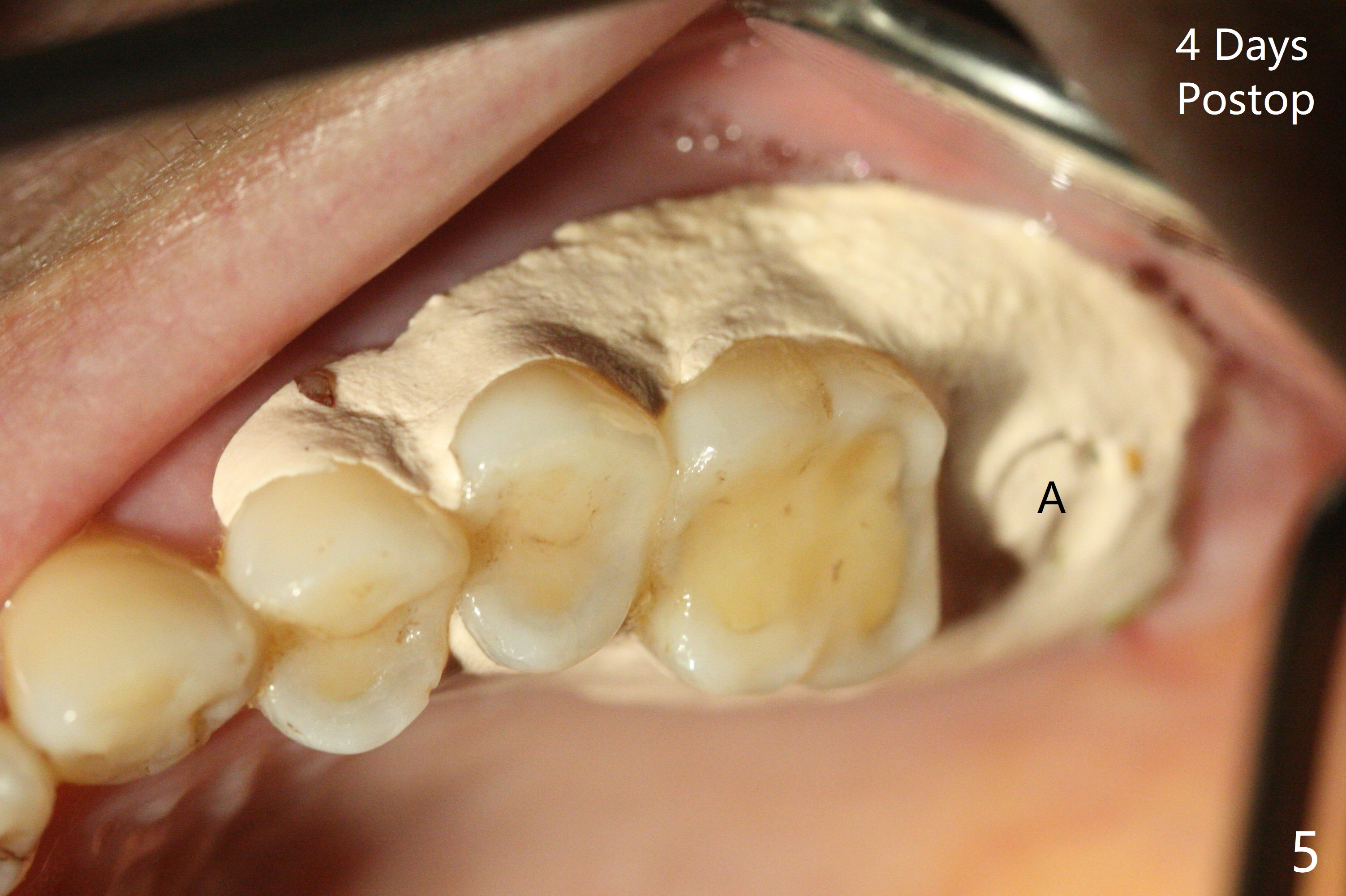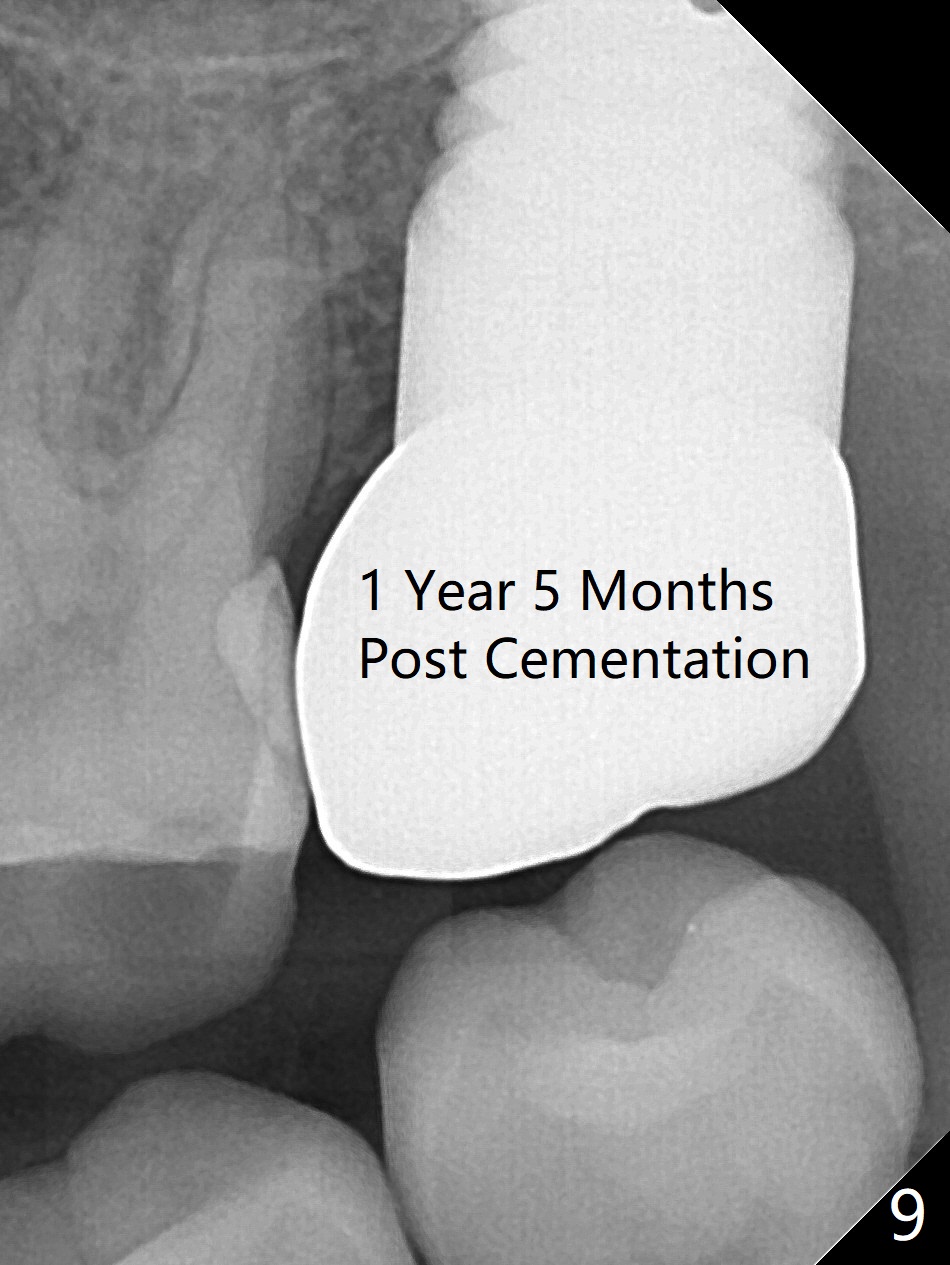 A 56-year-old woman has sign of periimplantitis 2 years 9 months post cementation. After incision, the 5.5x13 mm bone-level implant is ~ 3 mm inferior to the buccal crest. The implant is removed with 7/6 mm trephine bur, elevator and implant driver. The sinus membrane perforates. A 8x17 mm tap achieves stability (Fig.1), but the peripheral bone seems to be thin. Although a 7x14 mm tissue-level implant has stability, it is placed too deep (Fig.2). Following insertion of a piece of Osteogen plug for sinus membrane repair, a 8x14 mm implant is placed with >40 Ncm with allograft placed around the unpolished portion of the implant (Fig.3,4). A 6x3 mm abutment is placed to hold periodontal dressing in place. Because of the abutment with a slot (Fig.5 A), the periodontal dressing remains in place 4 days postop before the patient travels back home for 4 hours. In fact there is no postop sinus infection; the implant threads seems not be exposed 3 months postop (Fig.6). Because of the large implant, it is loaded early (Fig.7, 8 (Temp Bond)). Upper Molar Immediate Implant, Trajectory II 劈开术 Xin Wei, DDS, PhD, MS 1st edition 08/09/2019, last revision 04/11/2021