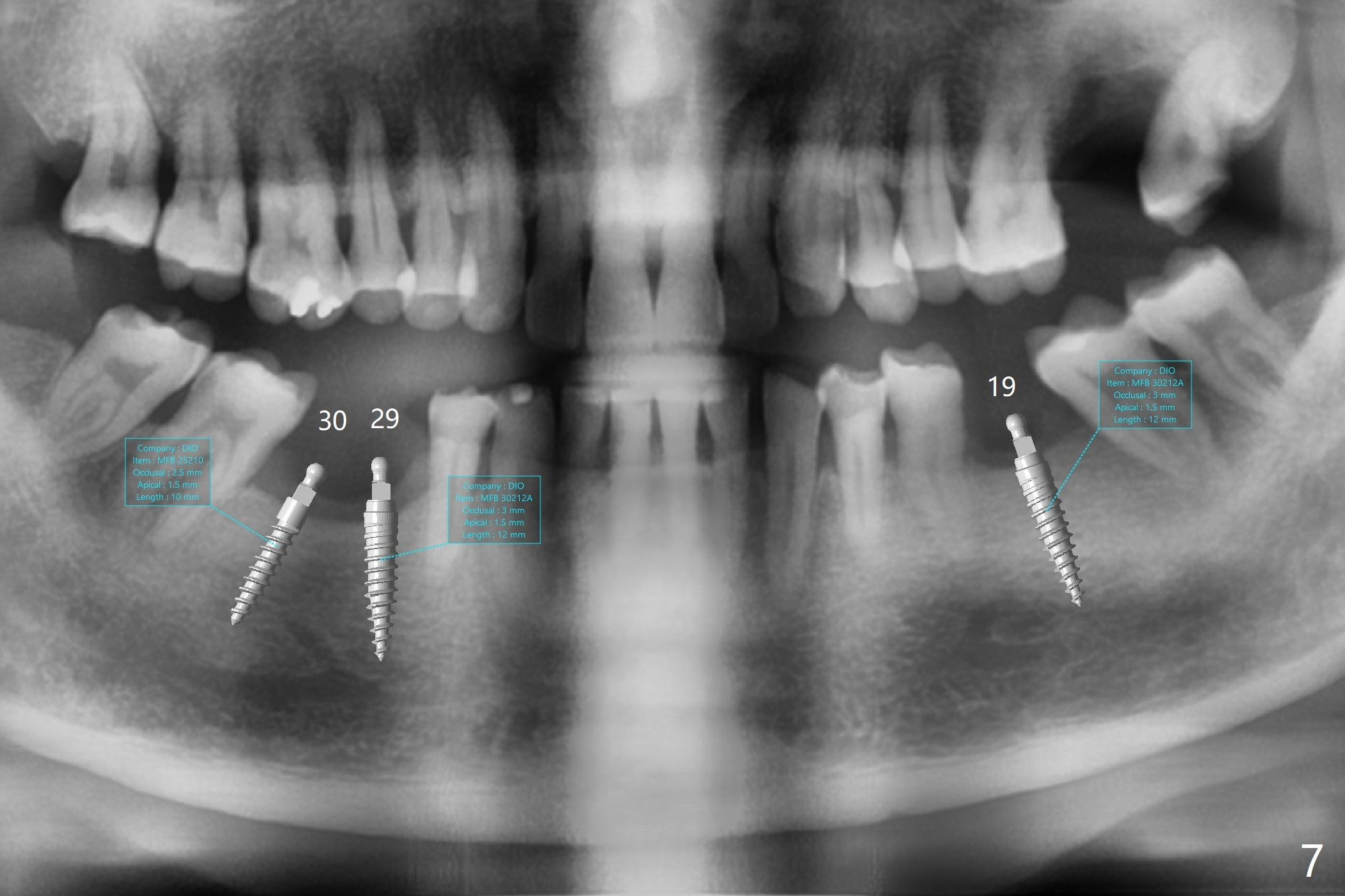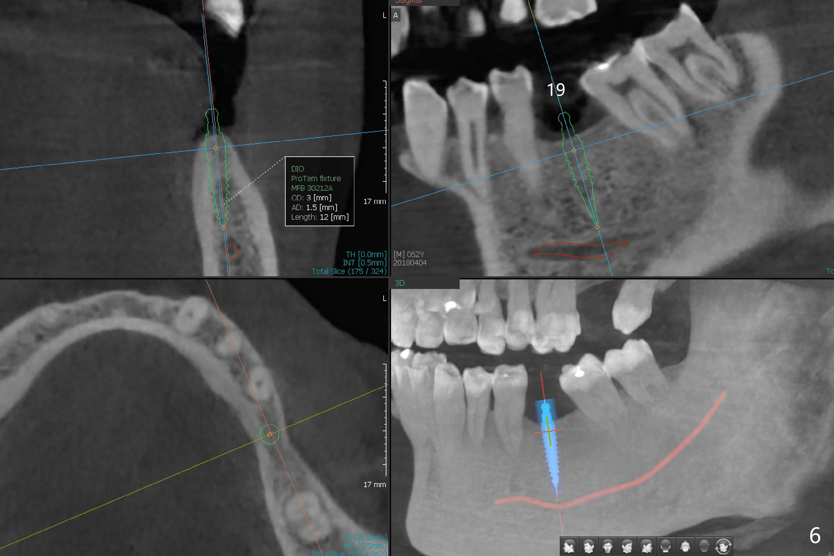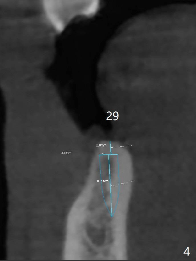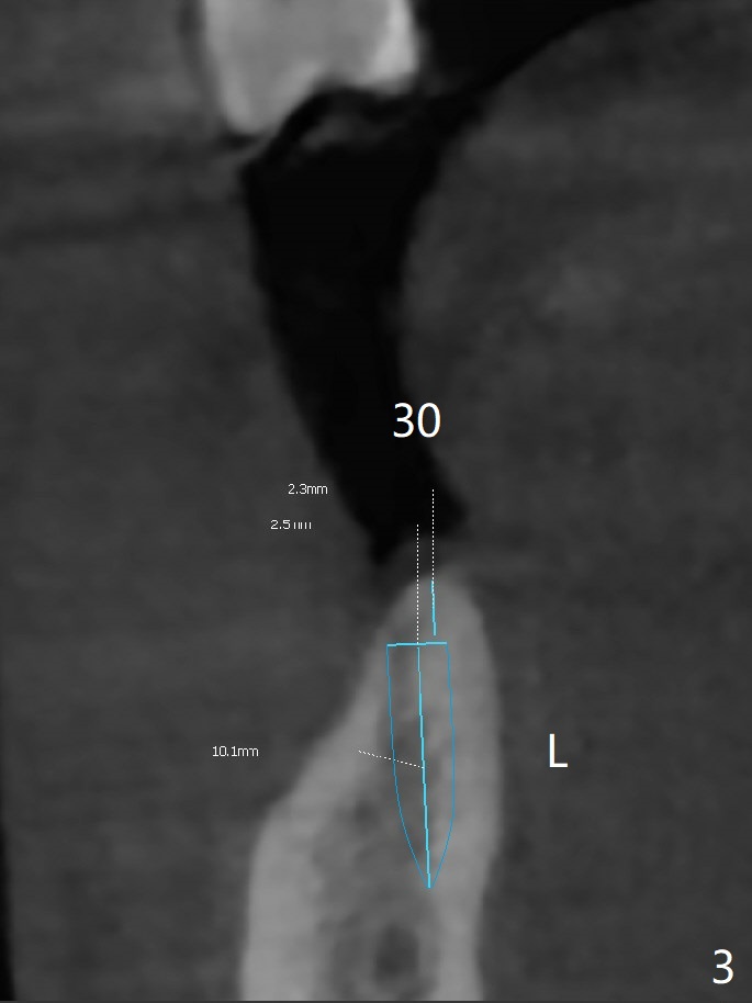The patient would like to have implants to replace the lower RPD if the 1st surgery turns out to be successful. Due to the presence of the Mental Loop (Fig.1 red dashed line) and thin bone at #29 and 30 (Fig.3,4), 1-piece implants seem to be a good option. A 2-piece implant can be placed at #19 (Fig.5). After cementation of #15 implant crown, reanalysis of CT reveals that a 3x12 mm 1-piece implant is more appropriate at #19 with a space less than a premolar (Fig.6). With 2 of narrow short implants at #29 and 30, violation of the Mental Loop is less likely to happen than a single one in the middle of the edentulous area (Fig.7).