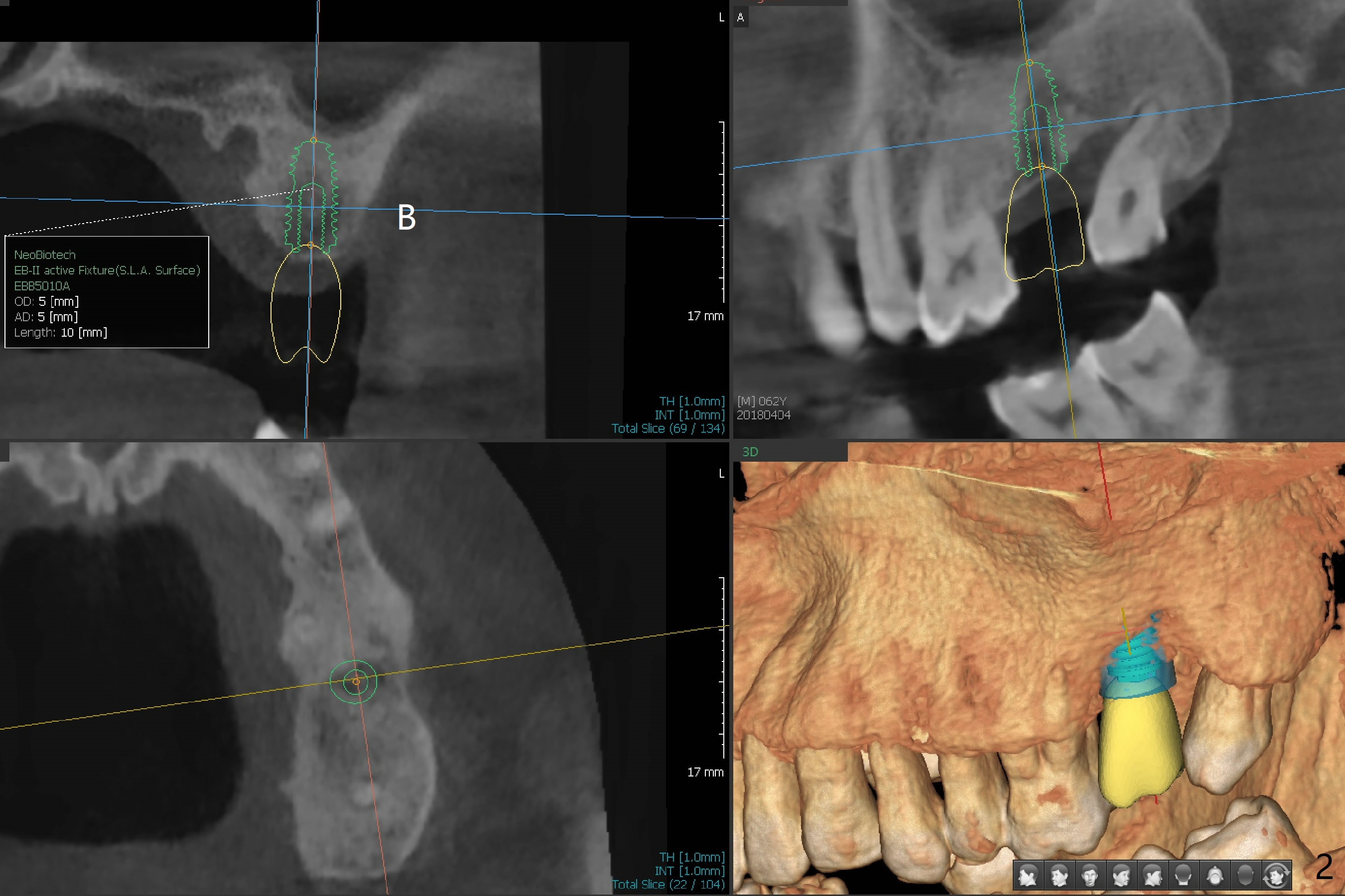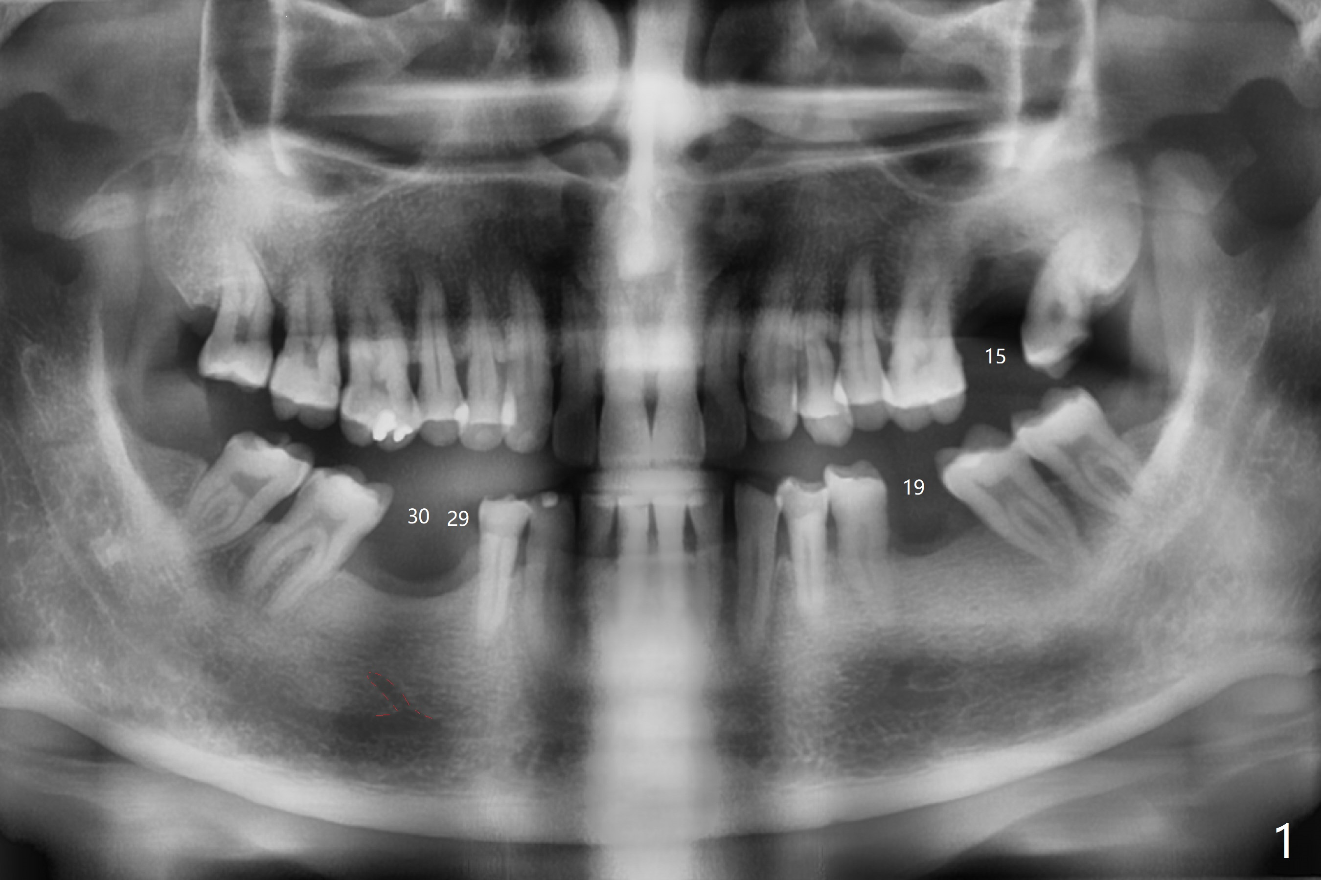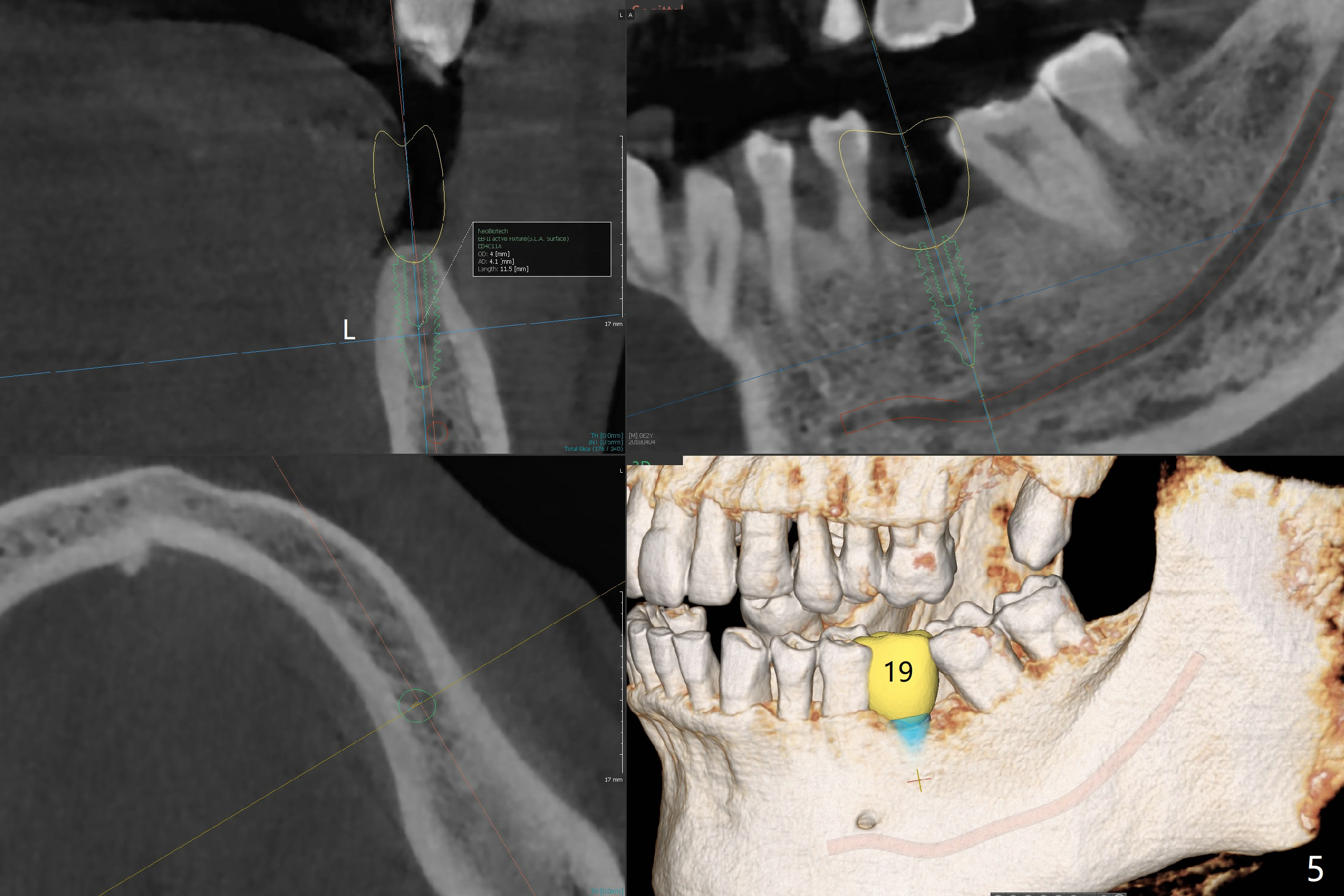 The patient would like to have implants to replace the lower RPD if the 1st surgery turns out to be successful. Due to the presence of the Mental Loop (Fig.1 red dashed line) and thin bone at #29 and 30 (Fig.3,4), 1-piece implants seem to be a good option. A 2-piece implant can be placed at #19 (Fig.5). After cementation of #15 implant crown, reanalysis of CT reveals that a 3x12 mm 1-piece implant is more appropriate at #19 with a space less than a premolar (Fig.6). With 2 of narrow short implants at #29 and 30, violation of the Mental Loop is less likely to happen than a single one in the middle of the edentulous area (Fig.7).