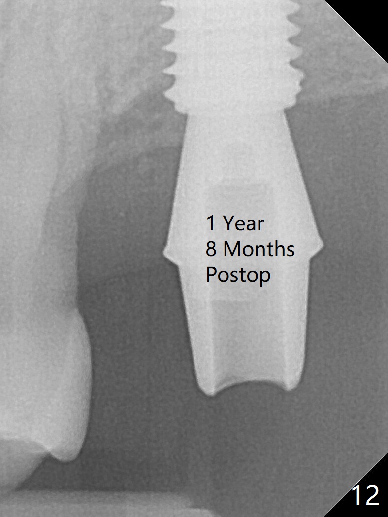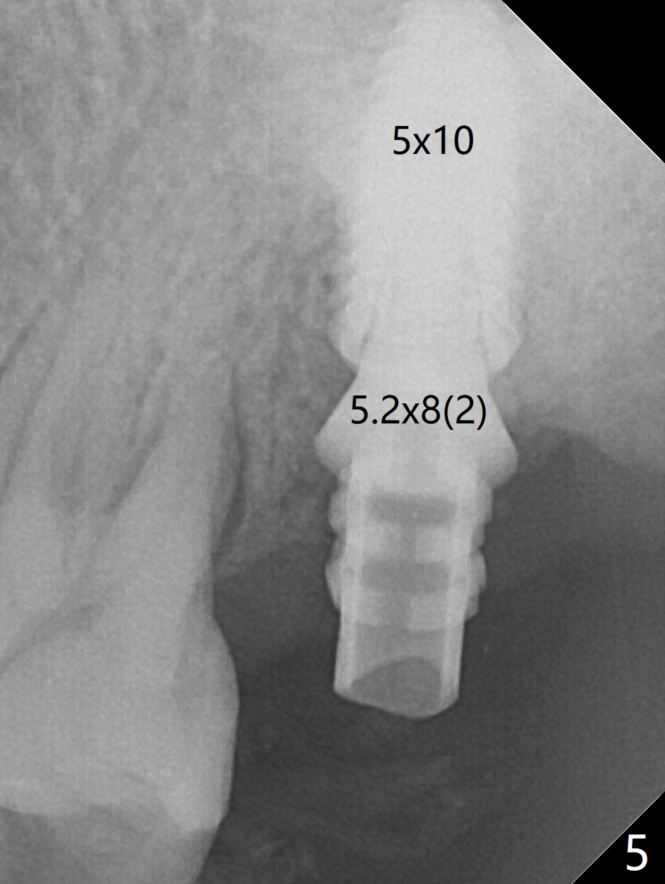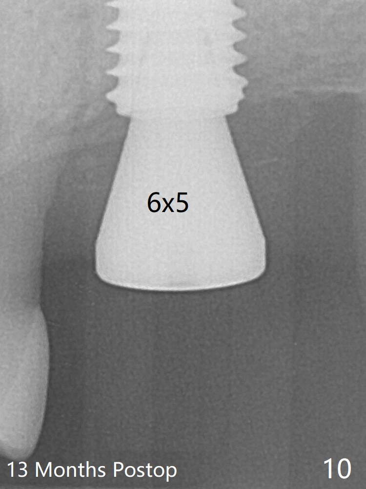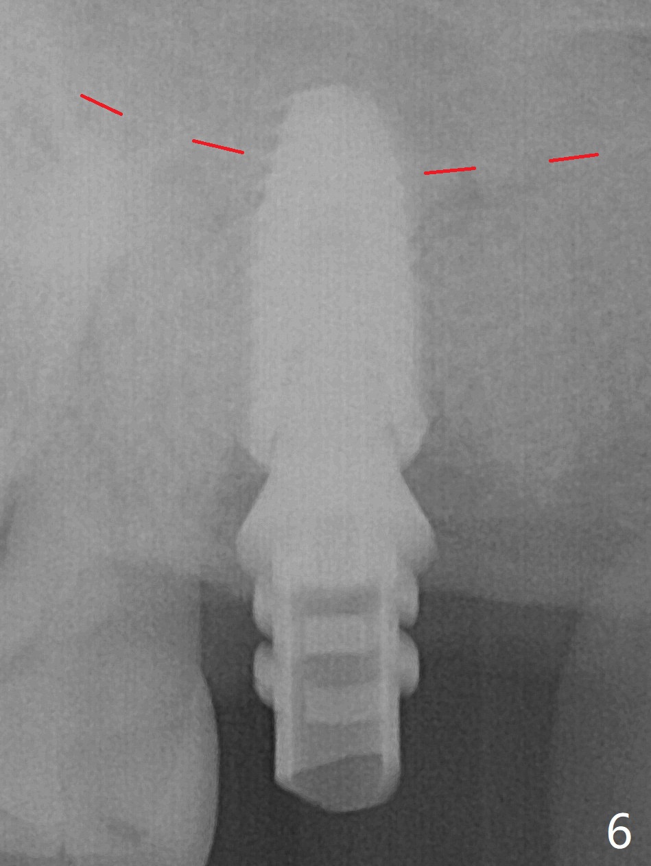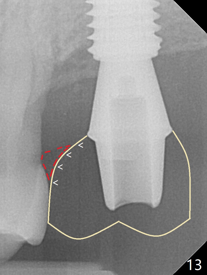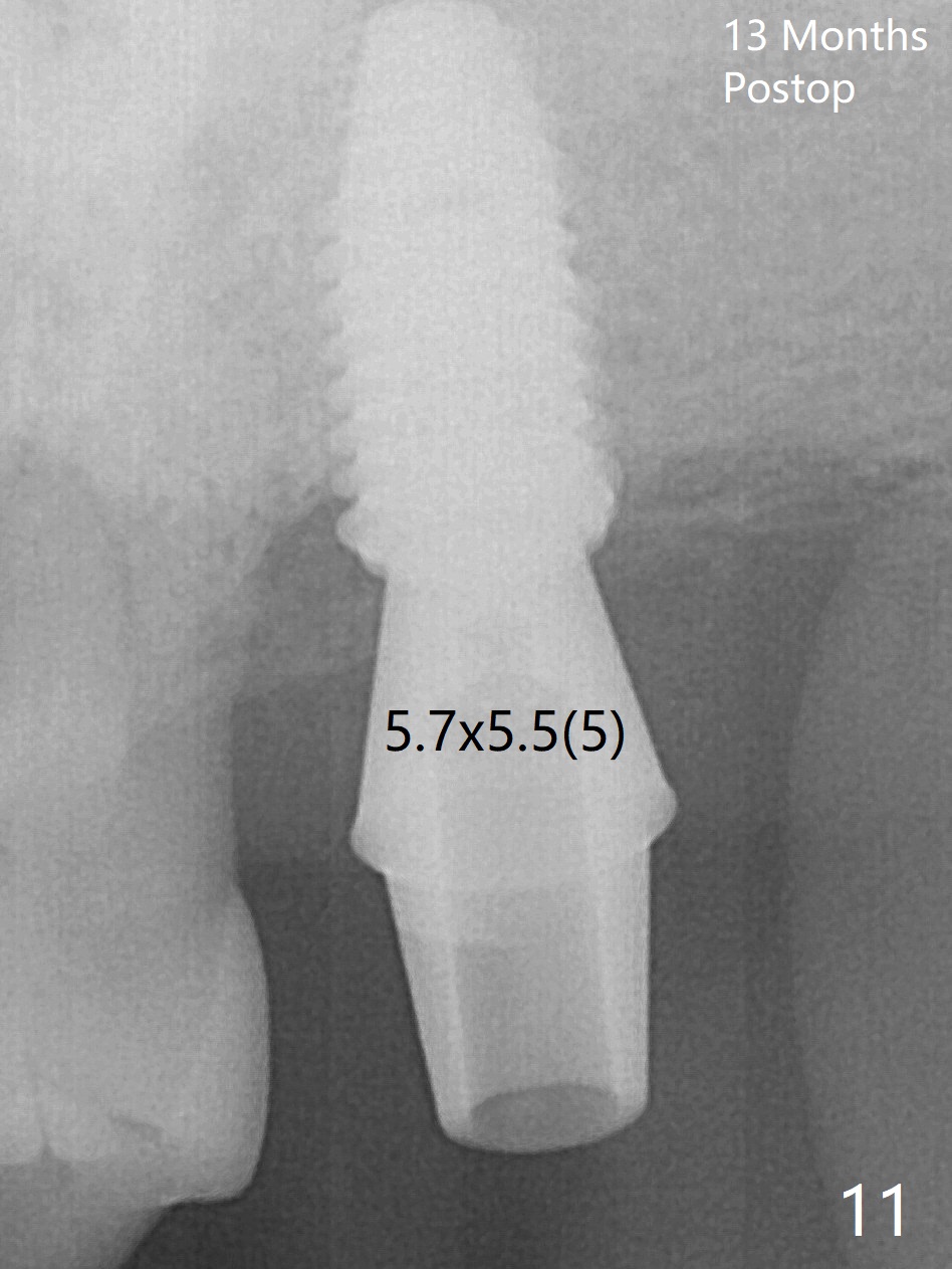 Although the buccal (Fig.1 (mesial view of the extracted tooth #15): B) root is larger than the palatal (P) one, the palatal socket is larger than the buccal one (Fig.2 white area) because of the bone loss of the former. For better restoration, osteotomy (Fig.2 red line) is initiated in the buccal slope of the septum (S) so that the final osteotomy is in the middle of the whole socket (Fig.3 red box). In fact a 3 mm stopper is not used because of the slope and the clumsy stopper. Stopper would be indicated if the bottom of the bone were flat. At first a 4x10 mm dummy implant is placed with stability (Fig.4). After further osteotomy and sinus lift (Fig.6 red dashed line: sinus floor), a 5x10 mm implant is placed with 30 Ncm, followed by insertion of a 5.2x8(2) mm temporary abutment (Fig.5,6). The latter holds an immediate provisional and Vanilla Graft/Osteogen (Fig.7 *) in place (^: distal crestal bone). Although the bone looks normal around the implant 7.5 months postop (Fig.4), the implant is unstable, probably due to the large preexisting defect. In contrast the implant placed at the healed site of #3 is stable 6.5 months postop. The 8x5 mm healing abutment that dislodged for 1 day could not return. A 6x5 mm one is used; it appears that the bone density mesial and distal to the implant is low (Fig.9 *). The implant looks normal and is stable 13 months postop (Fig.10). A 5.7x5.5(5) mm cementation abutment is placed for a provisional (progressive loading, Fig.11). There is no pain associated with the provisional for mastication. Impression is taken 7 days later. The patient has pain when the permanent crown is cemented. It appears that the implant does not osteointegrate and should be removed. A 6x14 mm tissue-level implant will be immediately placed following a 5 and 6x14 mm taps and bone graft and PRF (Metronidazole). In fact there is no pain when the existing abutment is torqued at 35 Ncm 1 year 8 months postop (Fig.12). The mesiogingival portion of final restoration (Fig.13 arrowheads) should be bulky so that the gingival embrasure (red dashed line) is minimal to reduce food impaction.