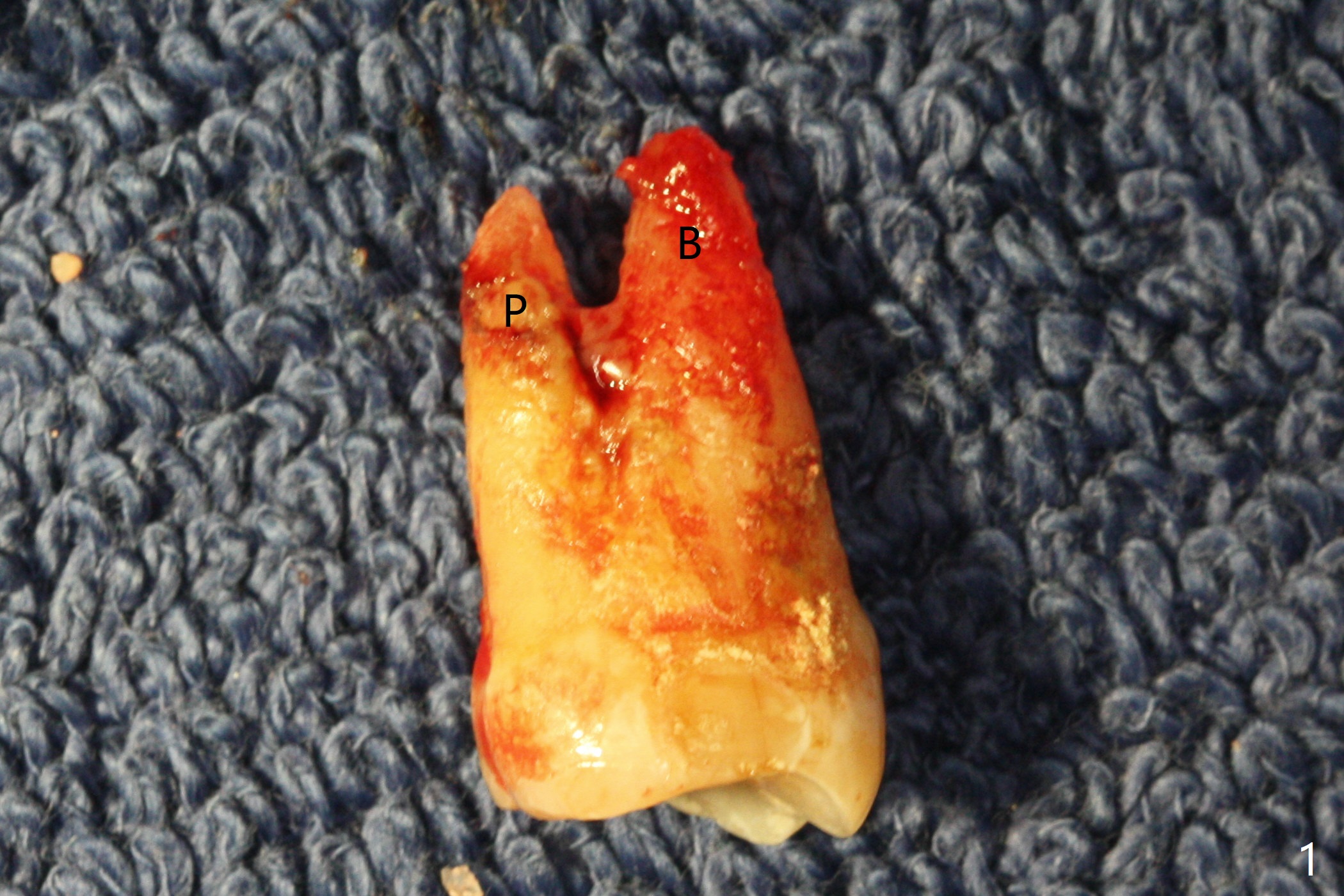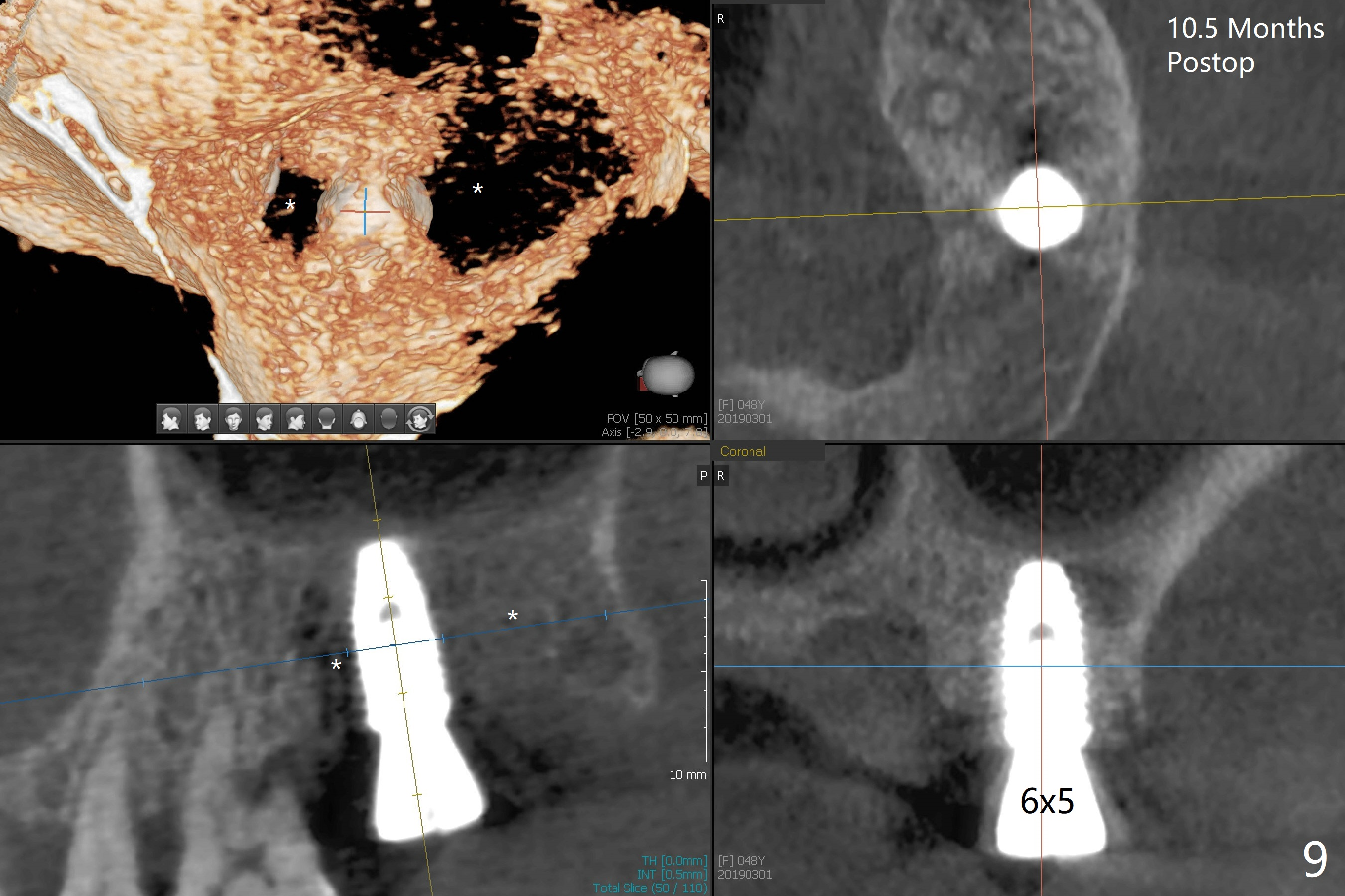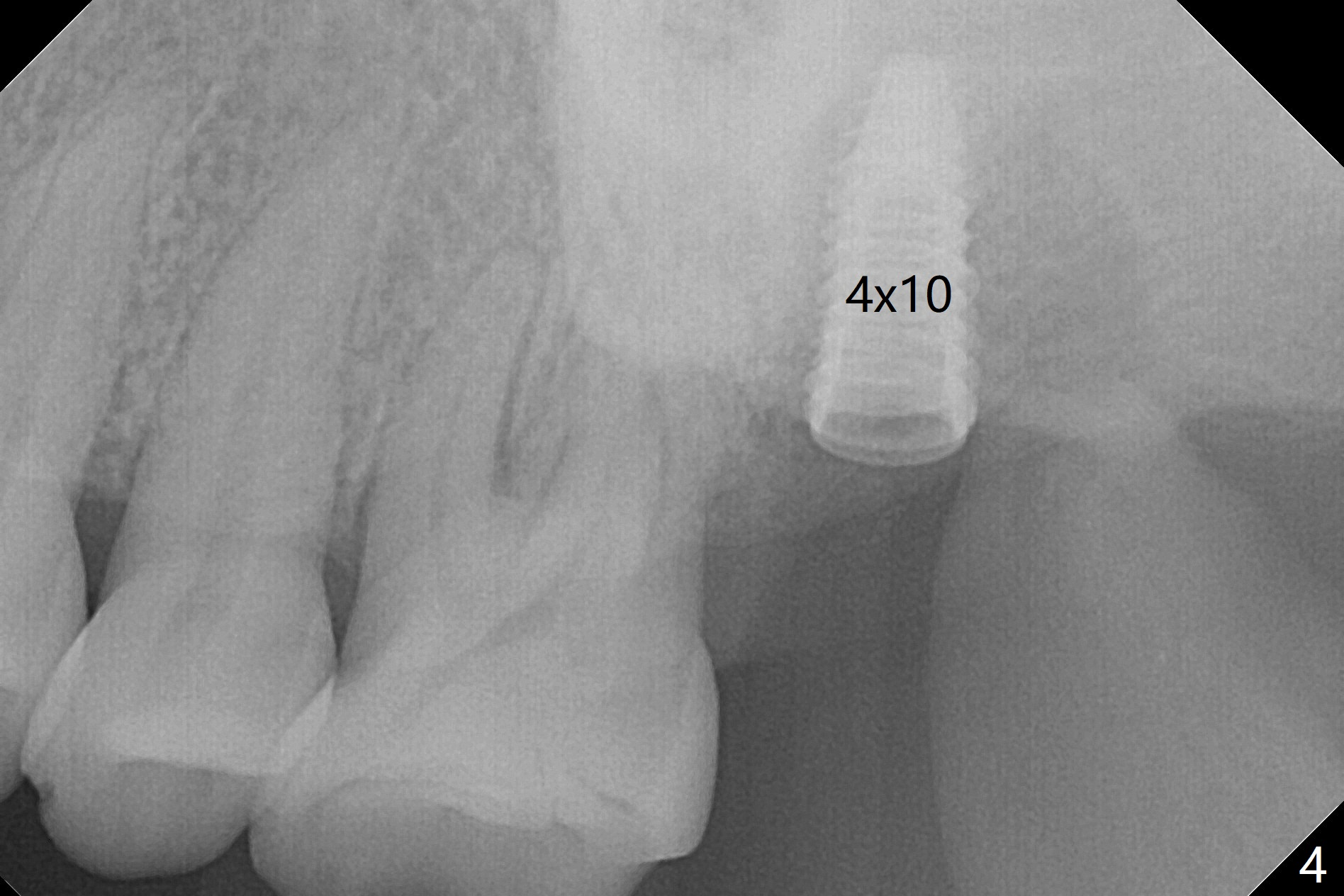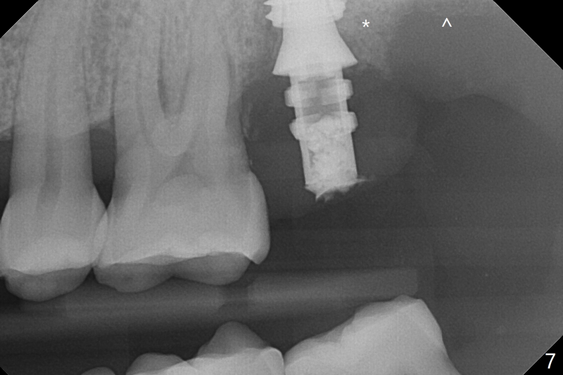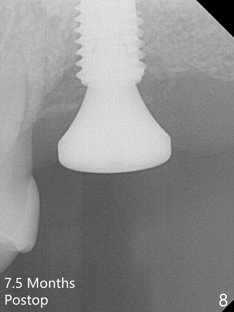 Although the buccal (Fig.1 (mesial view of the extracted tooth #15): B) root is larger than the palatal (P) one, the palatal socket is larger than the buccal one (Fig.2 white area) because of the bone loss of the former. For better restoration, osteotomy (Fig.2 red line) is initiated in the buccal slope of the septum (S) so that the final osteotomy is in the middle of the whole socket (Fig.3 red box). In fact a 3 mm stopper is not used because of the slope and the clumsy stopper. Stopper would be indicated if the bottom of the bone were flat. At first a 4x10 mm dummy implant is placed with stability (Fig.4). After further osteotomy and sinus lift (Fig.6 red dashed line: sinus floor), a 5x10 mm implant is placed with 30 Ncm, followed by insertion of a 5.2x8(2) mm temporary abutment (Fig.5,6). The latter holds an immediate provisional and Vanilla Graft/Osteogen (Fig.7 *) in place (^: distal crestal bone). Although the bone looks normal around the implant 7.5 months postop (Fig.4), the implant is unstable, probably due to the large preexisting defect. In contrast the implant placed at the healed site of #3 is stable 6.5 months postop. The 8x5 mm healing abutment that dislodged for 1 day could not return. A 6x5 mm one is used; it appears that the bone density mesial and distal to the implant is low (Fig.9 *). The implant looks normal and is stable 13 months postop (Fig.10). A 5.7x5.5(5) mm cementation abutment is placed for a provisional (progressive loading, Fig.11). There is no pain associated with the provisional for mastication. Impression is taken 7 days later. The patient has pain when the permanent crown is cemented. It appears that the implant does not osteointegrate and should be removed. A 6x14 mm tissue-level implant will be immediately placed following a 5 and 6x14 mm taps and bone graft and PRF (Metronidazole). In fact there is no pain when the existing abutment is torqued at 35 Ncm 1 year 8 months postop (Fig.12). The mesiogingival portion of final restoration (Fig.13 arrowheads) should be bulky so that the gingival embrasure (red dashed line) is minimal to reduce food impaction.