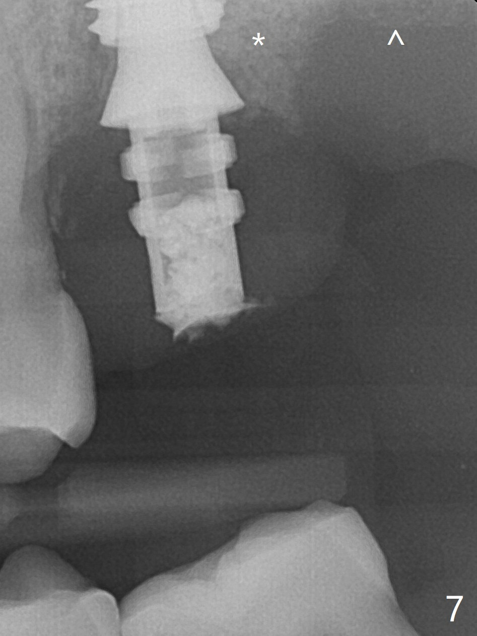 The temporary abutment holds an immediate provisional and Vanilla Graft/Osteogen (Fig.7 *) in place (^: distal crestal bone). Although the bone looks normal around the implant 7.5 months postop (Fig.4), the implant is unstable. The implant looks normal and is stable 13 months postop (Fig.10).