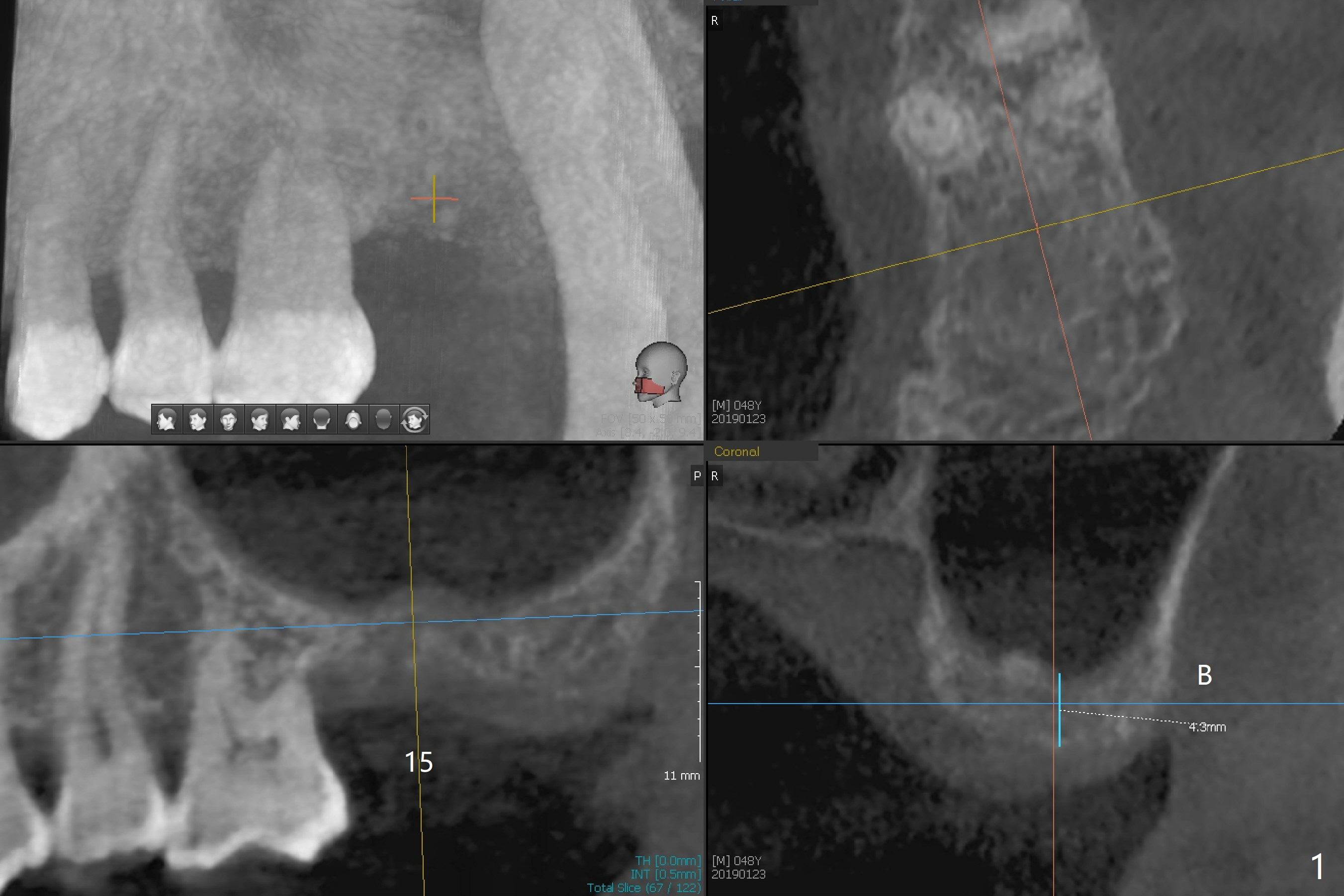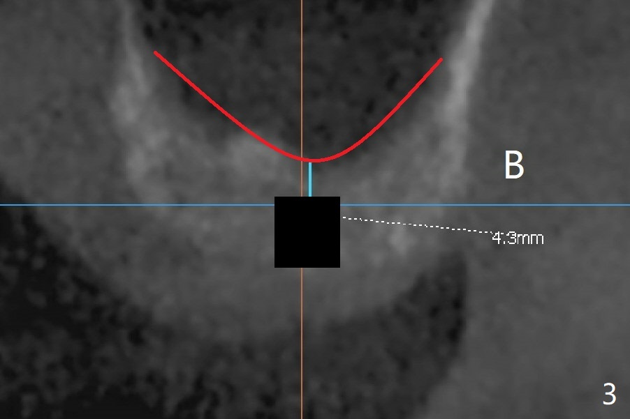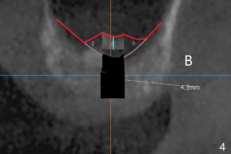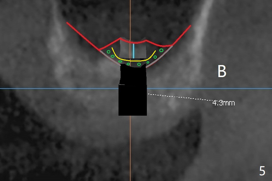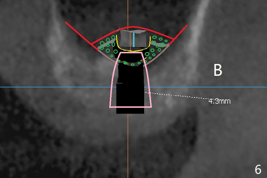 A 48-year-old man returns for CT 4.5 months post infected implant removal with bone graft at #15. The bone height reduces from 6-10 mm to ~ 4 mm (Fig.1). To place a 5x7.3 mm implant (Fig.2), initial osteotomy for ~3 mm in depth and in diameter will be aided by guided surgery (Fig.3 (red line: sinus membrane)). Internal sinus lift is going to be conducted with Magic Lifter free hand or in the middle of the tube (Fig.4 arrows). The specially designed lifter is able to lift the sinus floor without tearing the membrane. To prevent and repair membrane injury, one or 2 pieces of PRF membrane will be inserted underneath the lifted structures (Fig.5 yellow), followed by bone graft (green circles). Then 3.5-4.5 mm taps will be used with guide to further expand and condense the osteotomy. With more graft to be placed, the 5x7.3 mm implant will be placed (Fig.6 pink).