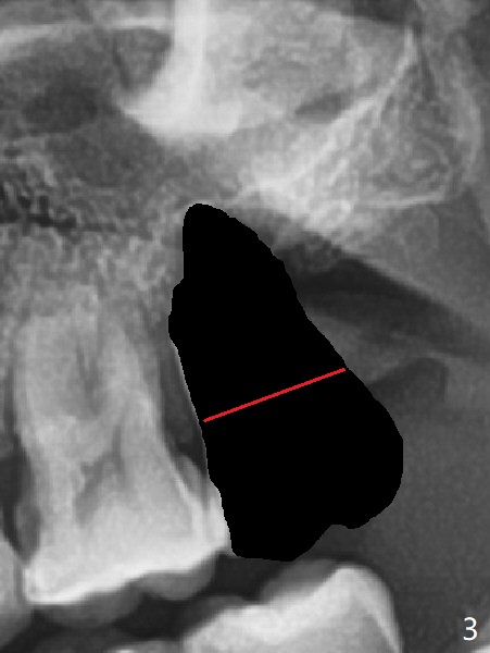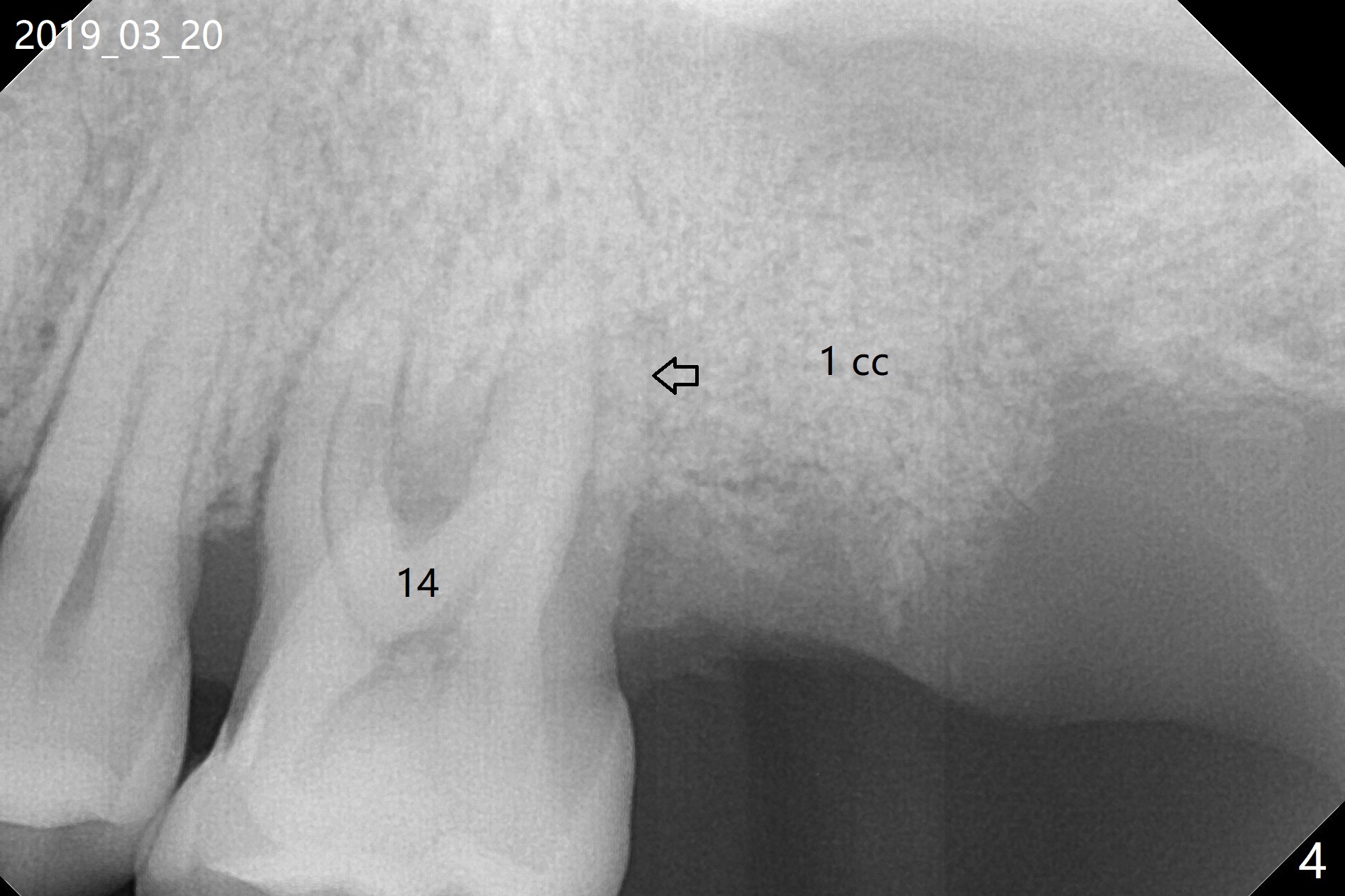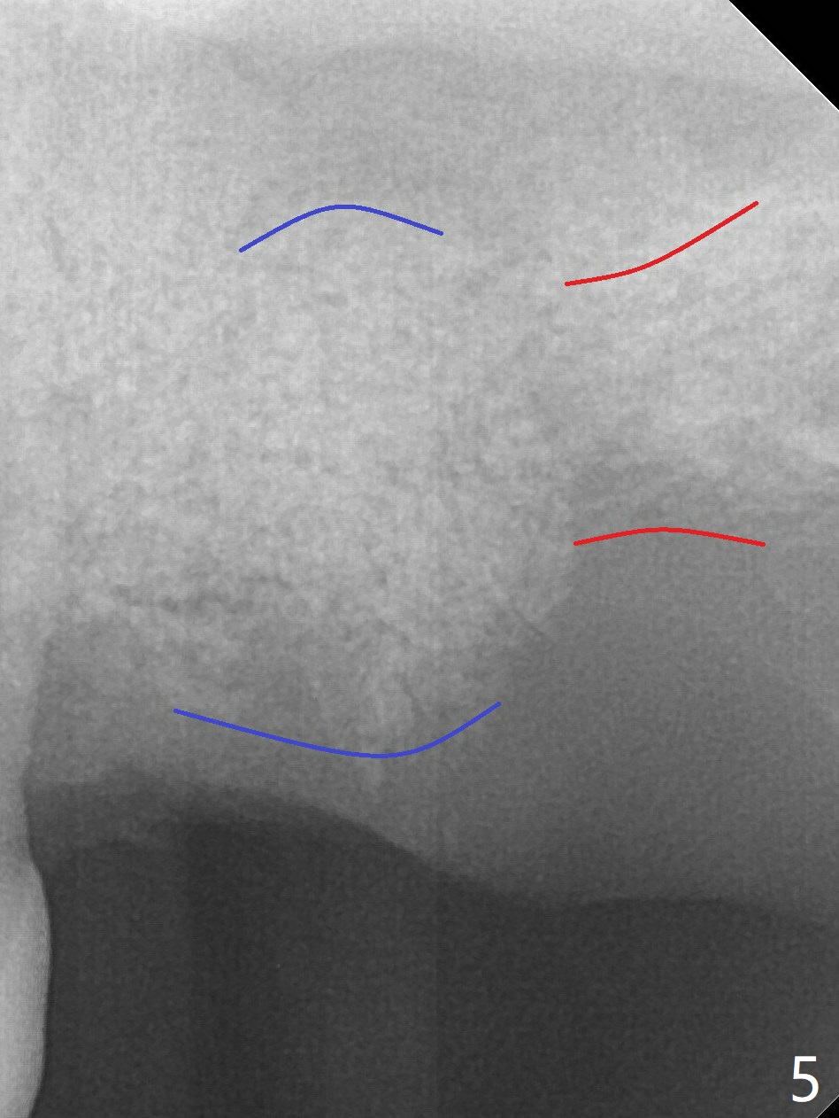 A 54-year-old man returns to clinic 5 months post SRP with chief complaint of UL loose tooth (#15, Fig.1). Since the remaining bone is limited after extraction, it is apparently unsuitable for immediate implant (Fig.2). Socket preservation seems to be able to gain bone height near gingival margin (Fig.3 red line). In fact 1 cc of cortical and cancellous bone mixture is used; after heavy debridement the bone graft is deposited on the distal root surface of the tooth #14 (Fig.4 arrow). The bone increases not only coronally, but also apically (Fig.5 blue lines, as compared to red lines denoting the original bone height). The bone reduces in height 10 months postop (Fig.6). Sinus lift is required for placement of a short implant (Fig.7). Socket preservation does not prevent post-extraction bone loss.