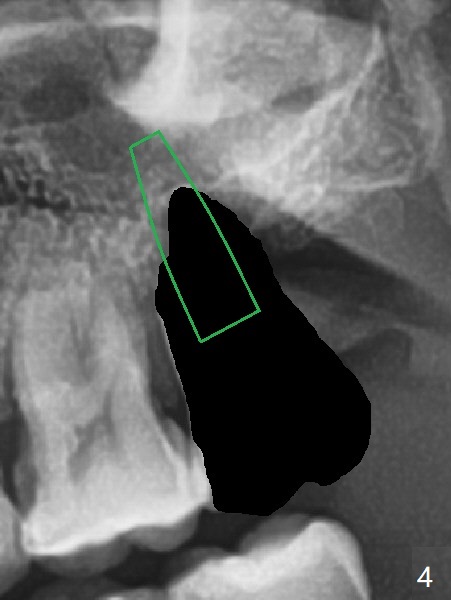 步骤一:选择大小长度合适植体(图四:绿色)。尽量大卡在近中,远中骨壁,取得初步稳定性,但是留下足够颊侧,腭侧空间植骨。植体上缘刚刚越过窦底,下缘龈下3-4毫米。
