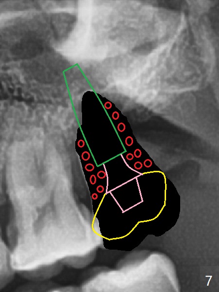 步骤四:制作临时修复物固定骨粉(图七:黄色)。