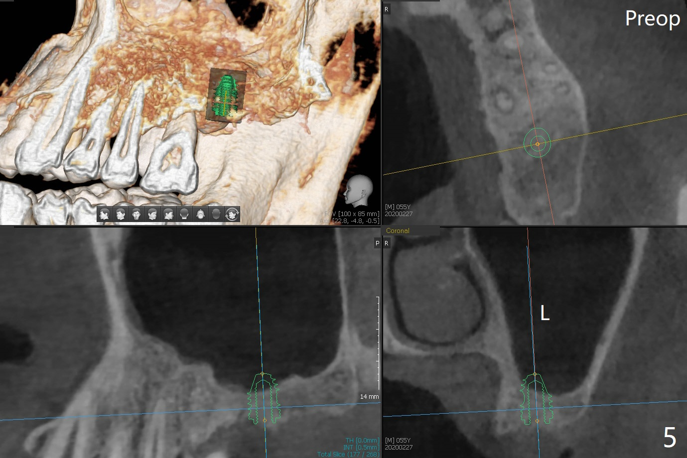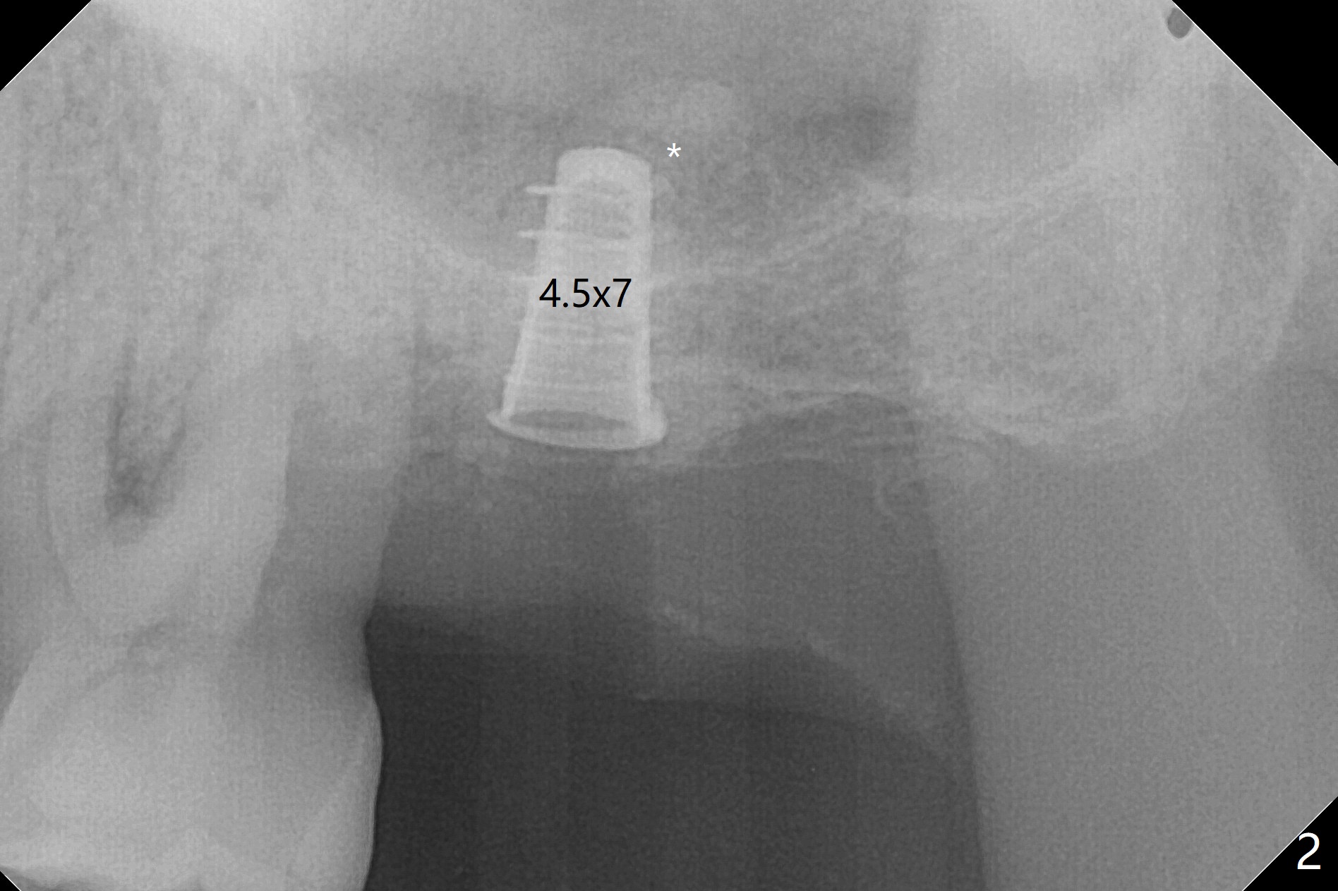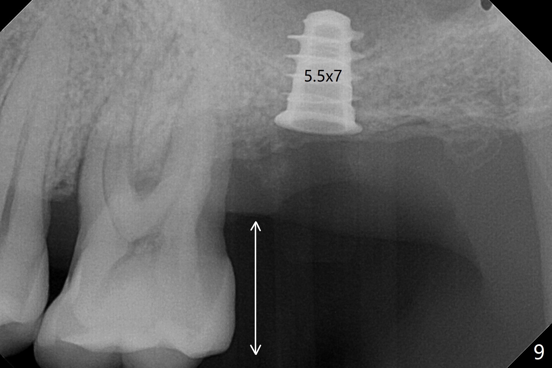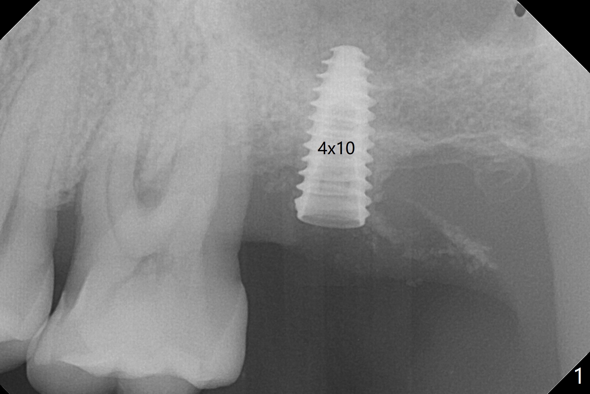 左上7完成初步钻洞,园钻头无法插入导板金属圈,用2.2毫米钻头钻深2毫米,窦膜似乎完整,在没有骨粉情况下,使用4x10毫米报废植体做上颌窦提升(图一),可能一下提升太多,窦膜破了,塞入两小块胶原膜,注入NovaBone