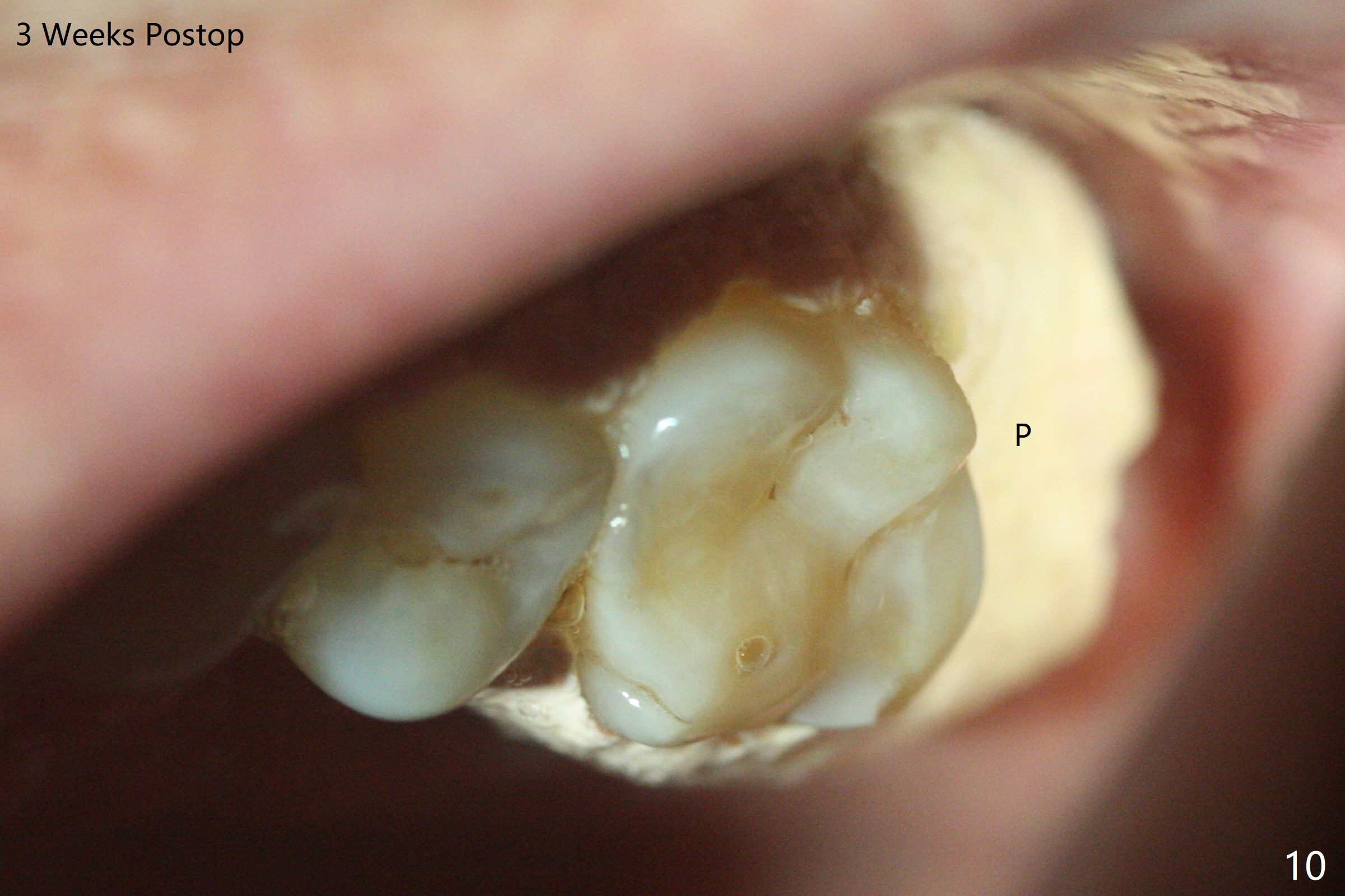 Bone在上颌窦里凝固了。其实左侧上颌窦粘膜术前增厚(图四,五:L),人工骨仿佛弥撒在上颌窦膜中(图六)。术后一周病人没有任何鼻窦症状。术后4.5月旋转愈合基台时,病人感到疼痛,终止取模(图七),两个月后复诊,做progressive loading。术后5.5月旋转愈合基台时,植体一起出来,但是上颌窦膜没有破,放置大一号植体(报废)扭力不够(图八),再大一号扭力可以(图九),放置愈合帽。由于邻牙长(图九:双箭头),牙周敷料逗留三周不掉(图十:P)。撤除后,伤口愈合正常。The