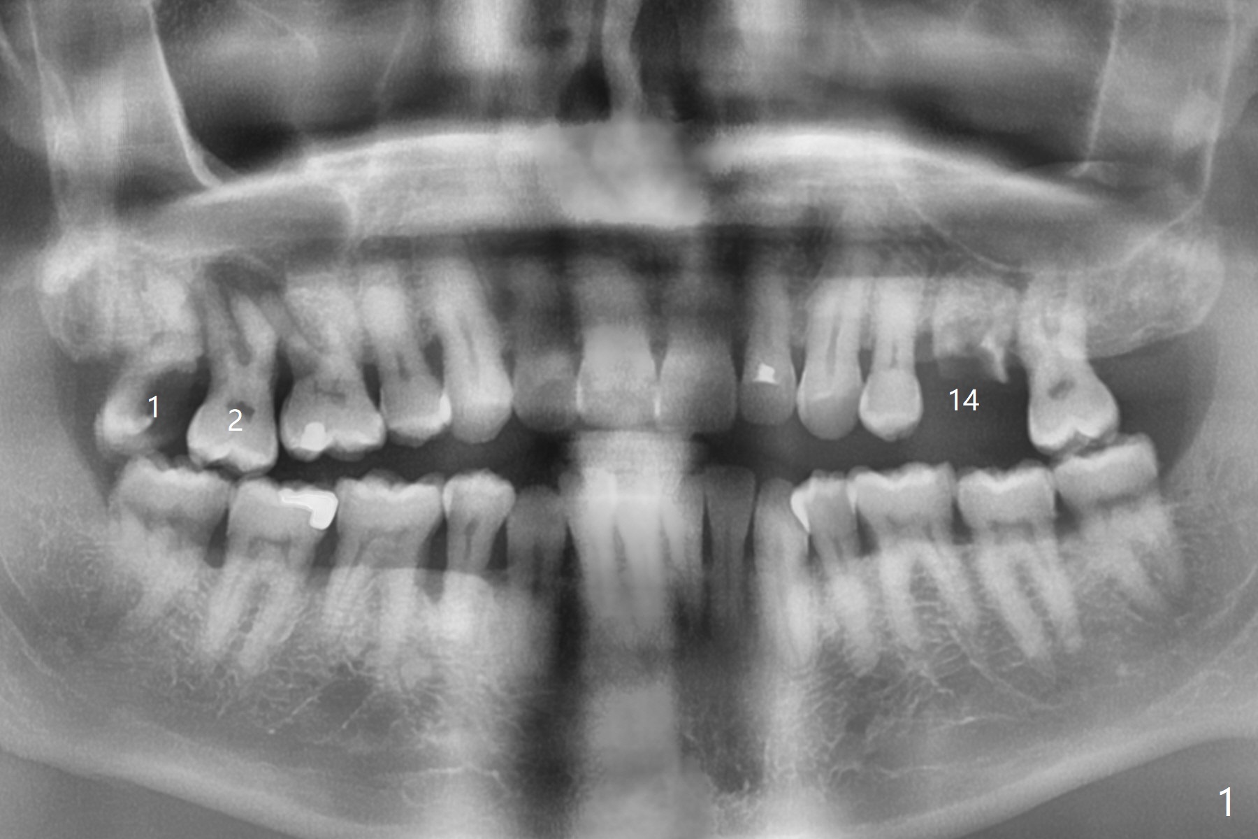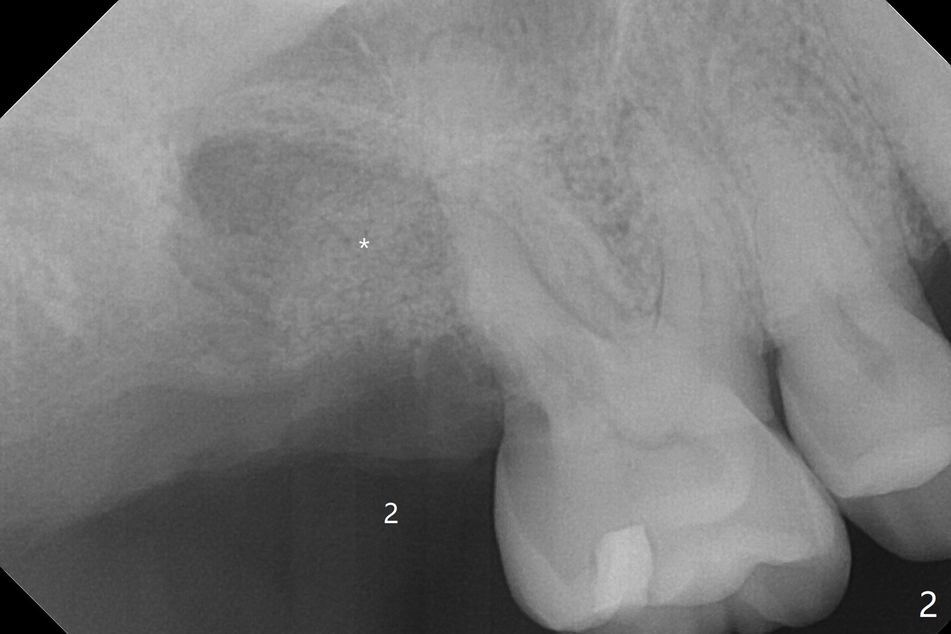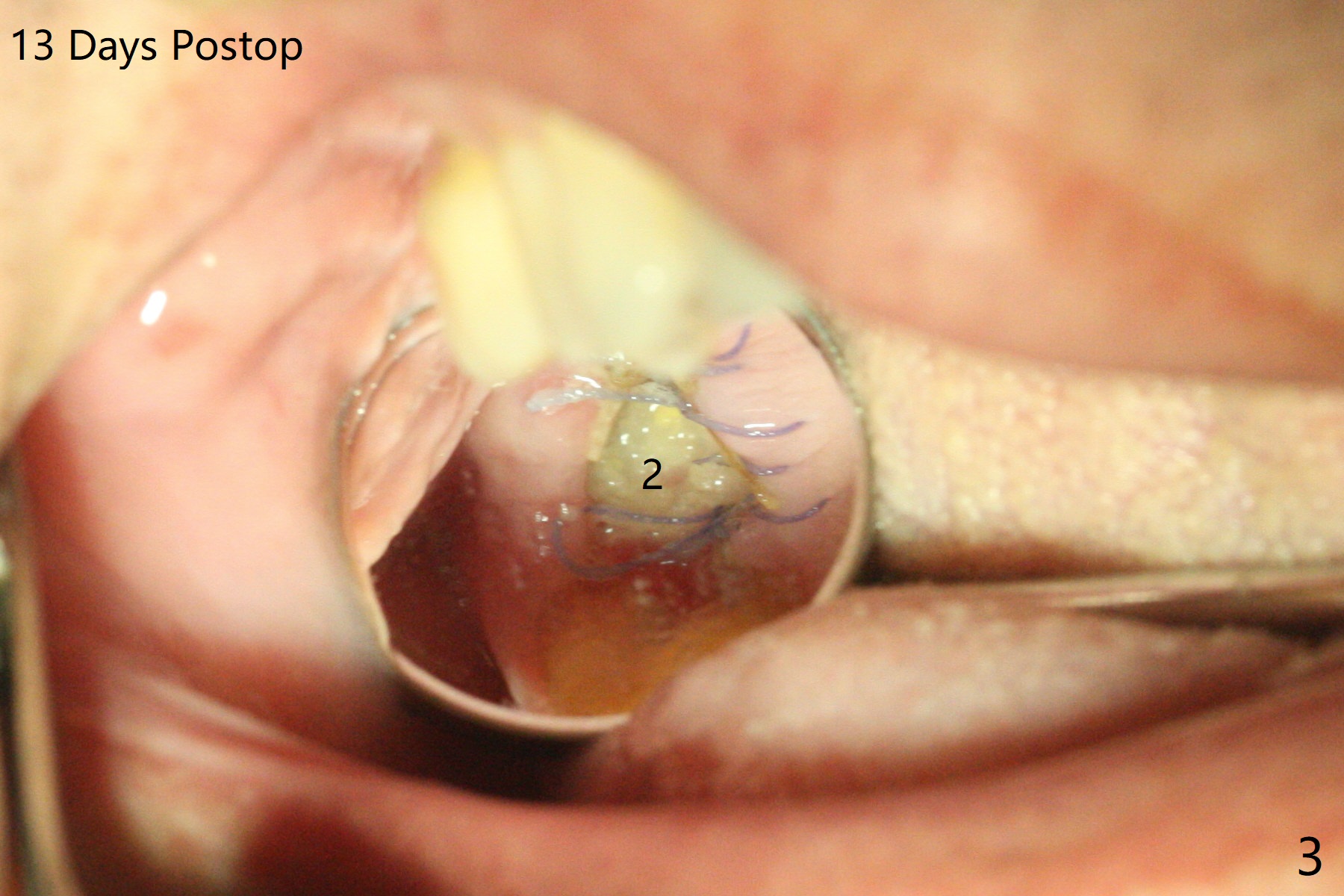 A 55-year-old man agrees to have the tooth #1 extraction immediately post SRP. Pre-extraction panoramic X-ray shows severe bone loss at #2 (Fig.1). Possible extraction of #2 is mentioned considering pending implant at #14. Extraction of #1 turns out to be difficult, requiring sectioning. The tooth #2 blocks the access. The patient readily accepts #2 extraction. Removal of abundant granulation tissue at #2 is associated with severe hemorrhage from the Greater Palatine Vessels. After pressure hemostasis, a piece of Osteogen Plug is placed at #1, the other palatal of #2 to control hemorrhage. With hemostasis, Vanilla graft is placed at #2 securely (without being washed out, Fig.2 *), followed by placement of a third Osteogen Plug on the top of the graft. The last surgical challenge is to close these two large wide sockets with 4-0 Chromic gut and PGA. While the socket #1 remains closed, the one at #2 is open 13 days postop (Fig.3). It appears that a stiffer membrane (6-month) should be sutured in place to keep the Osteogen plug underneath in place. The latter seems to be easily fragmented.
