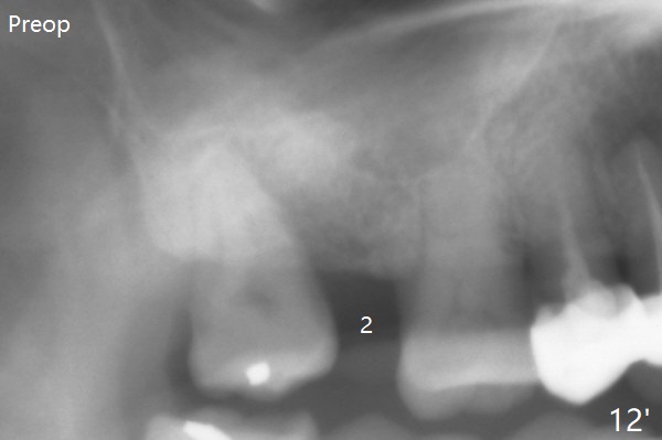 The distal cortical bone contacts the implant (Fig.12 ^), while the mesial bone increases in density (*) 2 years postop, as compared to Fig.12' (preop).