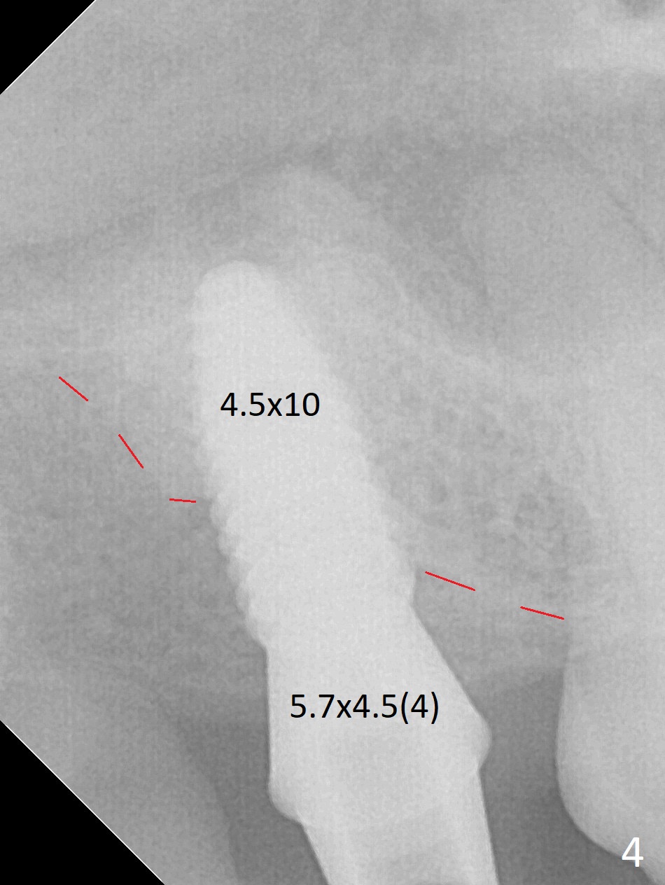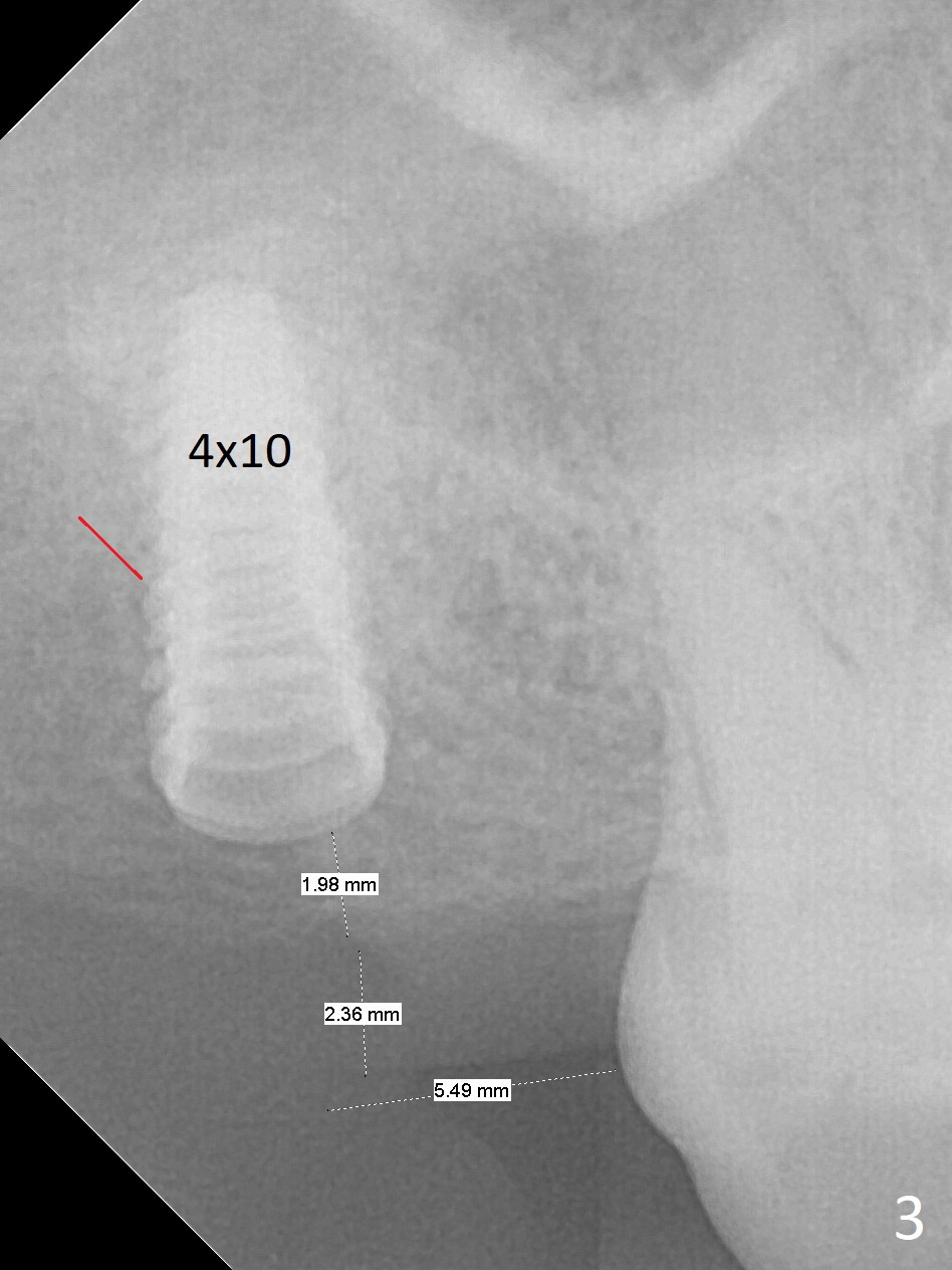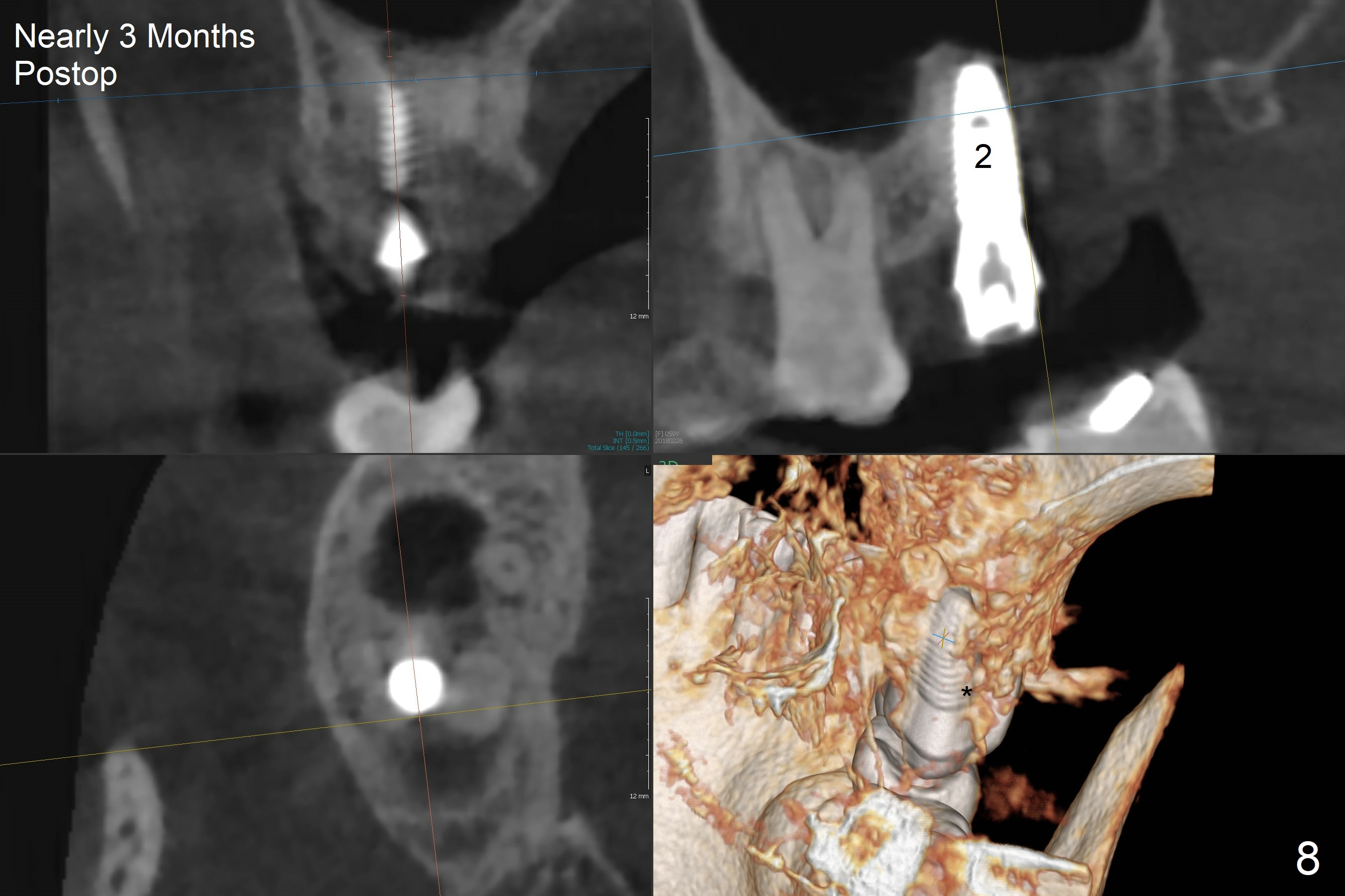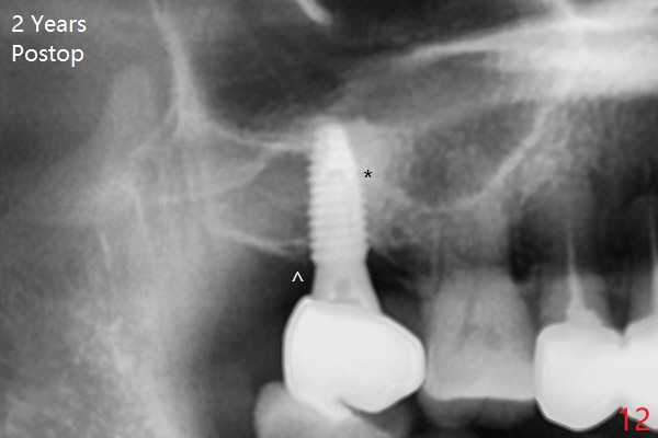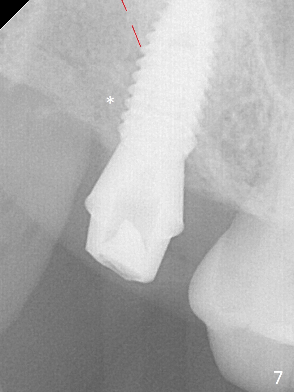After extraction of the 3rd molar with mesial periodontal defect, osteotomy for 2nd molar implant is initiated in the mesial slope of the 3rd molar socket (Fig.1 red dashed line). When osteotomy is finished with IS drills and sinus lift with Magic Sinus Lifter (S-reamer with 11 mm stopper being short), a 4x10 mm dummy implant is placed with ~ 4 implant thread exposure (Fig.3). Following use of Lindamann bur to move osteotomy mesial and larger drill, a 4.5x10 mm implant is placed with 5-7 implant threads exposed distally (Fig.4,7 (~ 50 Ncm)). The bucco(B)-palatal(P) extent of the implant thread exposure is larger (Fig.5) than that associated with the 4 mm dummy implant (data not shown). The exposed implant surface is covered with Vera Graft (Fig.7*), Collagen plug and an immediate provisional after adjustment of abutment height (Fig.6,7). The bone density distal to the implant is low 3 months postop (Fig.8,9 CBCT) and 3.5 months postop (Fig.10,11). The permanent crown is cemented nearly 4 months postop. The distal cortical bone contacts the implant (Fig.12 ^), while the mesial bone increases in density (*) 2 years postop.