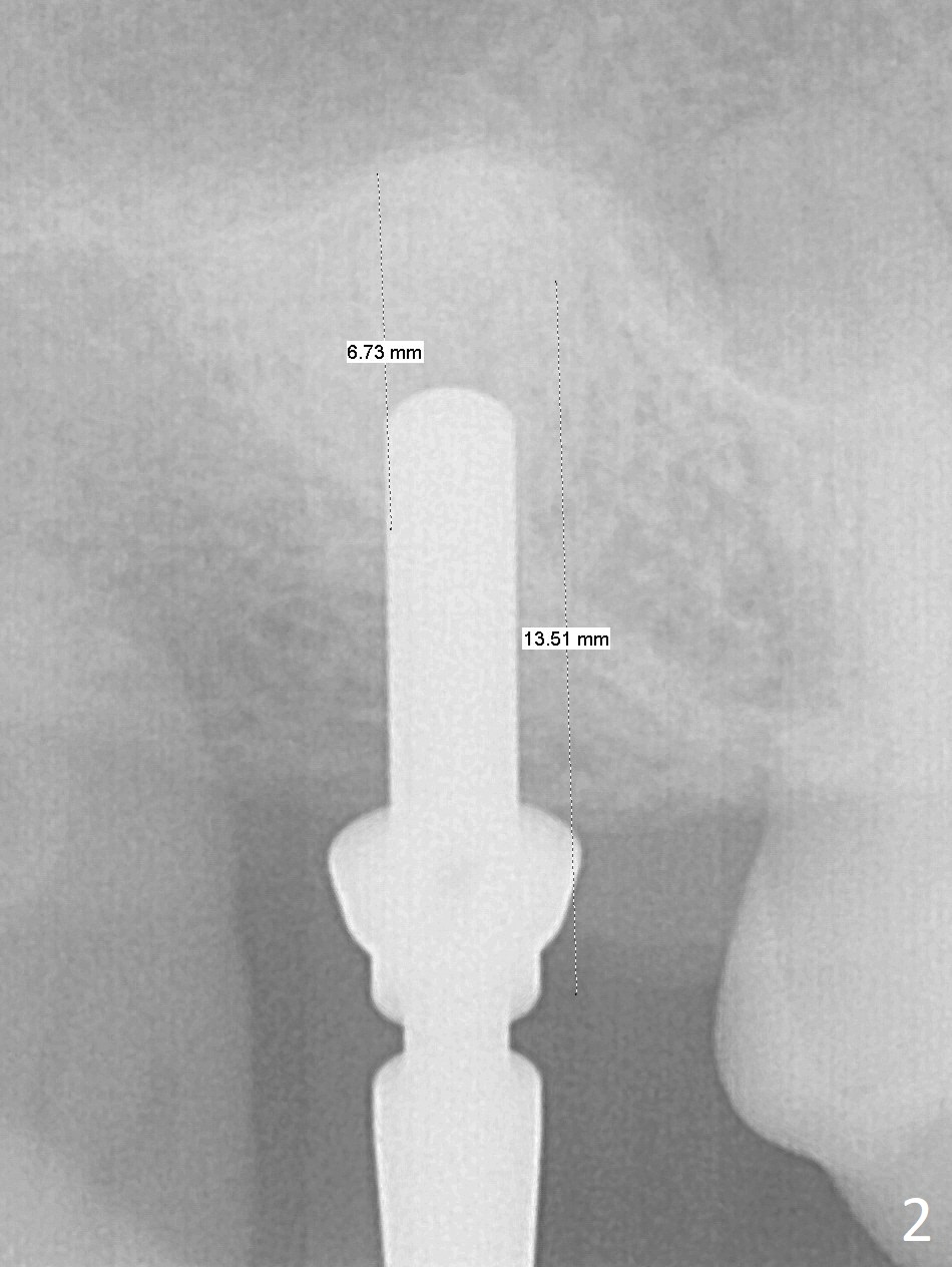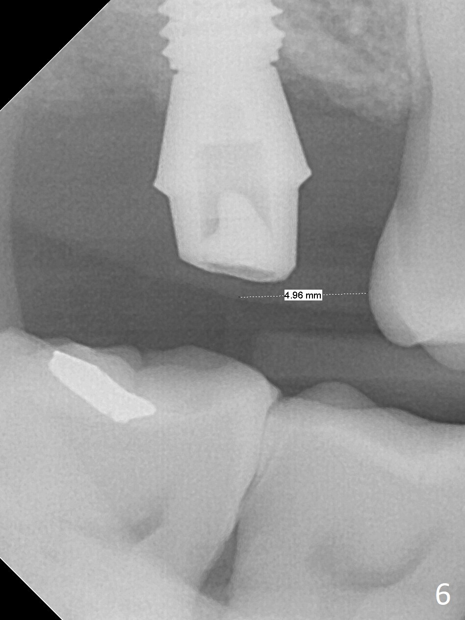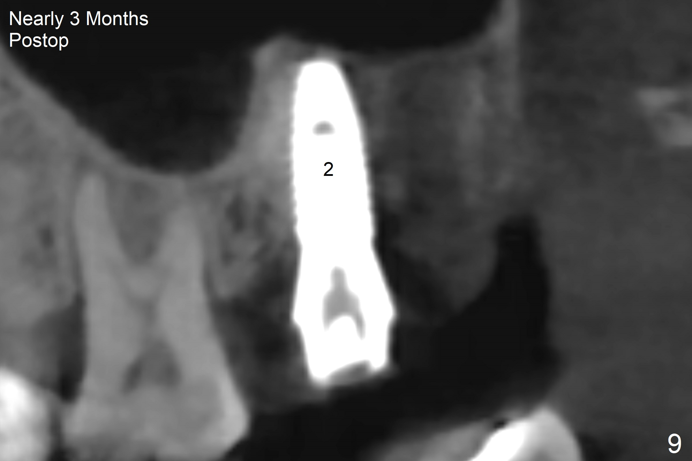 After extraction of the 3rd molar with mesial periodontal defect, osteotomy for 2nd molar implant is initiated in the mesial slope of the 3rd molar socket (Fig.1 red dashed line). When osteotomy is finished with IS drills and sinus lift with Magic Sinus Lifter (S-reamer with 11 mm stopper being short), a 4x10 mm dummy implant is placed with ~ 4 implant thread exposure (Fig.3). Following use of Lindamann bur to move osteotomy mesial and larger drill, a 4.5x10 mm implant is placed with 5-7 implant threads exposed distally (Fig.4,7 (~ 50 Ncm)). The bucco(B)-palatal(P) extent of the implant thread exposure is larger (Fig.5) than that associated with the 4 mm dummy implant (data not shown). The exposed implant surface is covered with Vera Graft (Fig.7*), Collagen plug and an immediate provisional after adjustment of abutment height (Fig.6,7). The bone density distal to the implant is low 3 months postop (Fig.8,9 CBCT) and 3.5 months postop (Fig.10,11). The permanent crown is cemented nearly 4 months postop. The distal cortical bone contacts the implant (Fig.12 ^), while the mesial bone increases in density (*) 2 years postop.