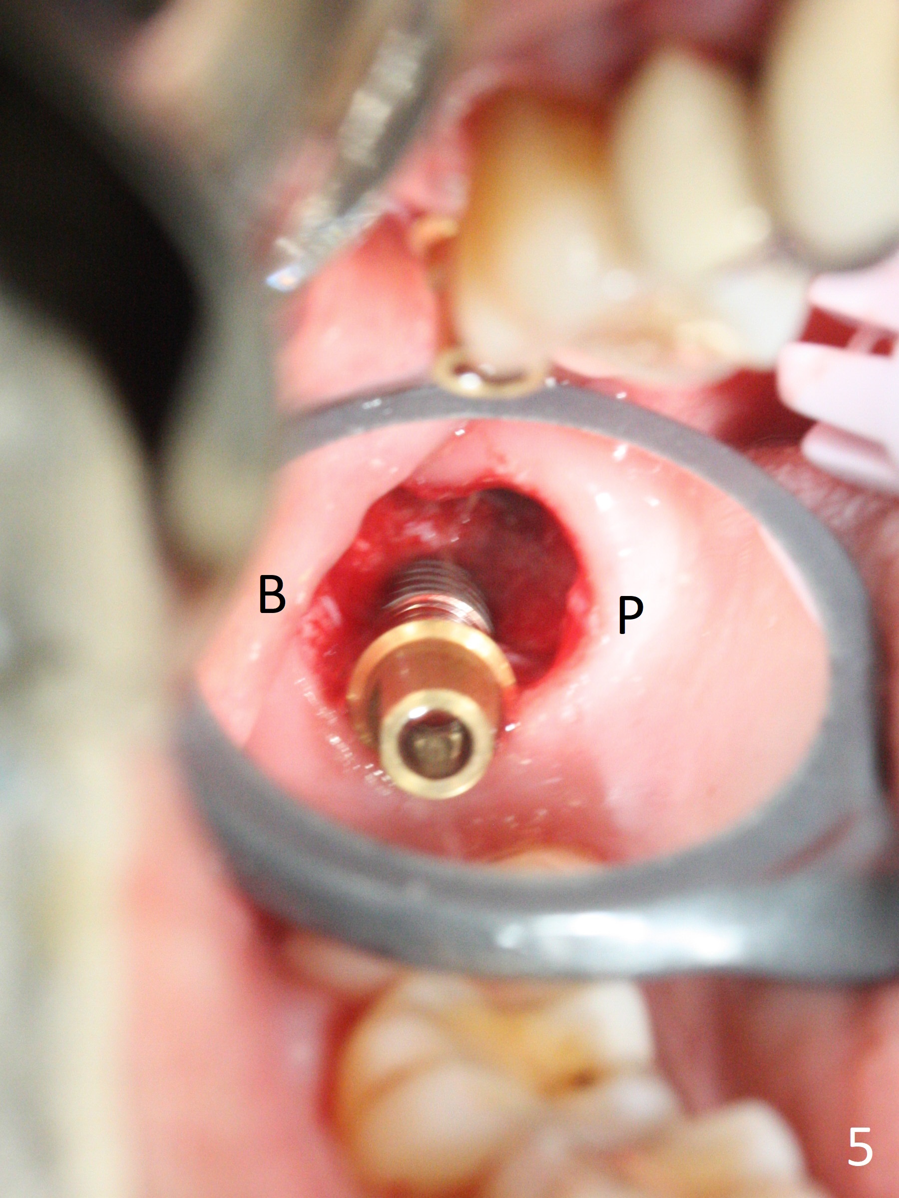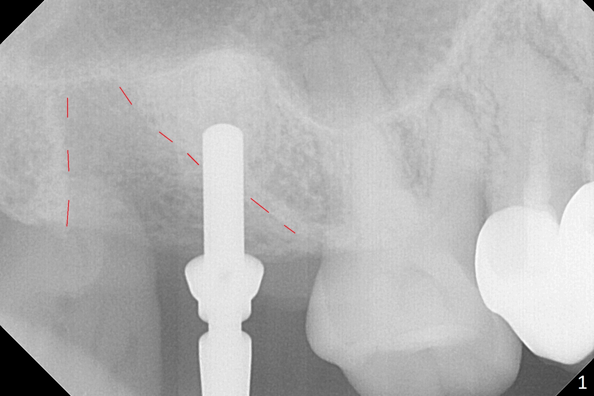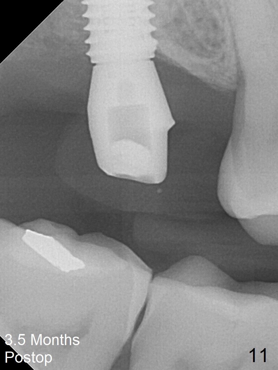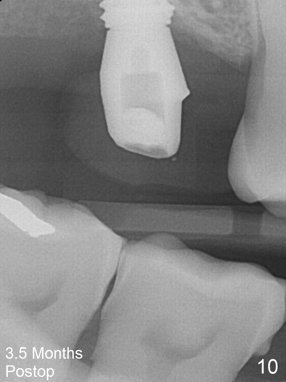 After extraction of the 3rd molar with mesial periodontal defect, osteotomy for 2nd molar implant is initiated in the mesial slope of the 3rd molar socket (Fig.1 red dashed line). When osteotomy is finished with IS drills and sinus lift with Magic Sinus Lifter (S-reamer with 11 mm stopper being short), a 4x10 mm dummy implant is placed with ~ 4 implant thread exposure (Fig.3). Following use of Lindamann bur to move osteotomy mesial and larger drill, a 4.5x10 mm implant is placed with 5-7 implant threads exposed distally (Fig.4,7 (~ 50 Ncm)). The bucco(B)-palatal(P) extent of the implant thread exposure is larger (Fig.5) than that associated with the 4 mm dummy implant (data not shown). The exposed implant surface is covered with Vera Graft (Fig.7*), Collagen plug and an immediate provisional after adjustment of abutment height (Fig.6,7). The bone density distal to the implant is low 3 months postop (Fig.8,9 CBCT) and 3.5 months postop (Fig.10,11). The permanent crown is cemented nearly 4 months postop. The distal cortical bone contacts the implant (Fig.12 ^), while the mesial bone increases in density (*) 2 years postop.