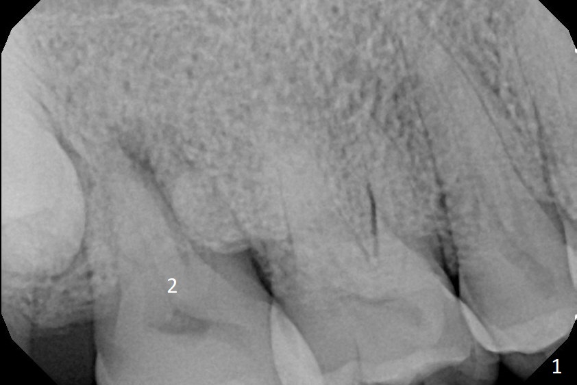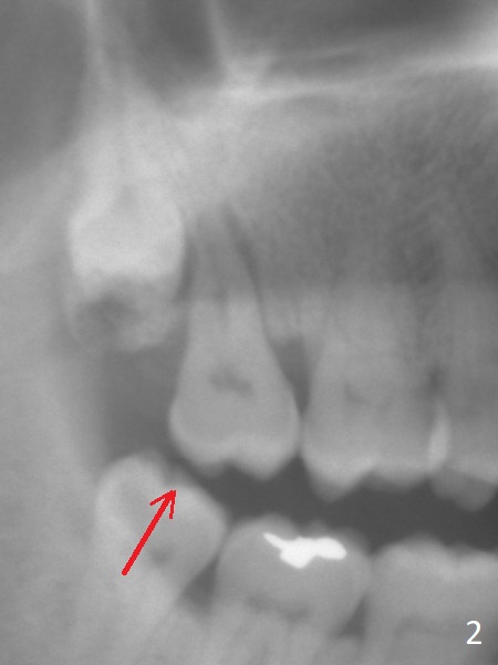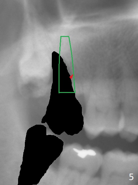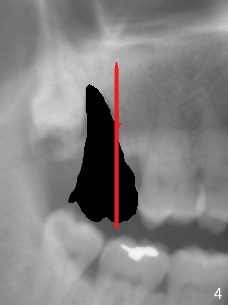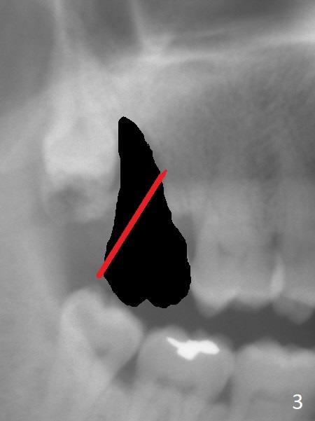 A 67-year-old man has pain associated with the tooth #2 with distal deep pockets (Fig.1), consistent with root fracture. The abnormal force may arise from the mesioangular lower 3rd molar (Fig.2 arrow). To avoid damage to the upper 3rd molar, osteotomy will be initiated obliquely with starter drill in the mesial slope of the socket (Fig.3 red). Once the starter drill makes a short entry, use 2 mm drill to change trajectory (Fig.4). Due to the uneven wall, an implant is expected to be placed distally by itself (Fig.5). The bone height is ~18 mm. If the patient agrees, remove the lower 3rd molar (Fig.5 black area).