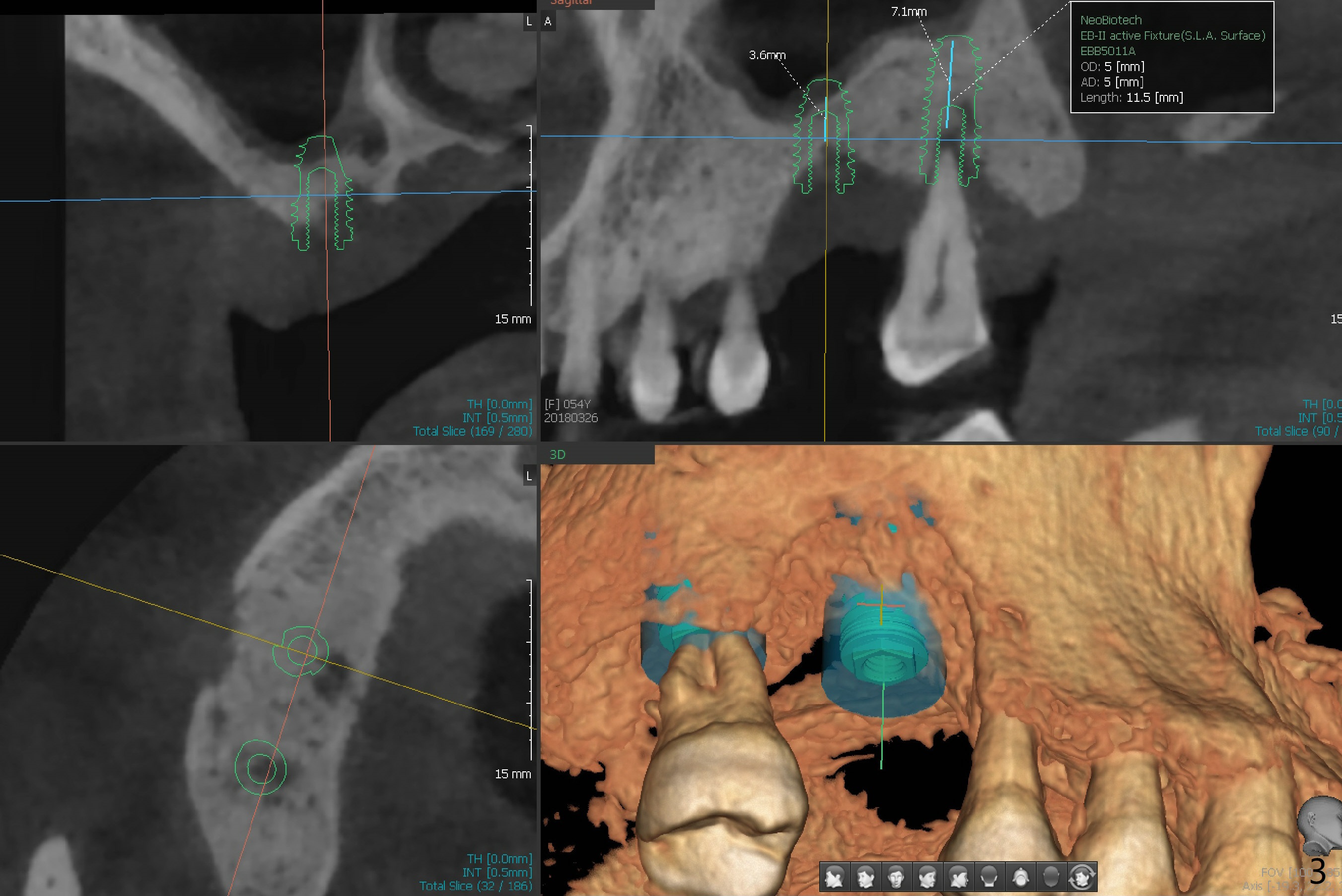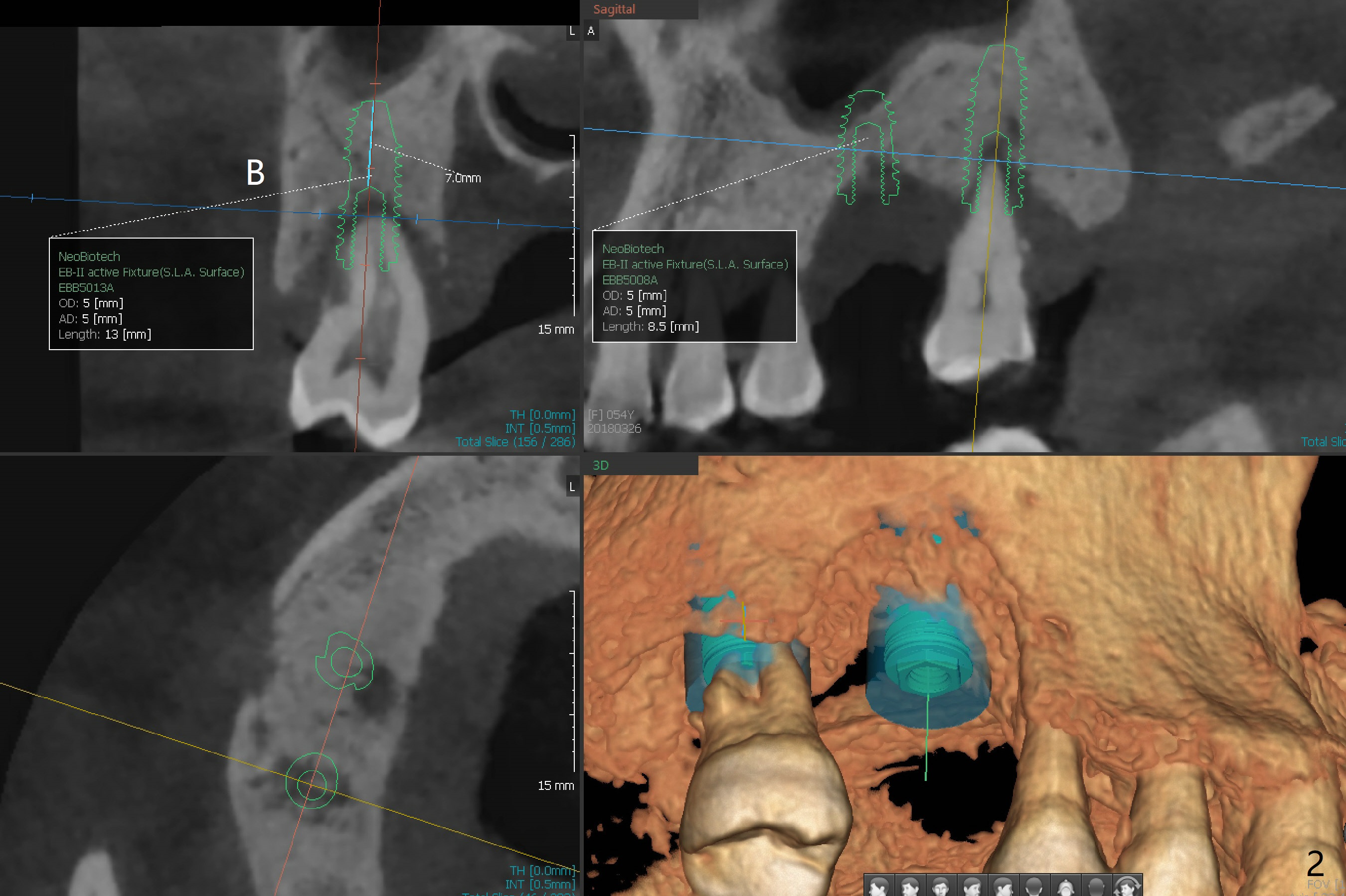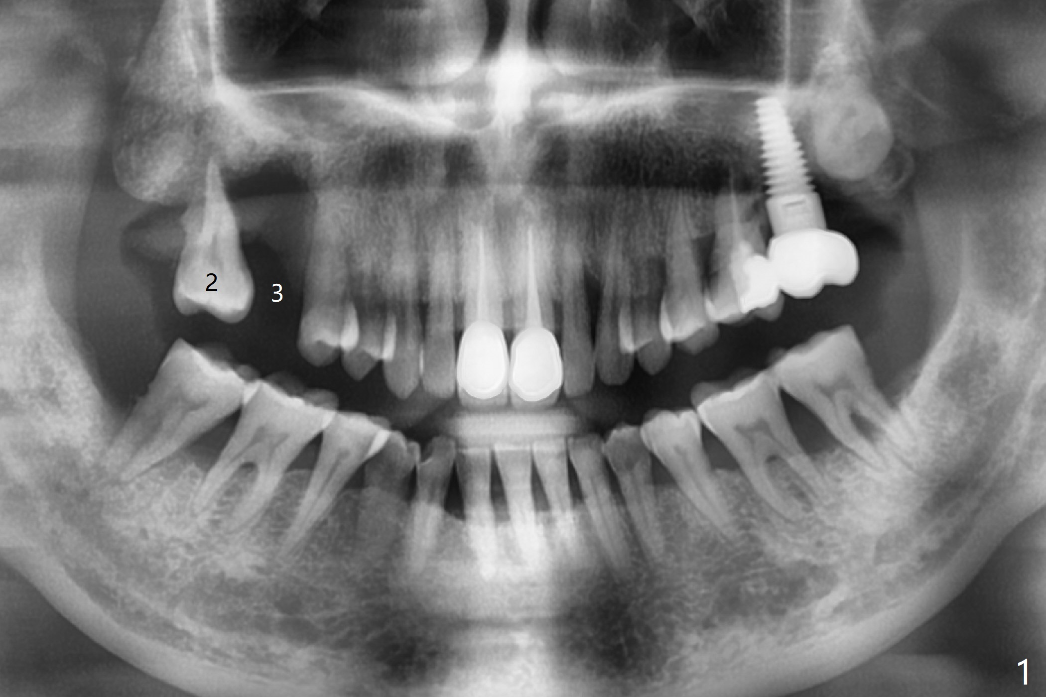 The tooth #2 of a 54-year-old woman has severe bone loss, while #3 has exfoliated (Fig.1). If the former is found without shifting, incision will be made at #3 (and prepare 4 and 6 mm tissue punches), followed by IS drills with 3 mm stoppers until 4.5 mm in diameter (Fig.3). Sinus lift will be accomplished with 3.6 mm round drill from Master Kit with 4-6 mm stoppers, followed by PRF membrane (total 3-4) and Vanilla Graft. Use Prosthetic Planning Kit to choose a proper cementation abutment. The tooth #2 will be extracted. Osteotomy starts with 7 mm stopper (Fig.2,3)...