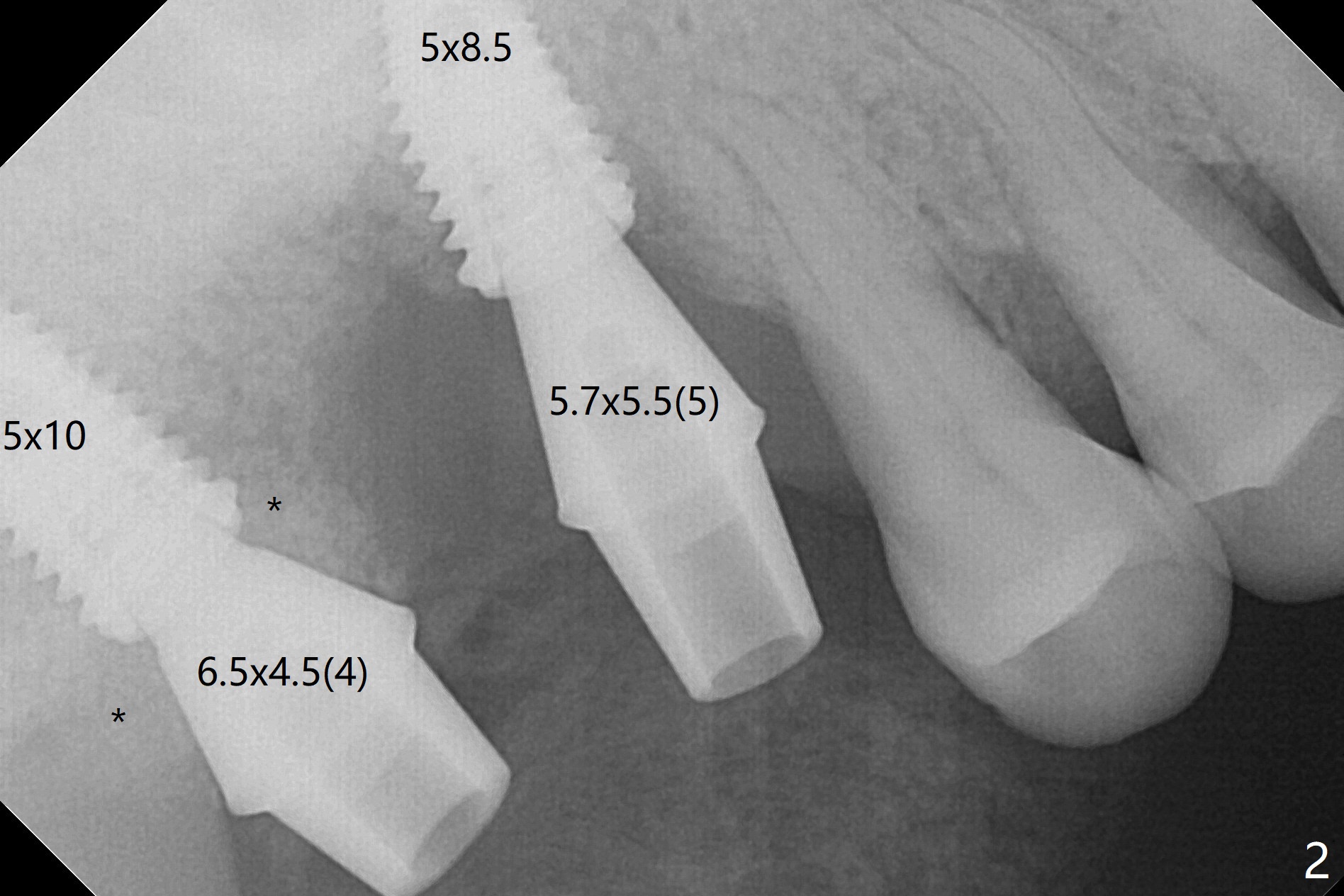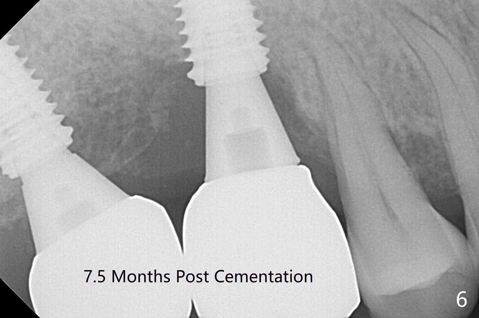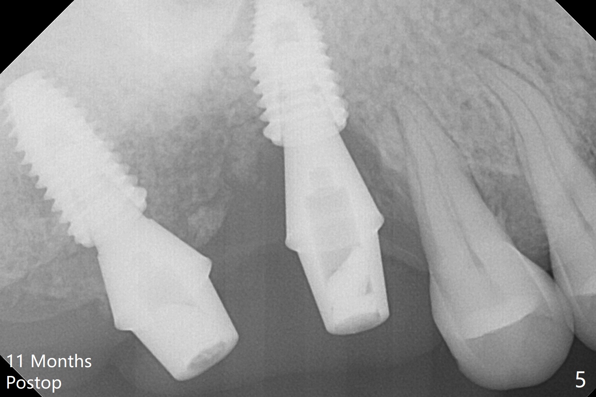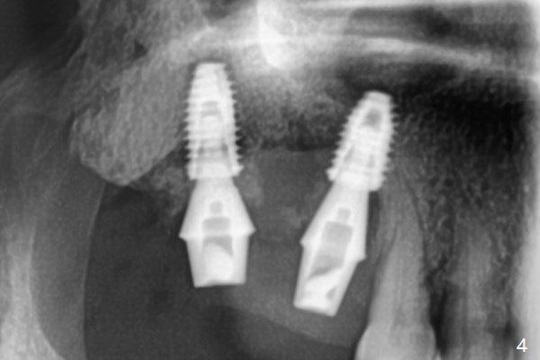 After use of 2.2 mm IS drill, DIO parallel pins are unstable at #2 and 3, partially due to shallow osteotomy. PA is not taken with parallel pins. When dummy implants are placed, the axis at #3 is noted; but instead of moving the apical end of the osteotomy distal (Fig.1 red line), the coronal end is moved mesial. By the time definitive implants and abutments are placed, the axis of #3 is parallel to that of #4, but close to each other (Fig.2,3). Orthogonal panoramic X-ray shows that they are critically close (Fig.4). If PA were taken with parallel pins after initial osteotomy, correction would be easy. The patient is doing fine postop without pain or nasal hemorrhage. There is no thread exposure 11 months postop (Fig.5). The abutment screw at #3 is retightened 7.5 months post cementation (Fig.6 (poor crown/implant ratio)).