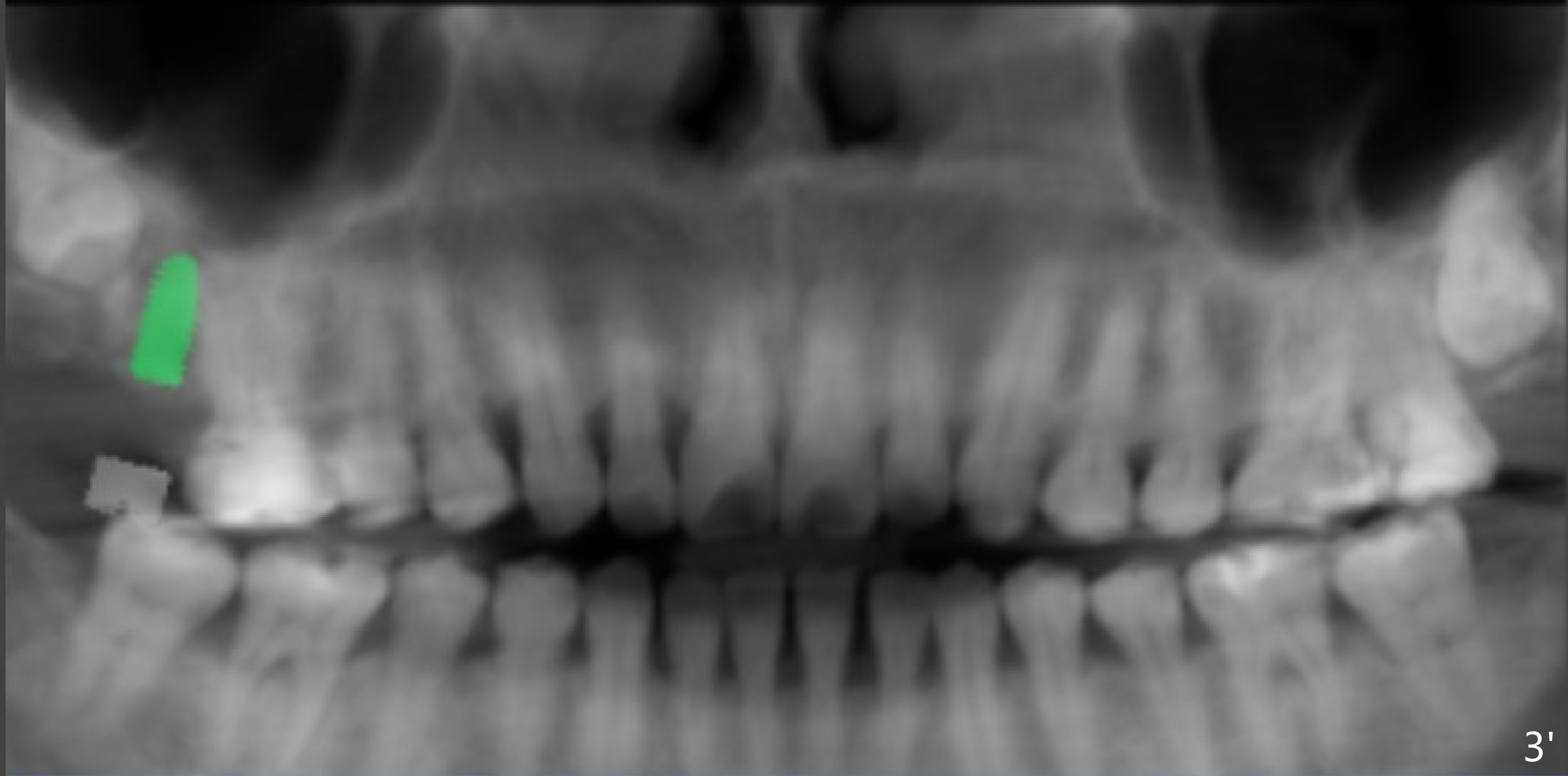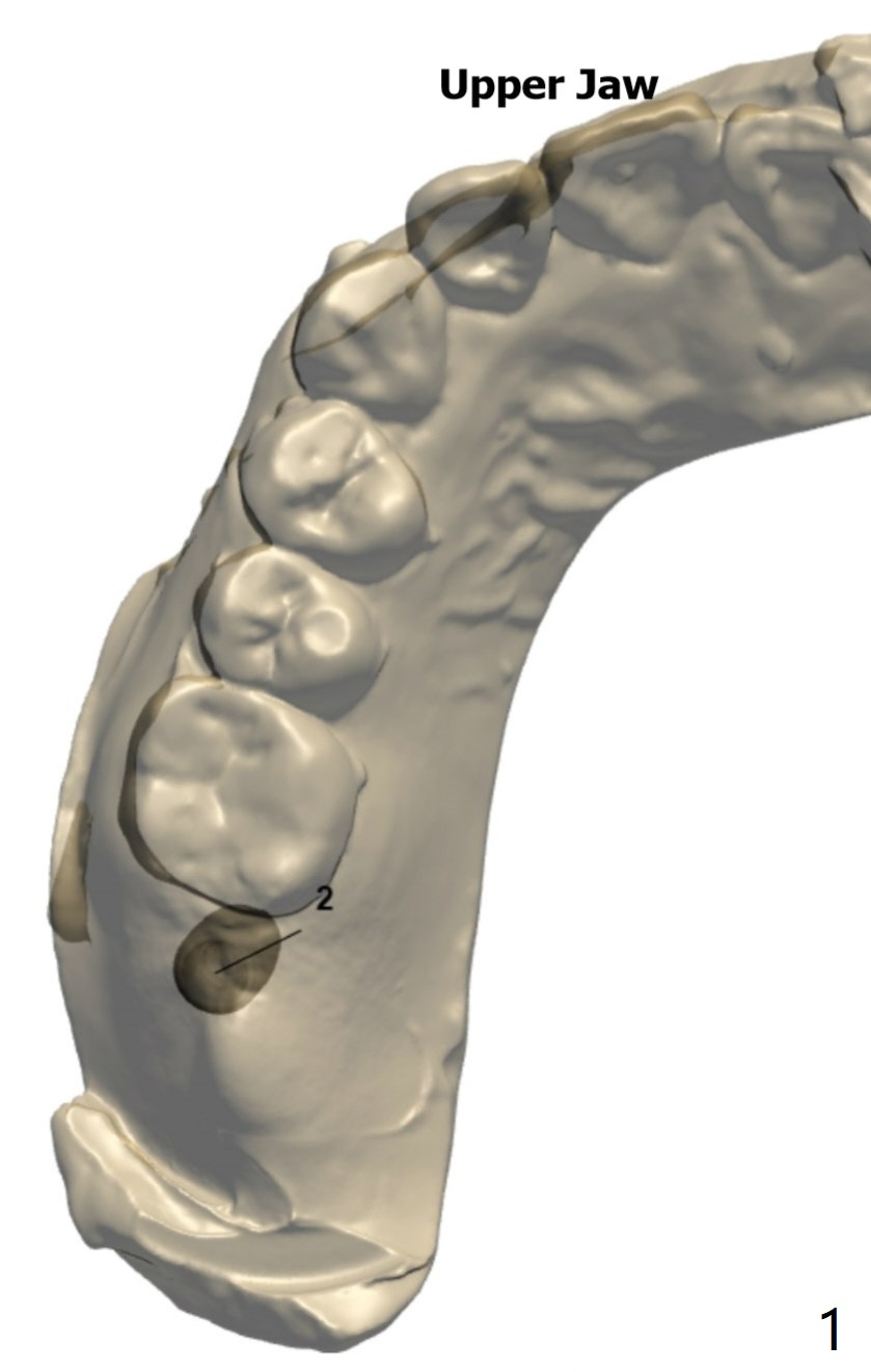 A 40-year-old woman requests implant at #2 without removing the impacted 3rd molar (1 year 4 months post socket preservation). In order to do that, the implant should be tilted distal coronally. To reduce screw loosening, use UF implant.