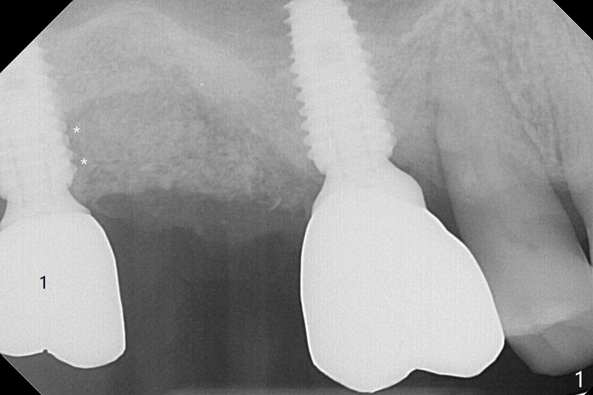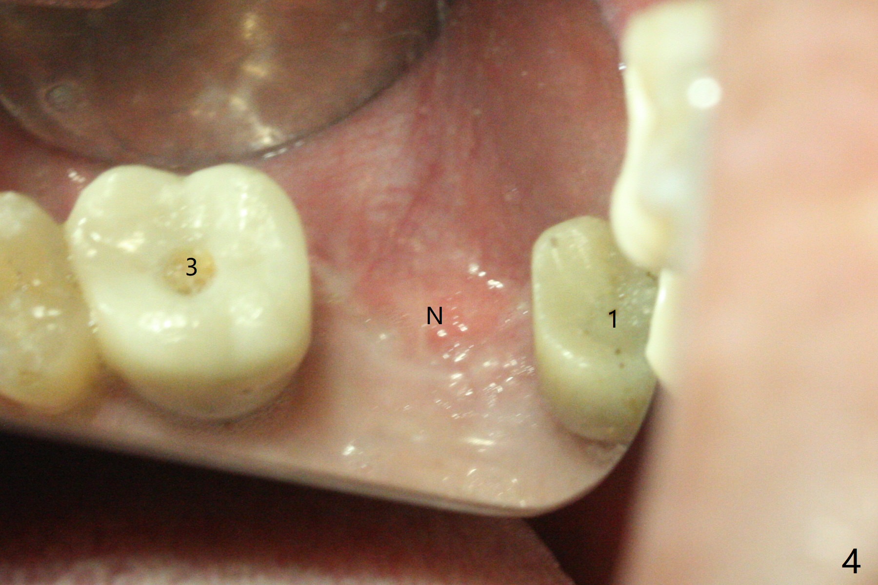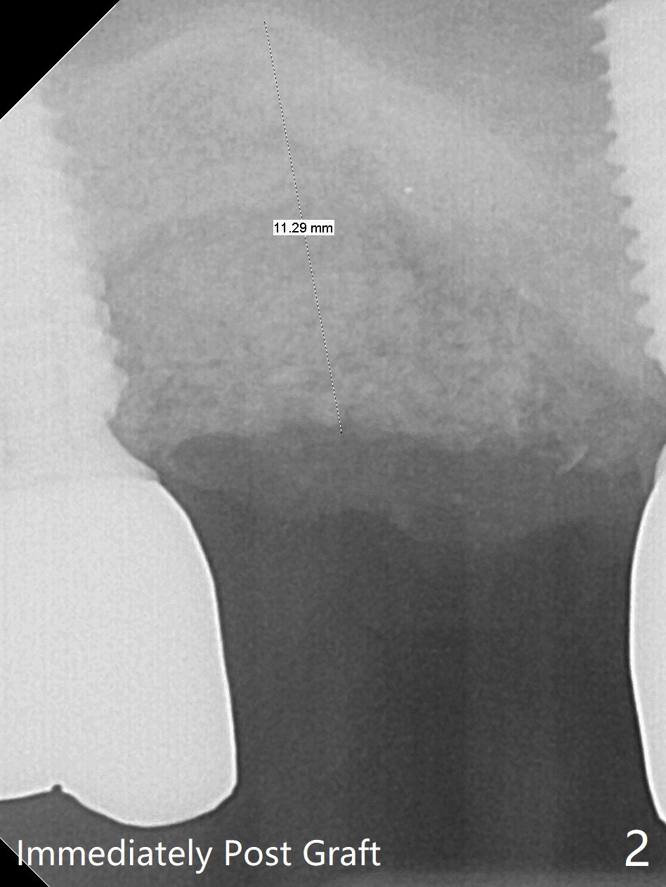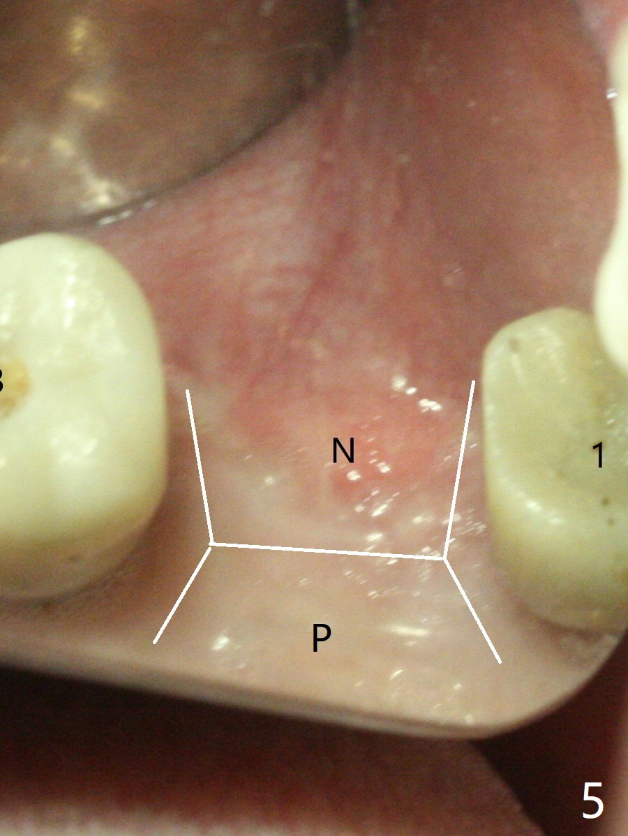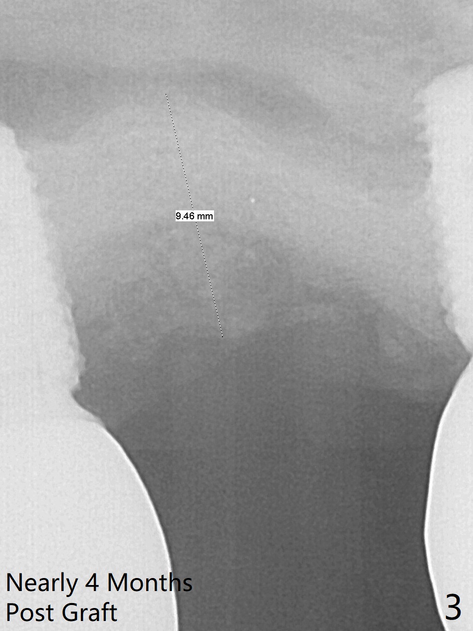 Removal of the implant at #2 is extremely difficult because of fusion of the abutment with the implant. Buccal and palatal incisions are made to remove the bone buccomesiodistal to the implant. After implant removal, the exposed mesial coronal implant threads at #1 are cleaned with Titanium brush; allograft is placed against the exposed threads (Fig.1 *), followed by 2 pieces of PRF membrane and 6-month collagen membrane. Periodontal dressing is applied after suturing. Partially due to traumatic implant removal and partially due to easy and repeated loss of periodontal dressing, bone height reduces nearly 4 months postop (compare Fig.2,3). More discouraging is the invasion of loose nonkeratinized buccal gingiva into the healed socket nearly 4 months post graft (Fig.4 N). Tissue punch thorough a guide should expose the implant site to the nonkeratinized tissue. Can we fabricate a guide with buccal clearance underneath so that a flap can be raised buccally, i.e., to push the palatal keratinized tissue buccally?