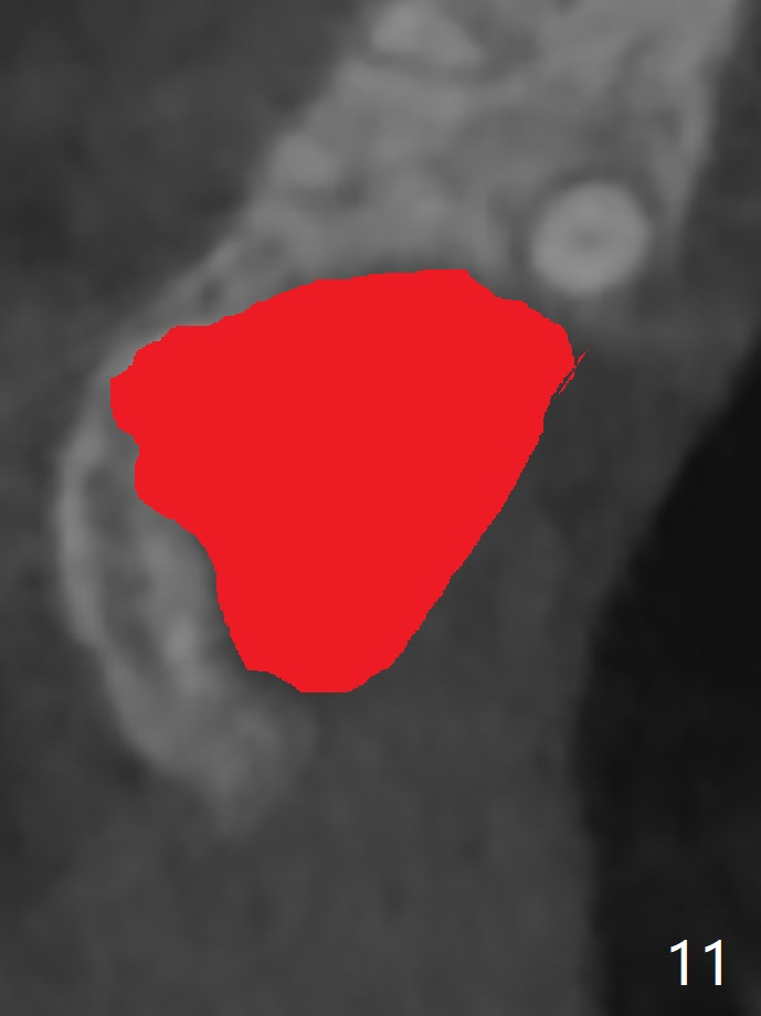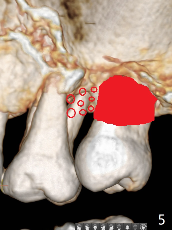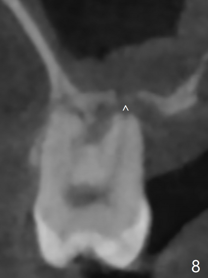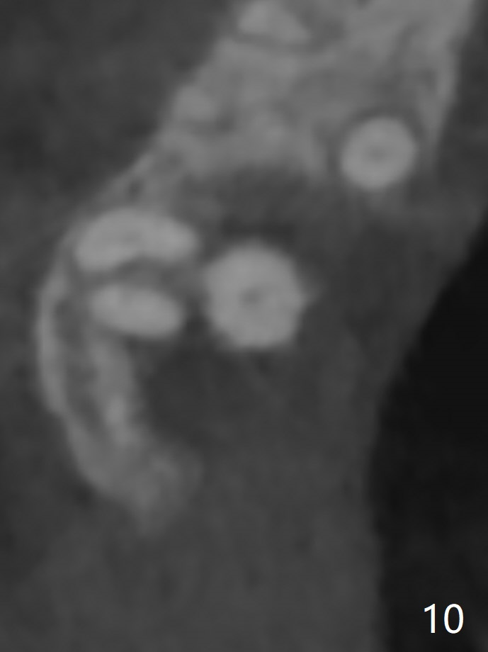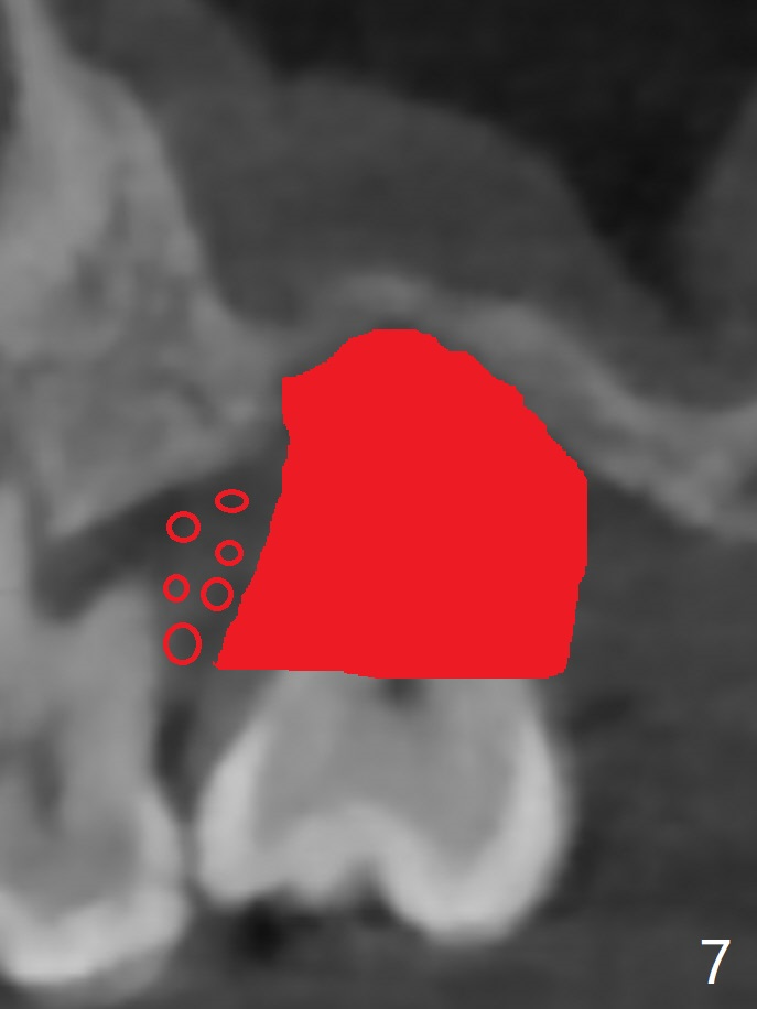 45岁女右上7严重骨质吸收终于开始出现症状(图一),虽然邻牙(6)骨质吸收也明显(图二,四,六,八,十),但是保留它,远中颊侧(DB),腭侧(P)根成为骨粉(图三,五,七,九,十一:红圆圈)支架。