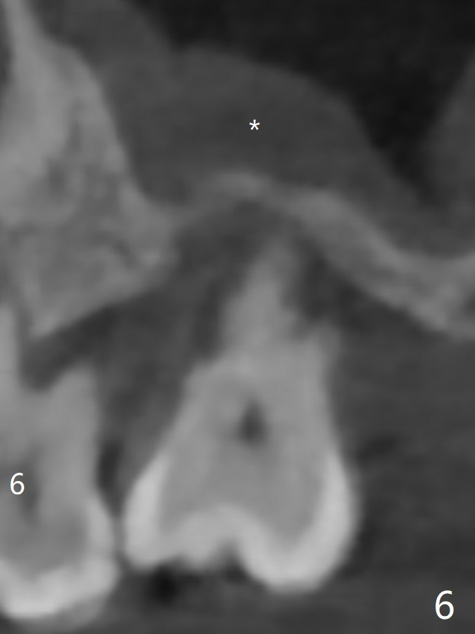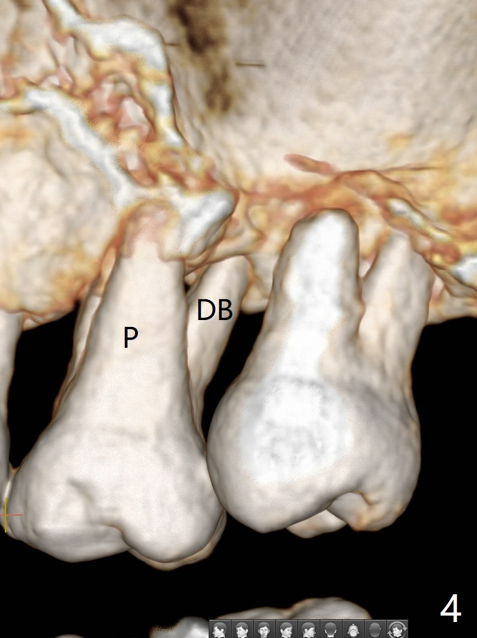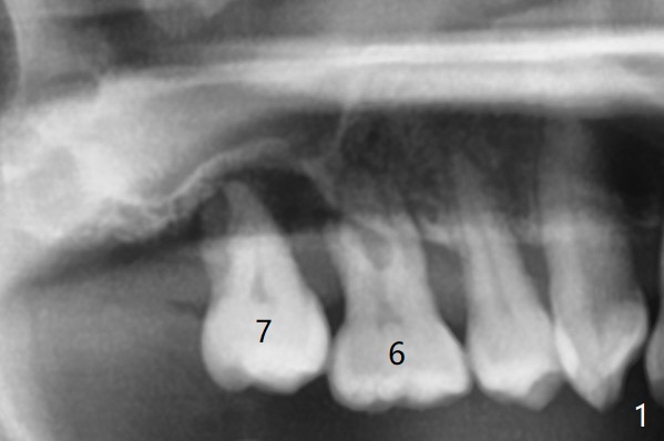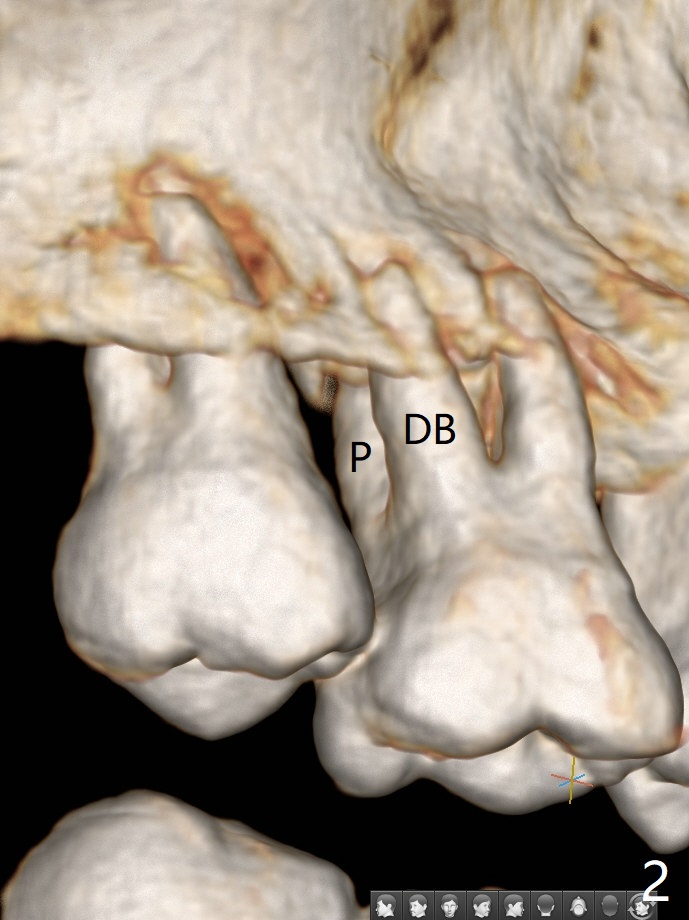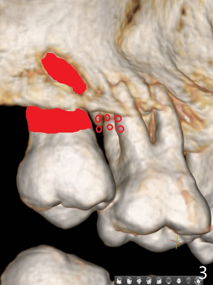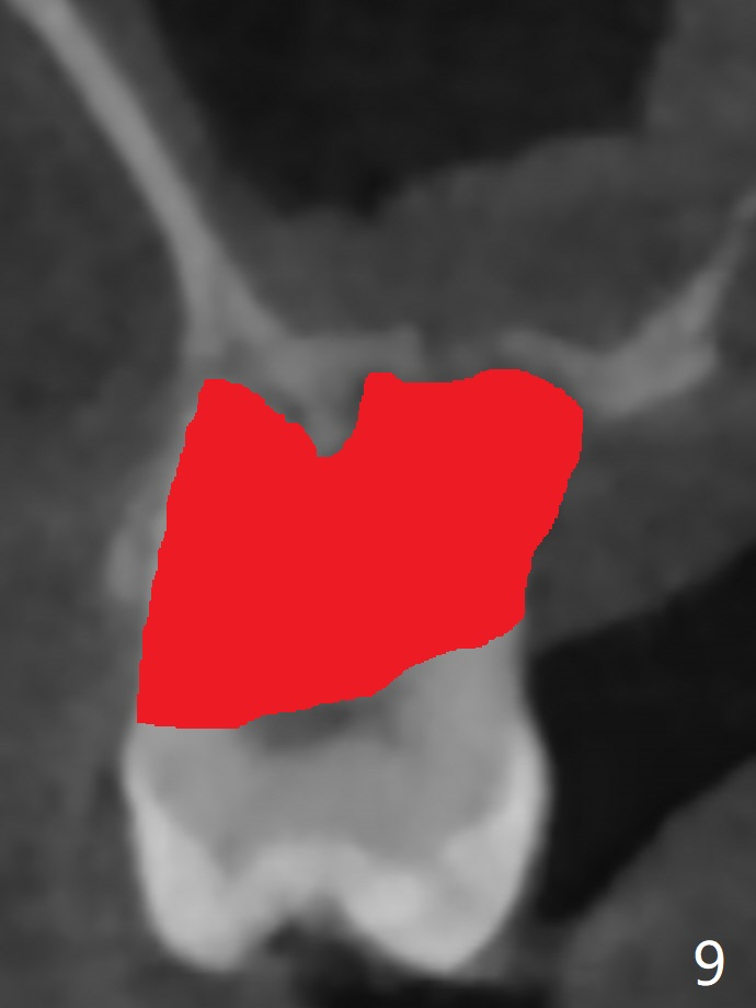 45岁女右上7严重骨质吸收终于开始出现症状(图一),虽然邻牙(6)骨质吸收也明显(图二,四,六,八,十),但是保留它,远中颊侧(DB),腭侧(P)根成为骨粉(图三,五,七,九,十一:红圆圈)支架。