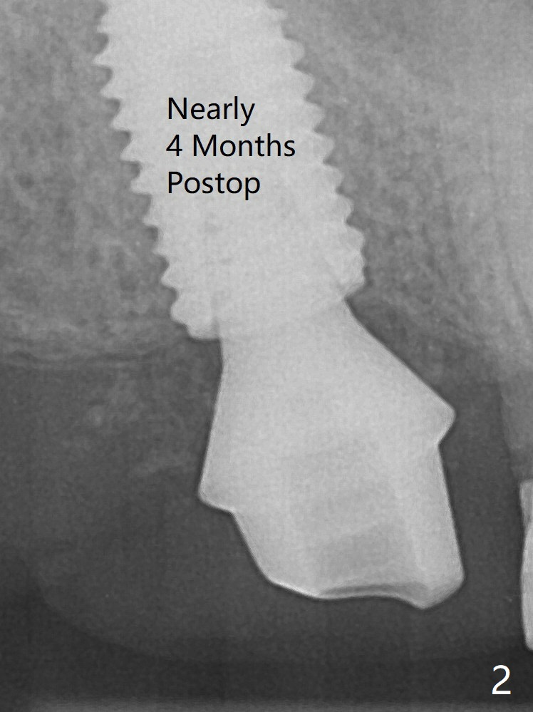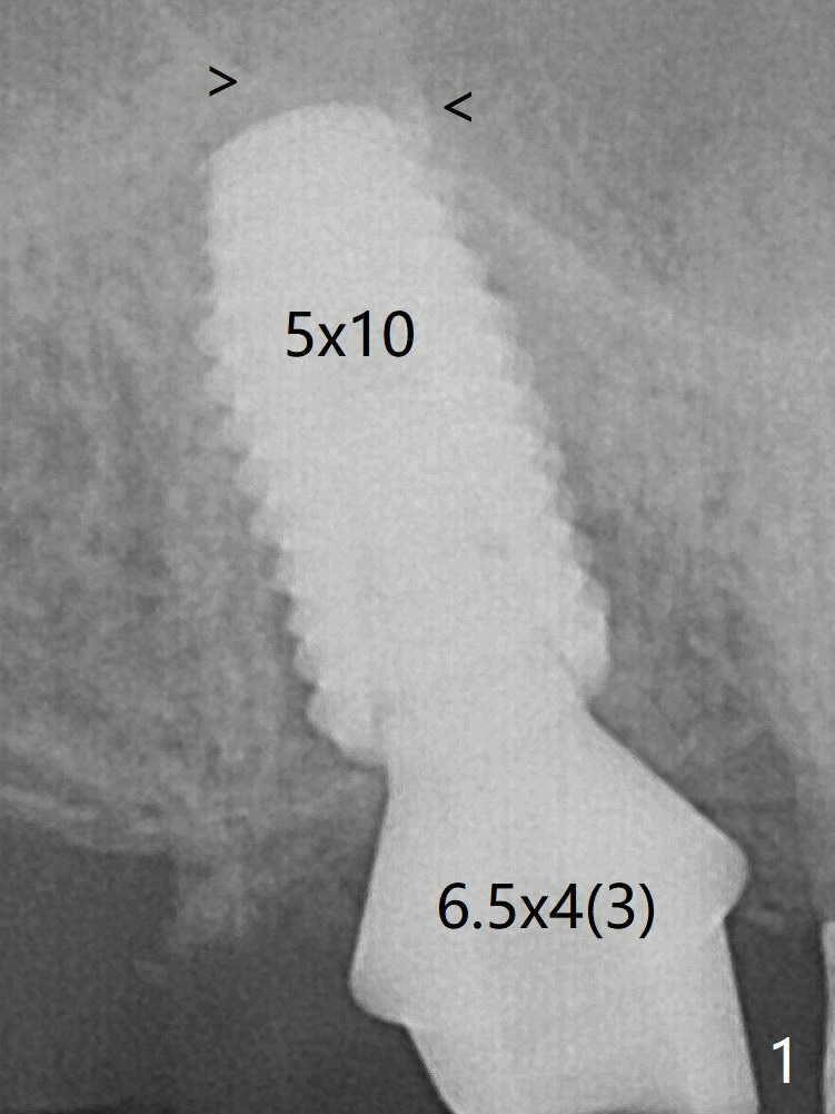 There is small scale of break of the sinus floor (Fig.1 arrowheads) when the implant is placed. No treatment is rendered for the mucocele. The implant heals without tenderness over the anterior sinus wall nearly 4 months postop (Fig.2), but the abutment is loose with unhealthy gingival cuff. It is difficult to reseat the abutment, probably due to contact with the mesial crest. A 6.8x7 mm healing abutment is placed. A 5.2x4(4) mm cemented abutment is placed before impression. A crown is cemented 6 months postop (Fig.3); there is no gap between the abutment and implant, as compared to Fig.1,2 (+ gap). In fact the abutment is incompletely seated (Fig.5: <). Bone profile drill should be used to trim the mesial crest before reseating crown/abutment.
